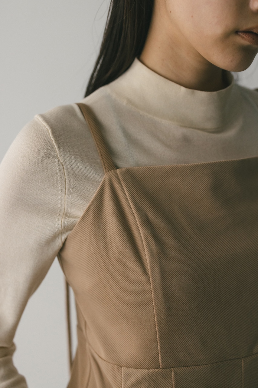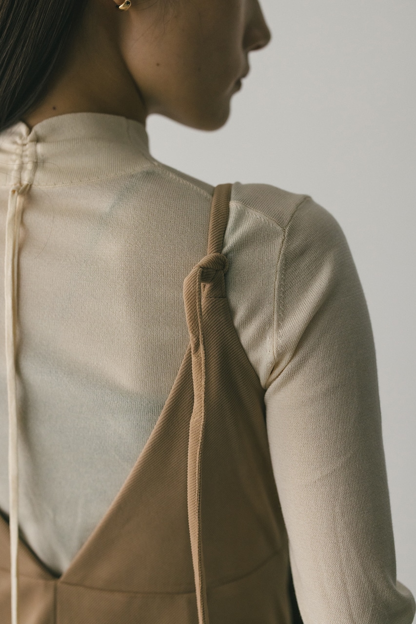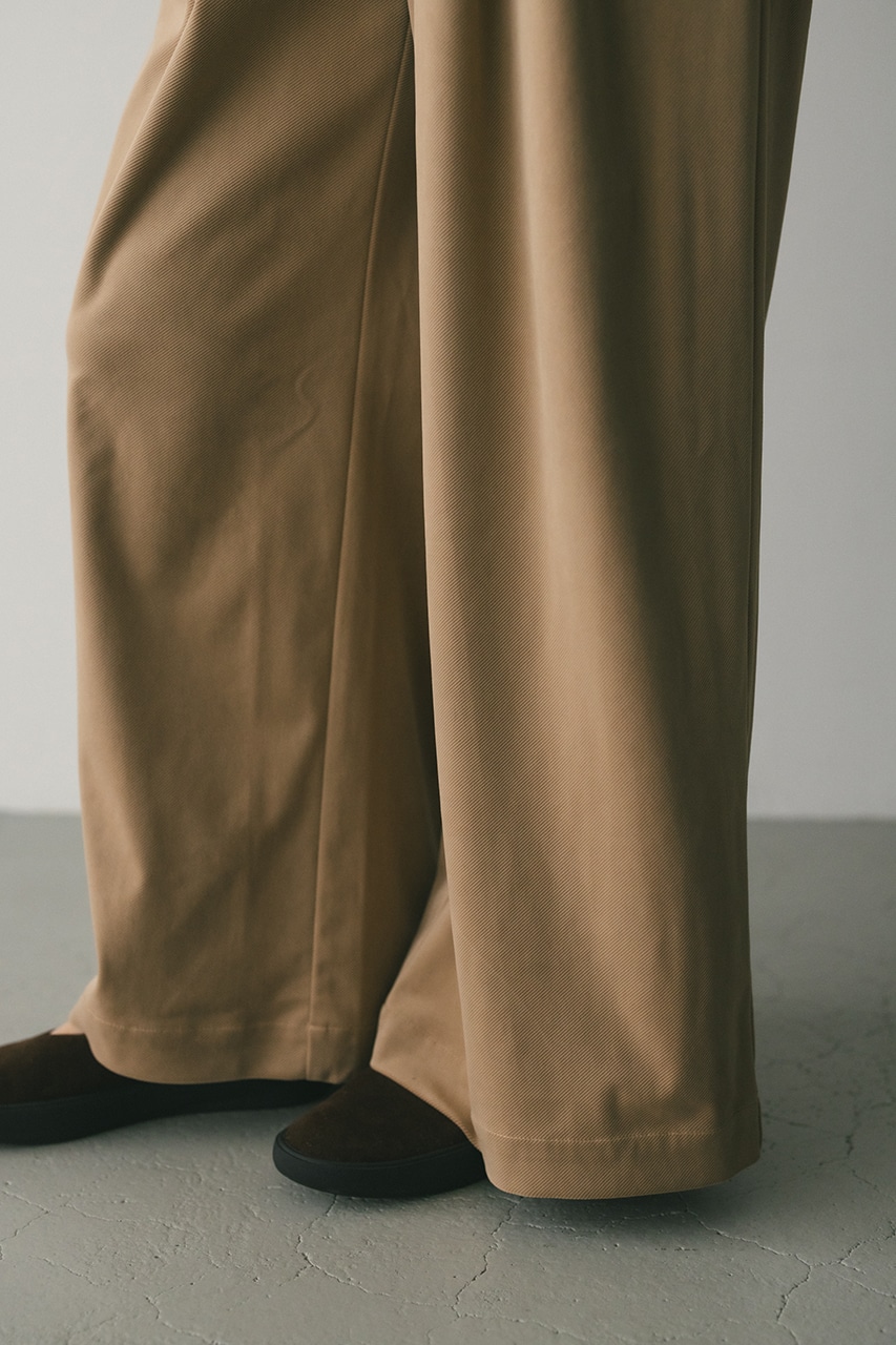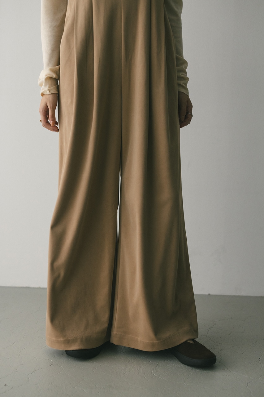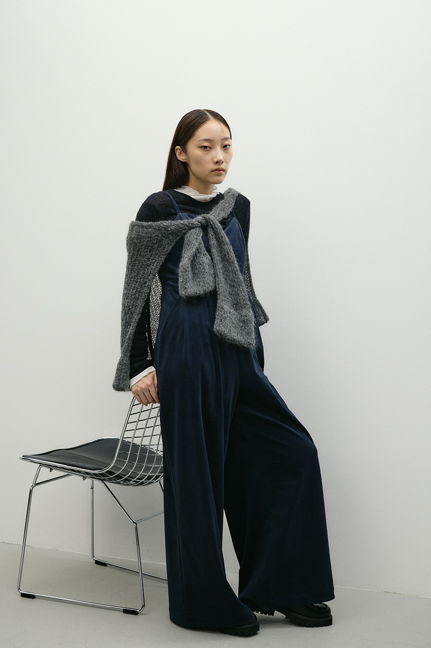 光沢感のあるベロア生地を使用したキャミロンパース。ワイドシルエットに深めのタックを入れることで、縦のラインを強調し、脚長効果を演出します。程よく落ち感のあるベロアが身体のラインを拾いすぎず、リラクシーながらも上品な印象に。インナーを合わせればシーズンレスで活躍し、Tシャツでカジュアルに、ニットやシャツでモードにアレンジできる万能アイテム。華やかさと抜け感を兼ね備え、特別なシーンから日常まで幅広く着回せます。ストレッチなし、透け感なし。