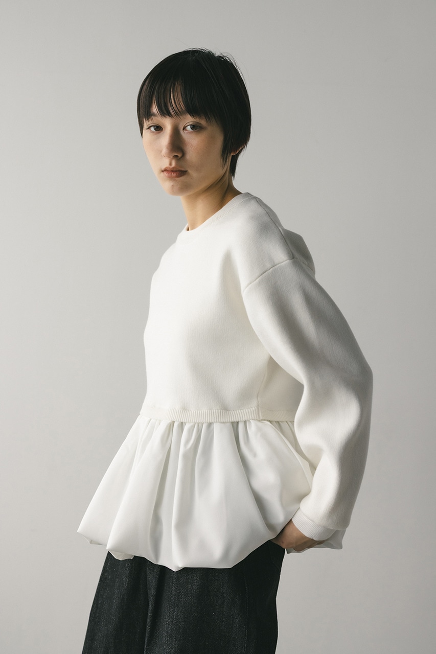 裾にシャツ生地をドッキングし、バルーンシルエットに仕上げたデザインニット。異素材の組み合わせがメリハリをプラスし、一枚でレイヤードしたような着こなしを演出します。ニットの柔らかな表情と布帛のハリ感がバランスよく調和し、シンプルなスタイリングにも新鮮さをプラス。コンパクトな丈感でボトムを選ばず、パンツやスカートに合わせてもバランスよく決まります。コーディネートに立体感を与えてくれる存在感のあるアイテムです。ストレッチあり(ニット部分)、透け感なし。