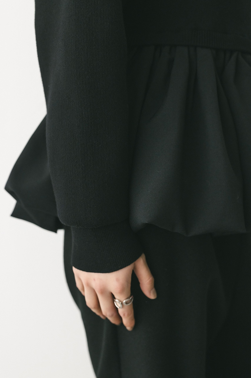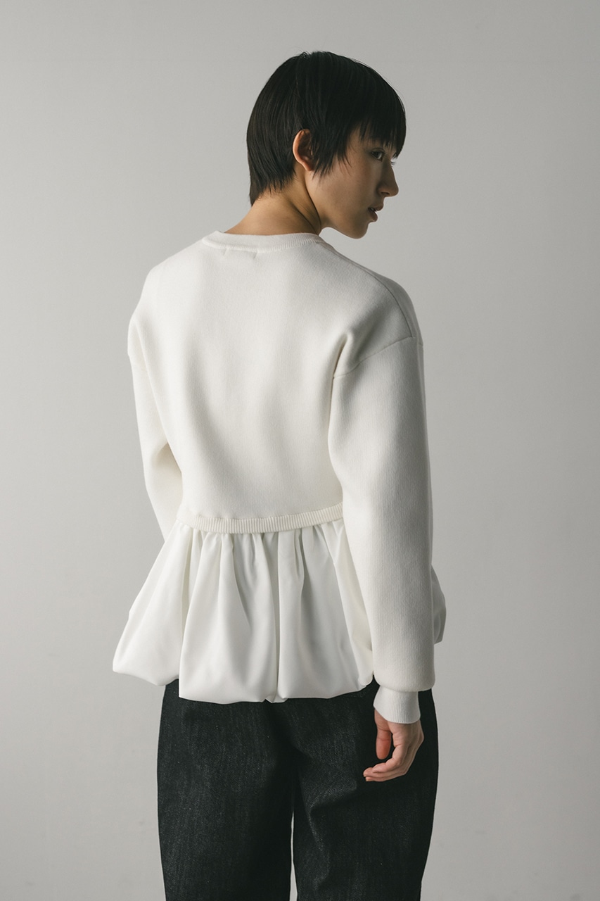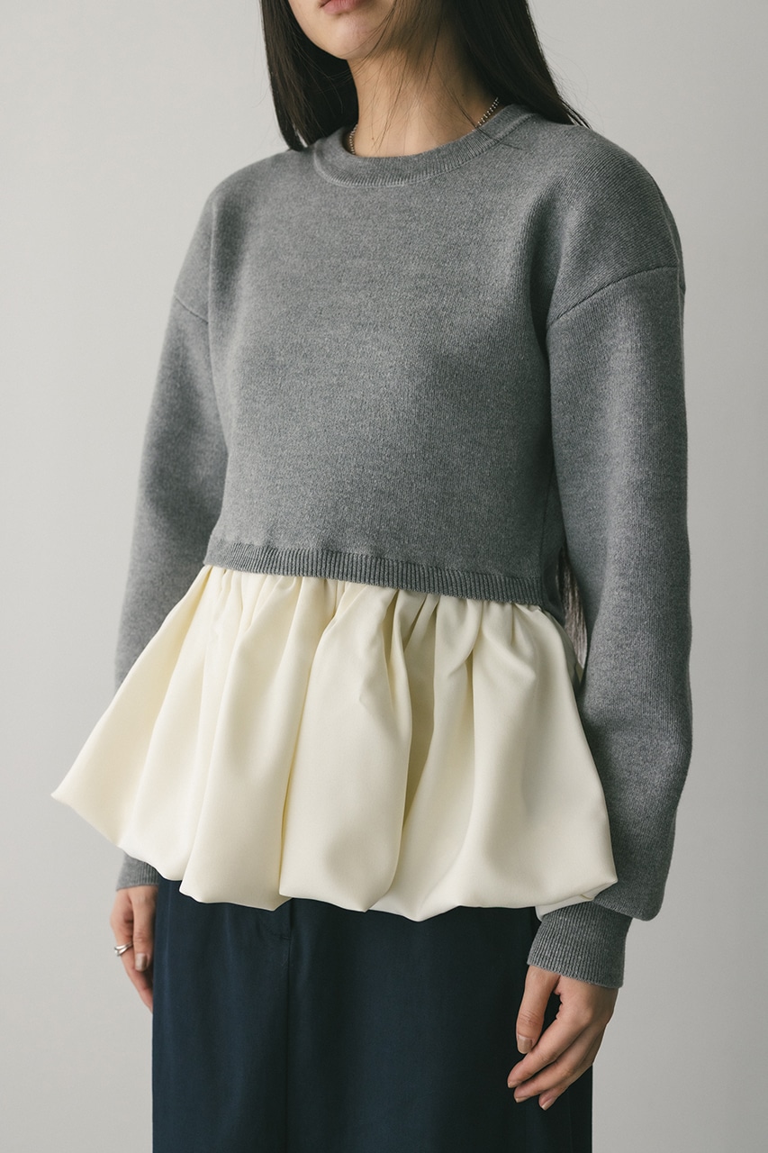 裾にシャツ生地をドッキングし、バルーンシルエットに仕上げたデザインニット。異素材の組み合わせがメリハリをプラスし、一枚でレイヤードしたような着こなしを演出します。ニットの柔らかな表情と布帛のハリ感がバランスよく調和し、シンプルなスタイリングにも新鮮さをプラス。コンパクトな丈感でボトムを選ばず、パンツやスカートに合わせてもバランスよく決まります。コーディネートに立体感を与えてくれる存在感のあるアイテムです。ストレッチあり(ニット部分)、透け感なし。