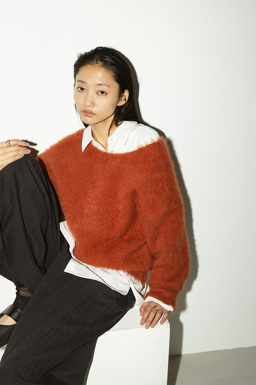 前後2WAYで着用できるシャギーニット。一枚で華やかな印象に導く主役ニットです。程よく厚みが出るよう、ダブルフェイスで仕上げているのでシルエットを綺麗に保つことができます。肌に触れる部分はシャギーではなく、肌触りの良い糸を使用しているので着心地もよい一枚です。ストレッチあり、透け感なし。