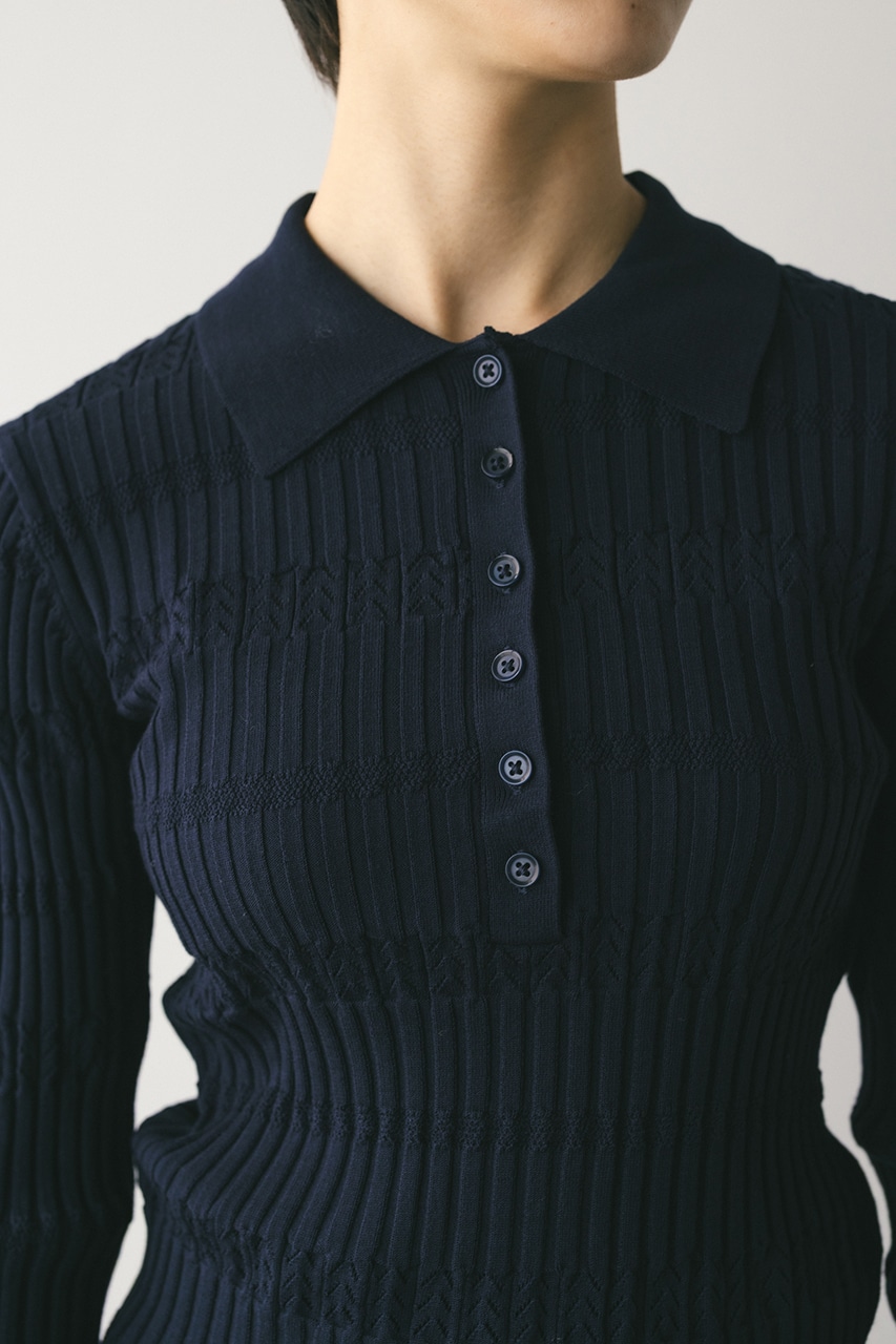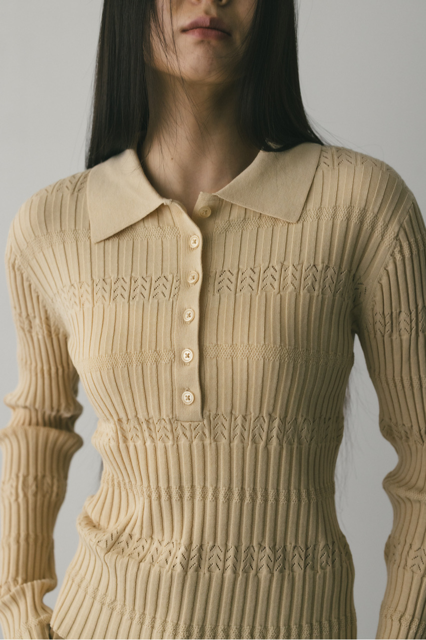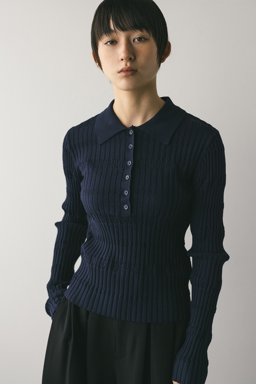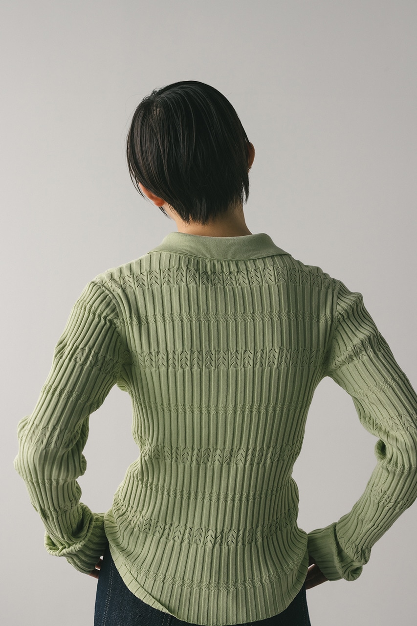 アイレット編みのリブが可愛いニットポロ。すっきりとしたリブの縦ラインがシルエットをきれいに見せつつ、アイレットの抜け感が軽やかな印象に導きます。クラシックなポロデザインにニットの柔らかさを掛け合わせ、きれいめからカジュアルまで幅広いスタイリングが可能。ジャケットインやハイウエストボトムとの相性も良く、シーズンを通して着回せるアイテムです。ストレッチあり、透け感あり(アイレット部分)。