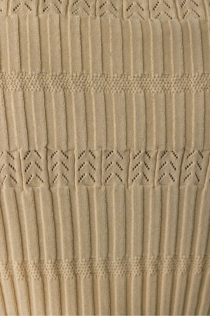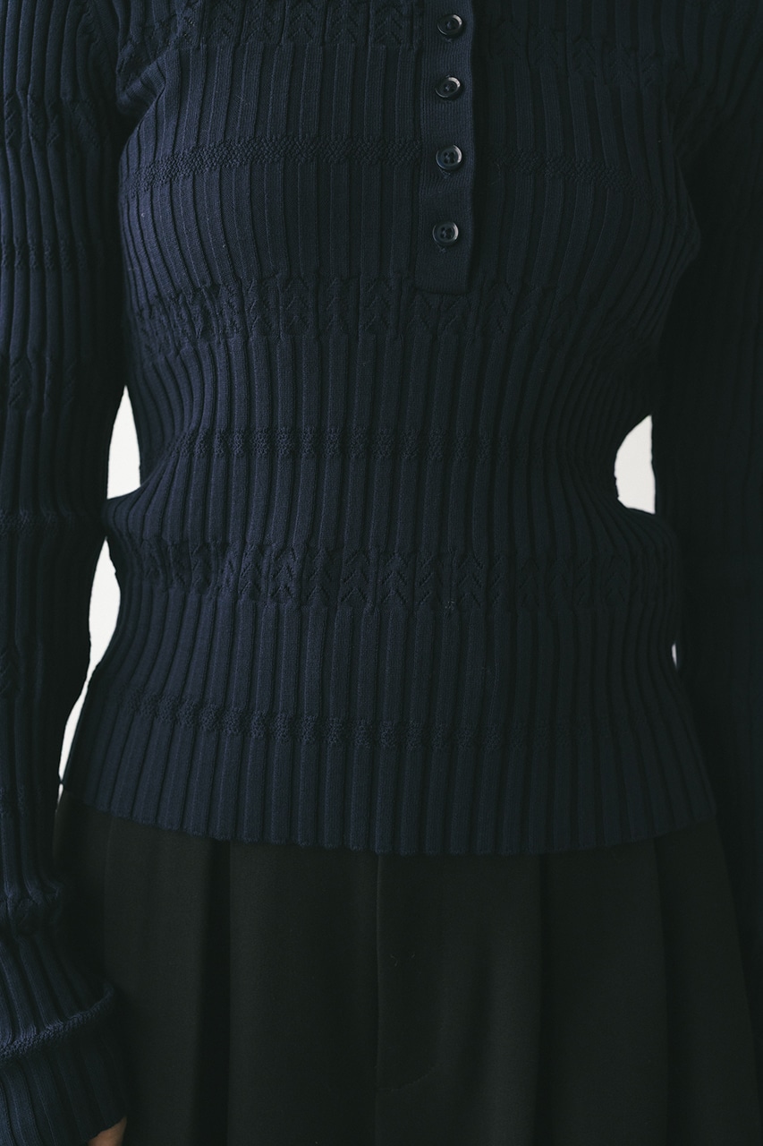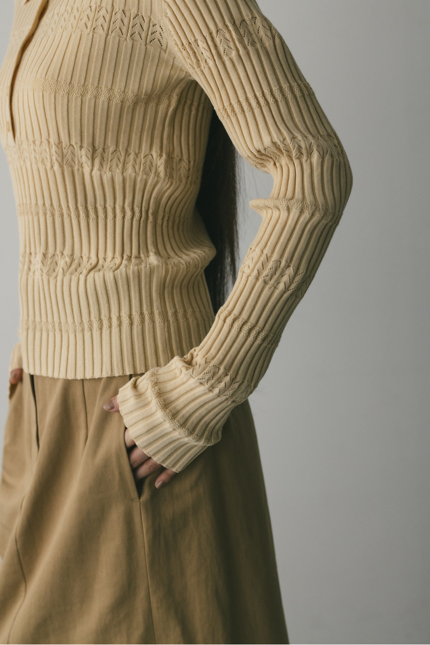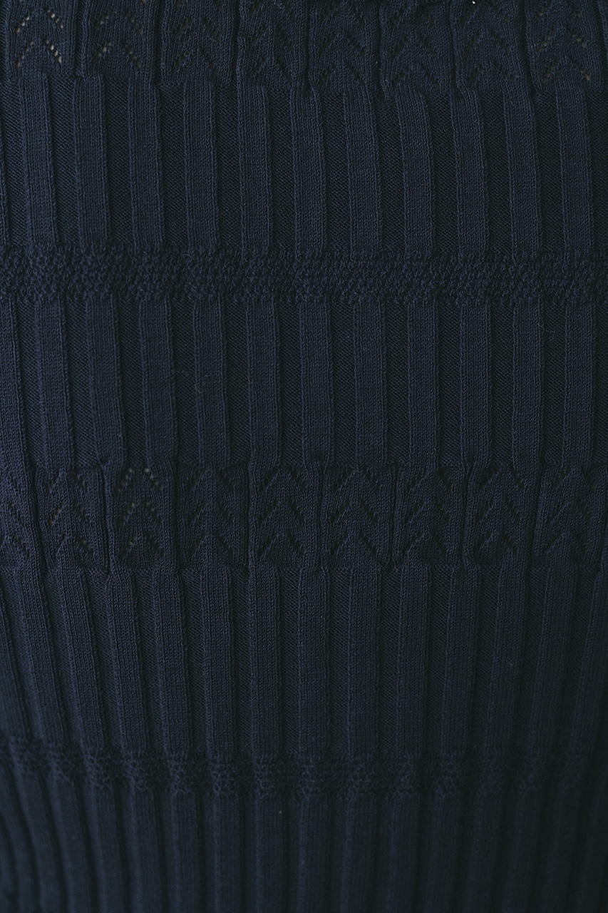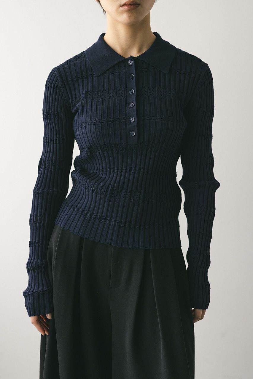 アイレット編みのリブが可愛いニットポロ。すっきりとしたリブの縦ラインがシルエットをきれいに見せつつ、アイレットの抜け感が軽やかな印象に導きます。クラシックなポロデザインにニットの柔らかさを掛け合わせ、きれいめからカジュアルまで幅広いスタイリングが可能。ジャケットインやハイウエストボトムとの相性も良く、シーズンを通して着回せるアイテムです。ストレッチあり、透け感あり(アイレット部分)。