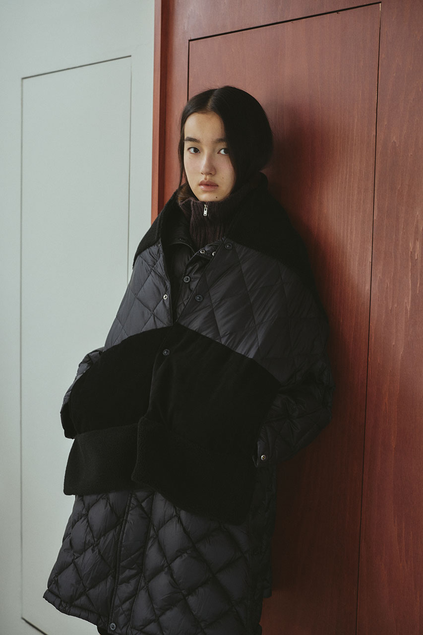 コーデュロイ、ナイロン、ボアの質感を楽しめる軽くて暖かいダウンマフラー。TAIONの機能性はそのままにスタミキらしいニュアンスのあるデザインに仕上げた一枚。裏側は身体馴染みの良い暖かいフリースを使用し、アウター代わりやダウンやコートの上から等、実用的かつおしゃれにスタイリングしていただけます。暖かいポケット裏フリース使用。