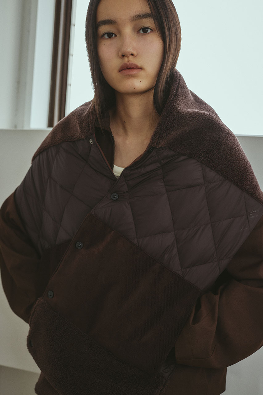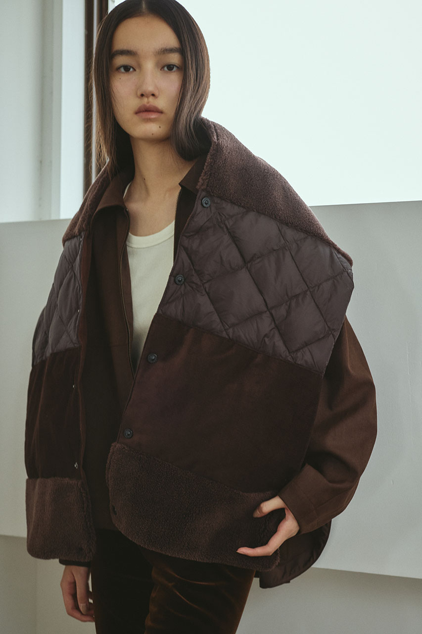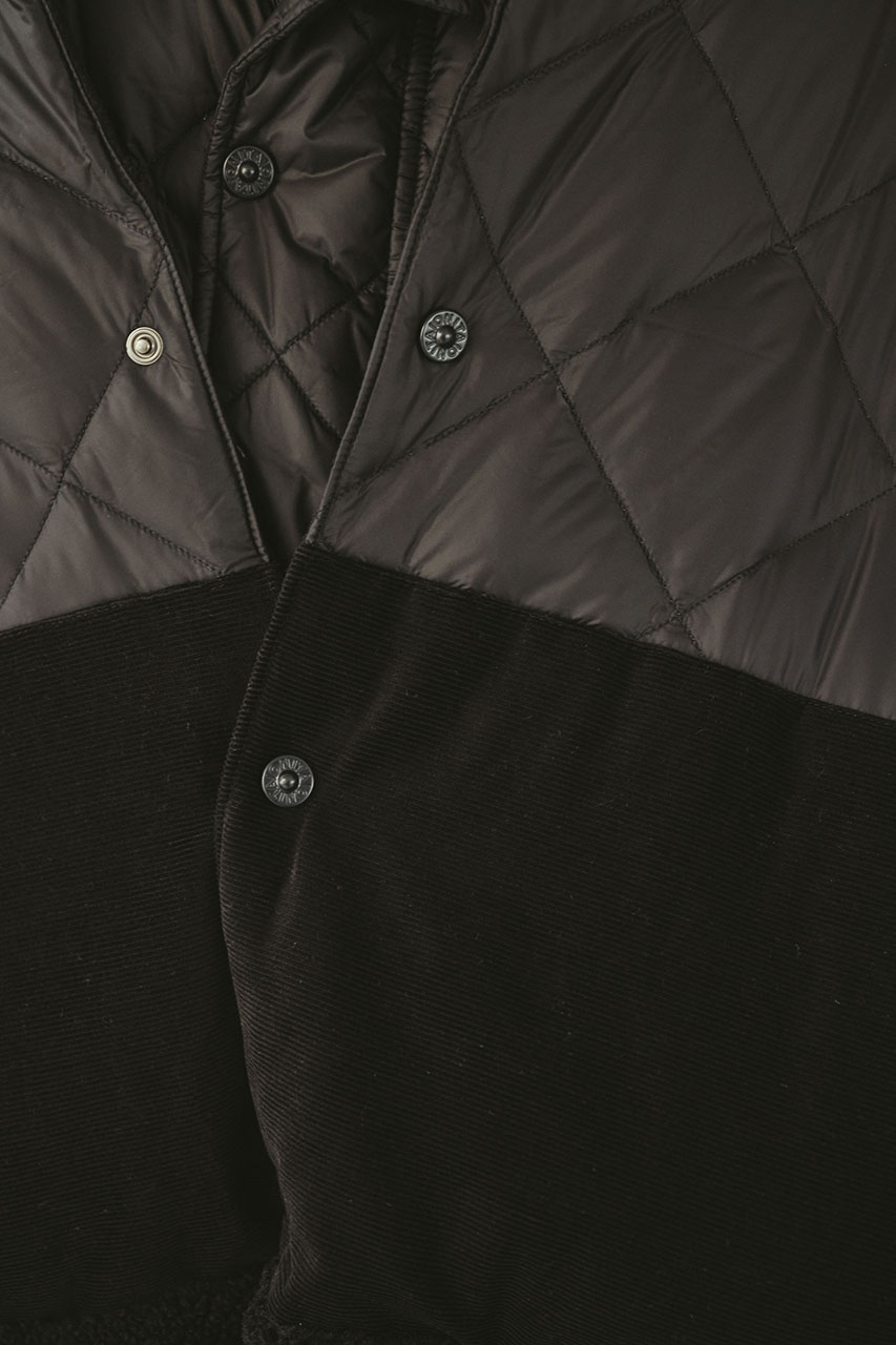 コーデュロイ、ナイロン、ボアの質感を楽しめる軽くて暖かいダウンマフラー。TAIONの機能性はそのままにスタミキらしいニュアンスのあるデザインに仕上げた一枚。裏側は身体馴染みの良い暖かいフリースを使用し、アウター代わりやダウンやコートの上から等、実用的かつおしゃれにスタイリングしていただけます。暖かいポケット裏フリース使用。