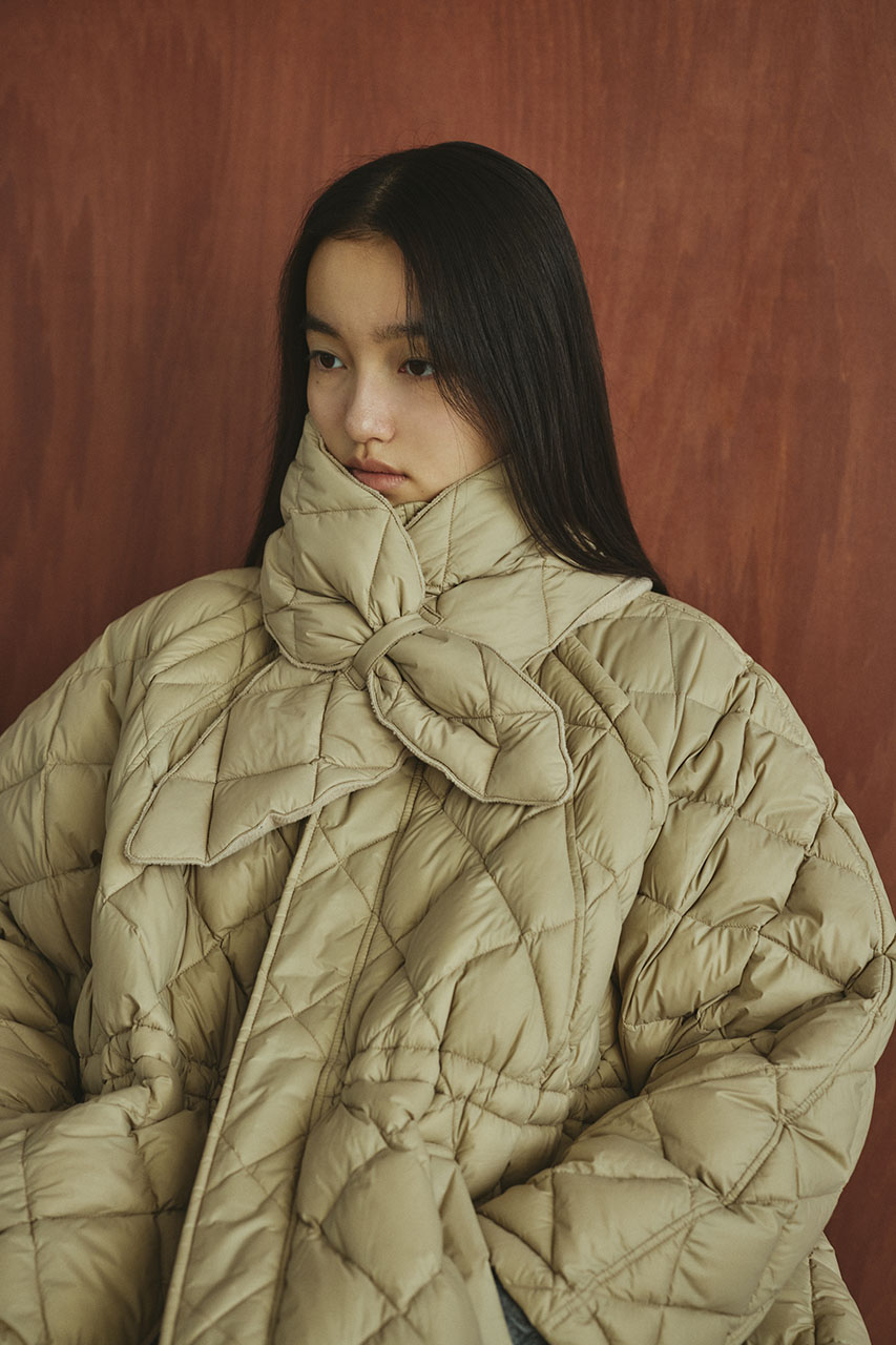 裏側に身体馴染みの良い暖かいフリースを使用したスカーフのようなデザインのダウンマフラー。さっと首に巻いたり、寒いときは耳元までフードのように使っていただけます。TAIONの機能性はそのままにスタミキらしいニュアンスのあるデザインに仕上げた一枚です。