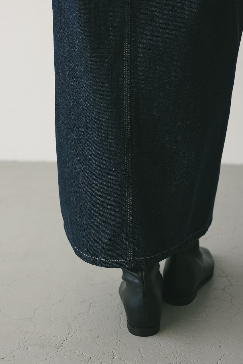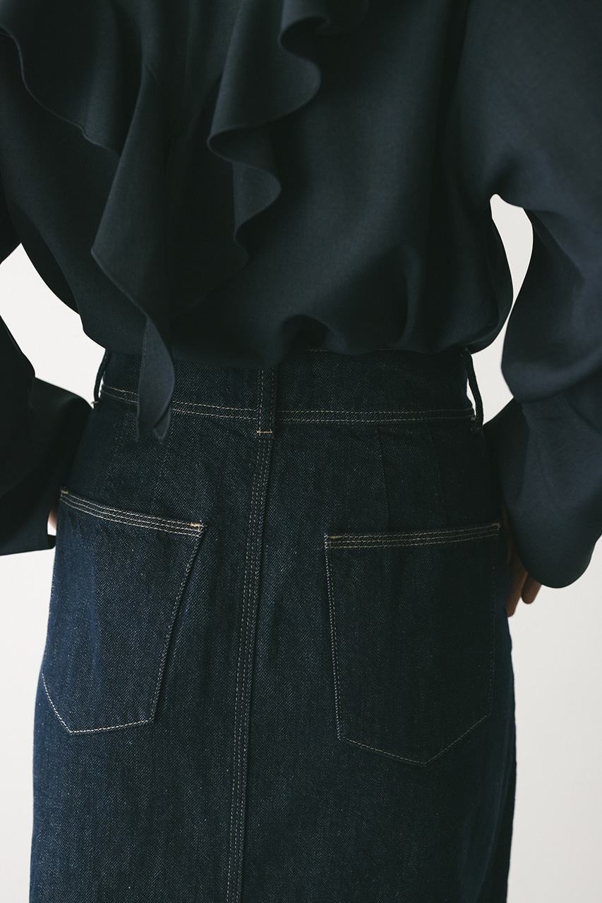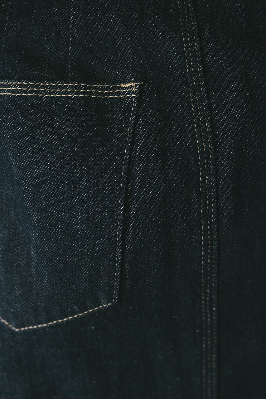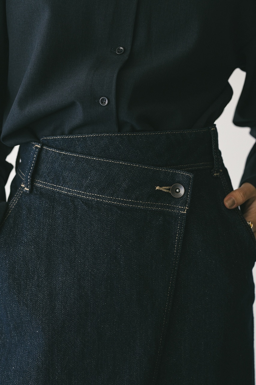 ウエストからのラップデティールがポイントのデニムスカート。ステッチデザインが映える一枚。歩く度に覗く裾スリットがスタイリングに抜け感をプラスしてくれます。フリンジディテールを施したカジュアルなアイボリーとワンウォッシュを加えたモードなインディゴの2色展開です。500ISS10-0841(デニムカバーオール)とセットアップ着用可能。透け感なし、ストレッチなし。