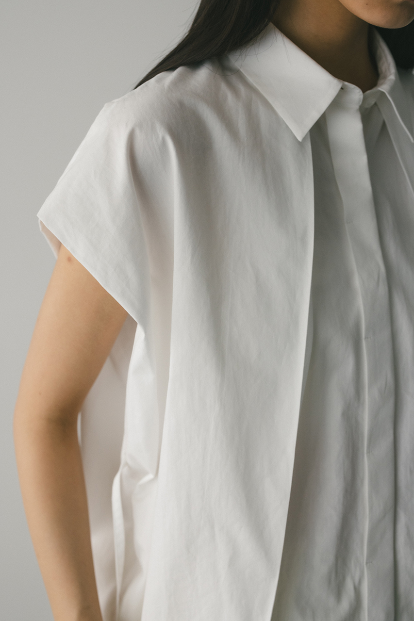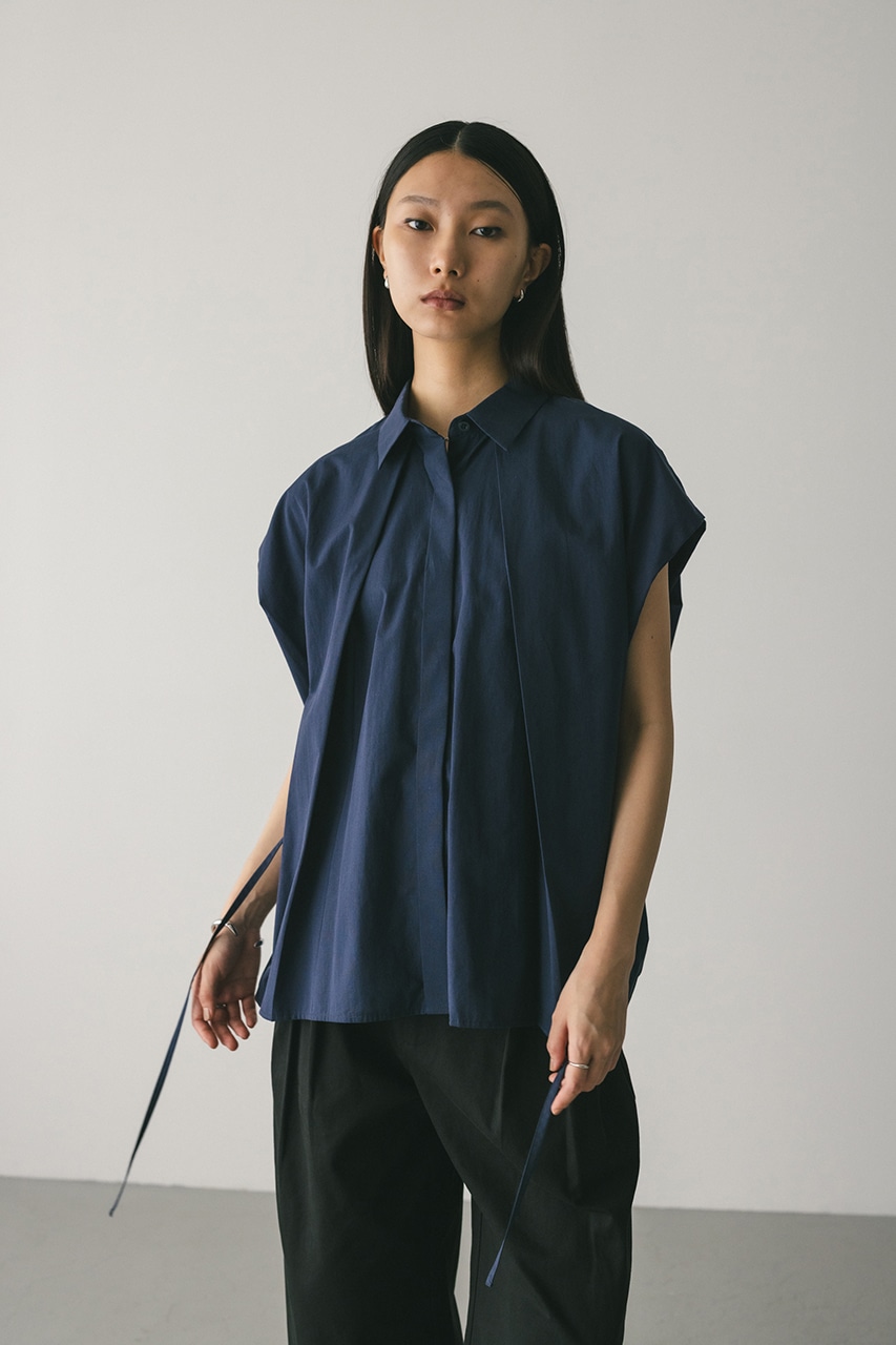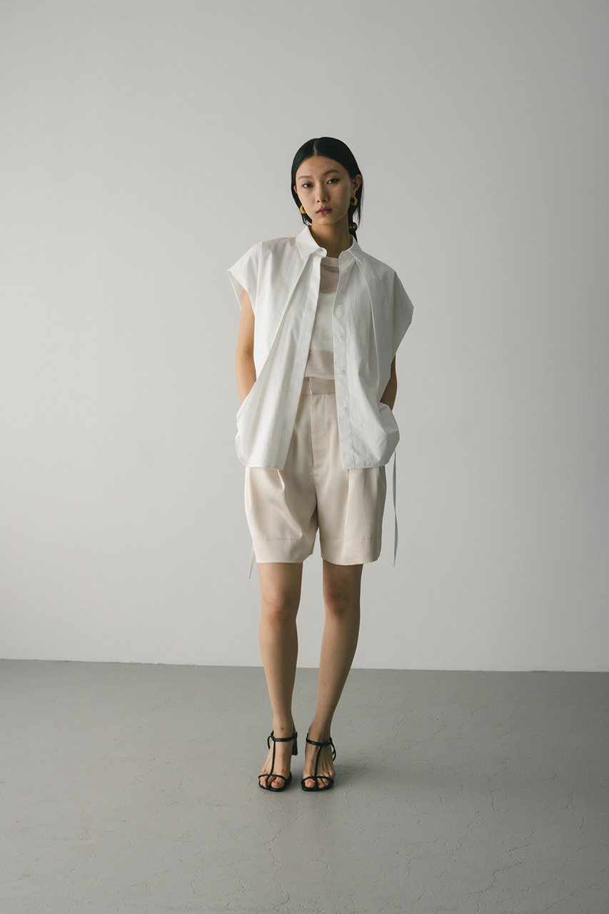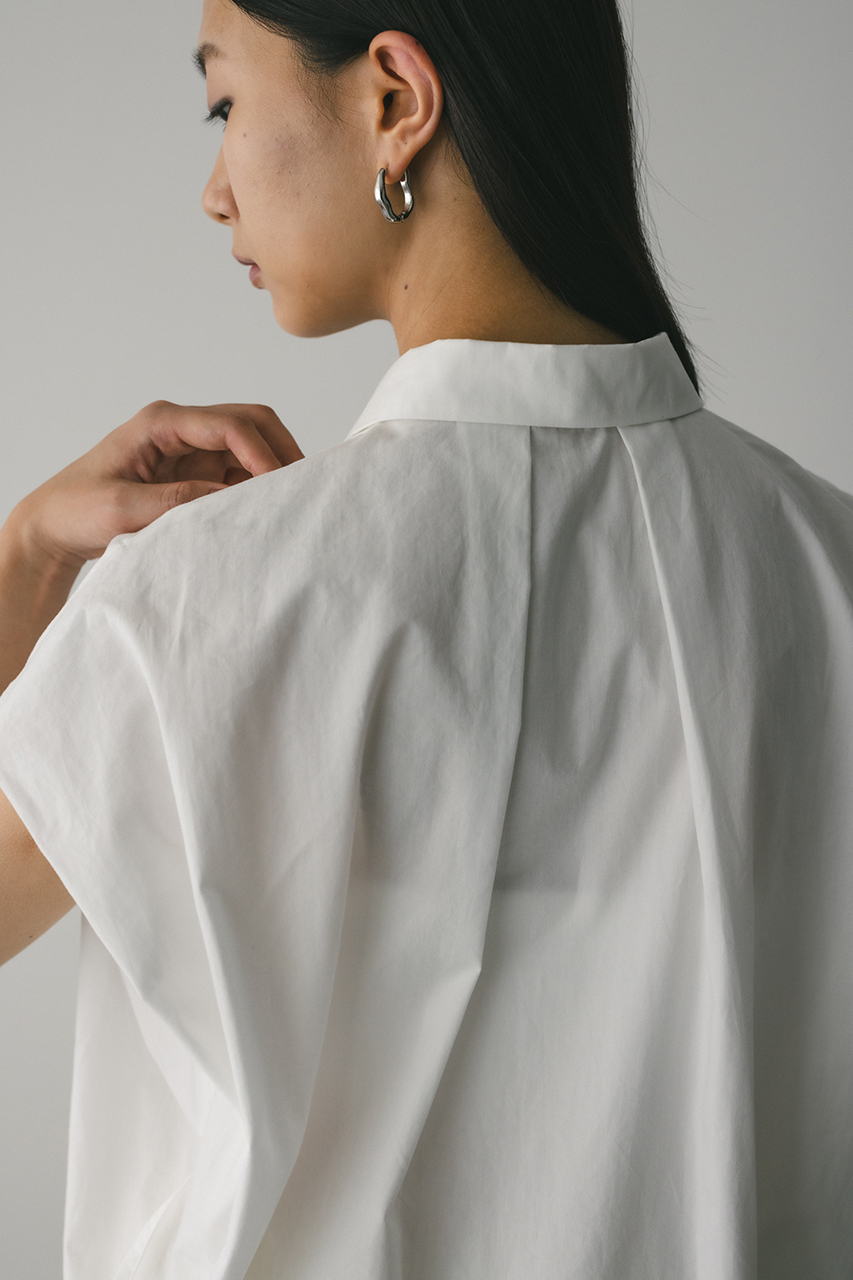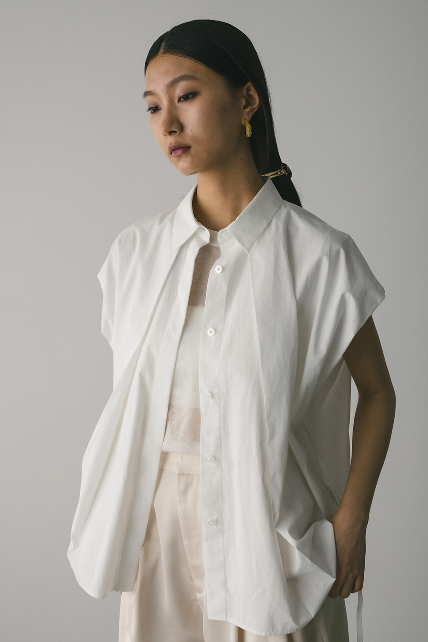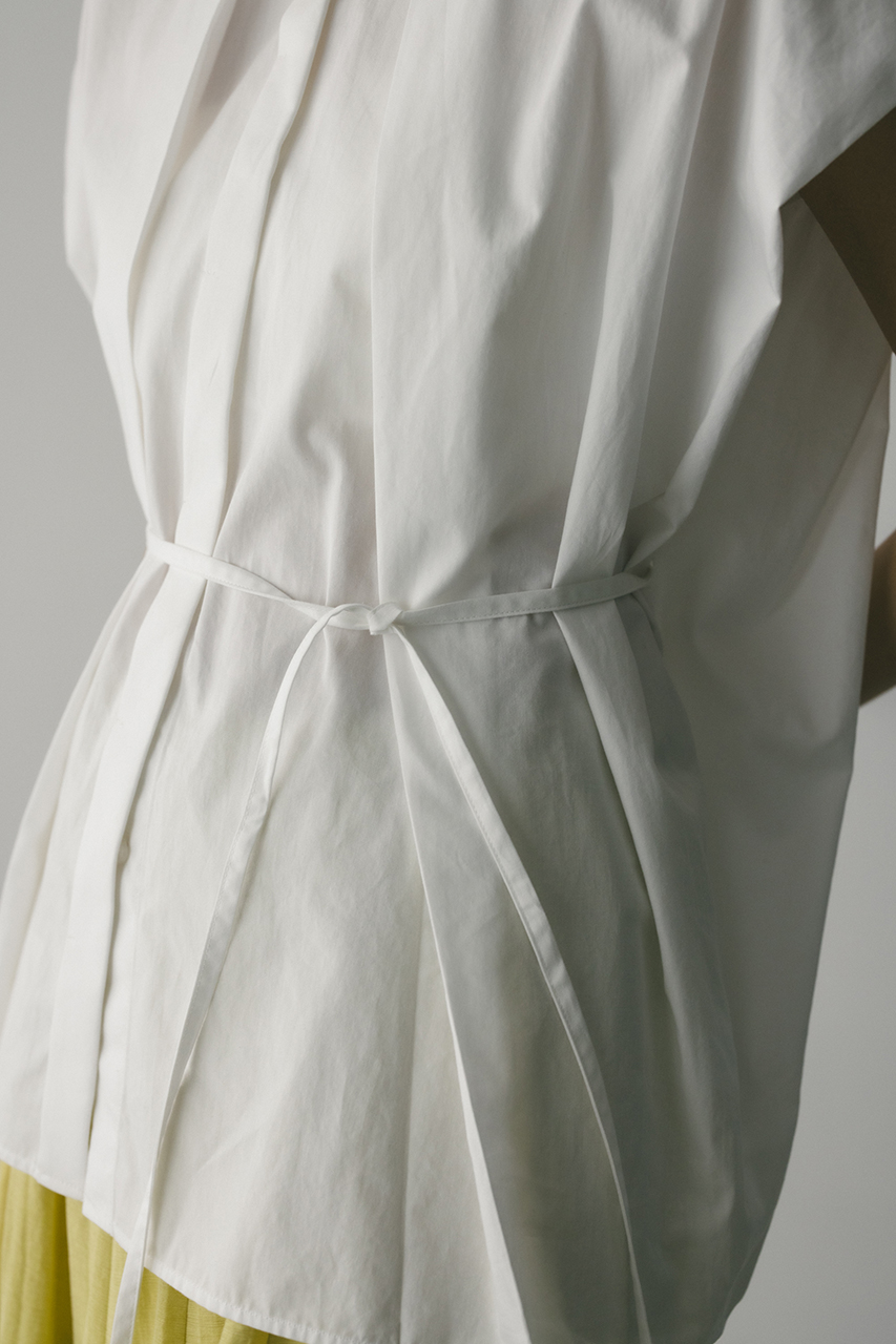オーバーショルダーとゆったりルーズな身幅、深いタックデザインで可愛いフォルムを作ってくれるオーバーシャツ。脇のスリットから紐を通して結んだり、チョーカー風に巻いたり、襟下で結んだりとアレンジを楽しんでいただけます。ヒップをカバーしてくれる丈でボトムスを選ばず着用頂けます。透け感WHTややあり、ストレッチなし。