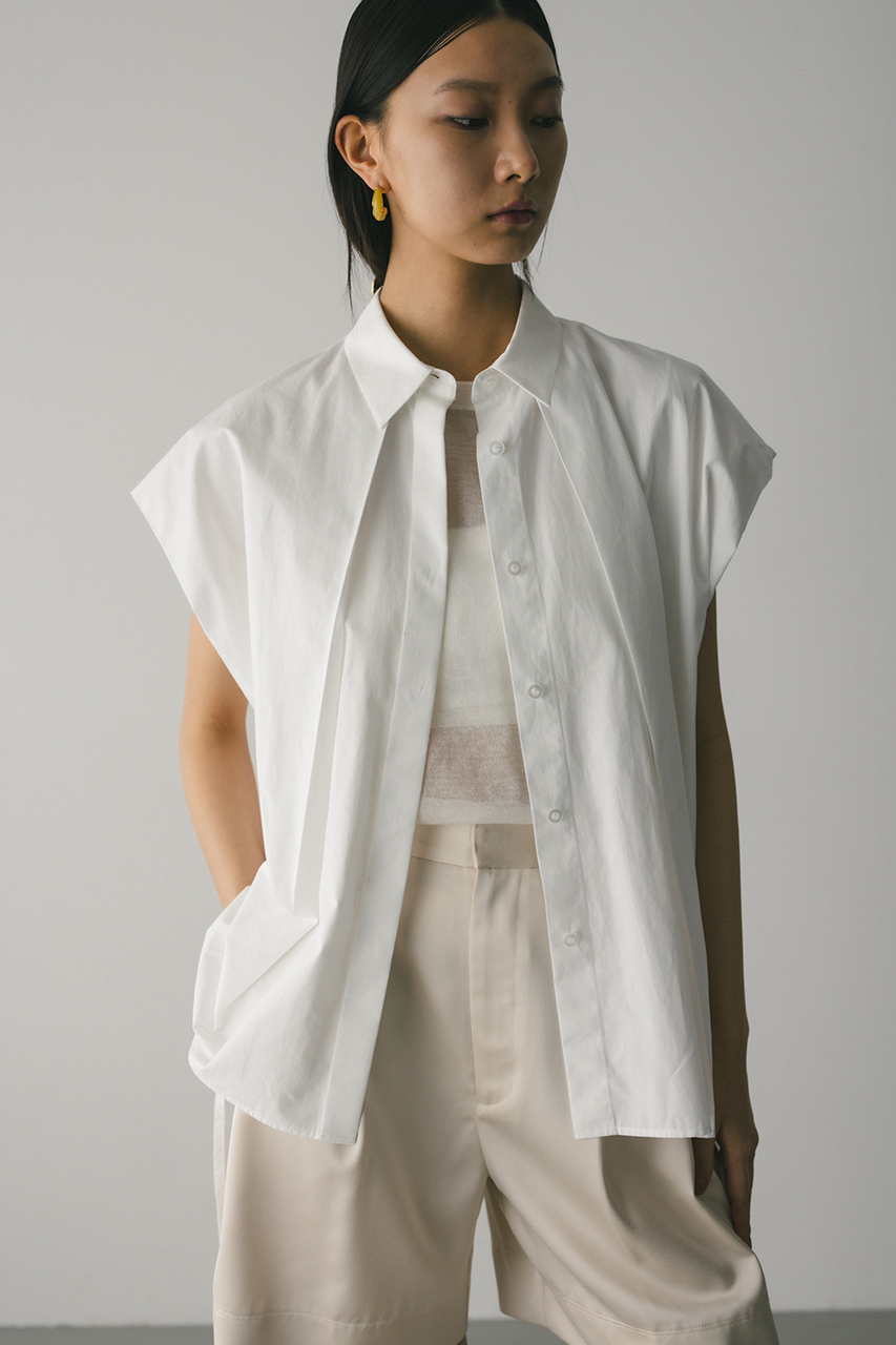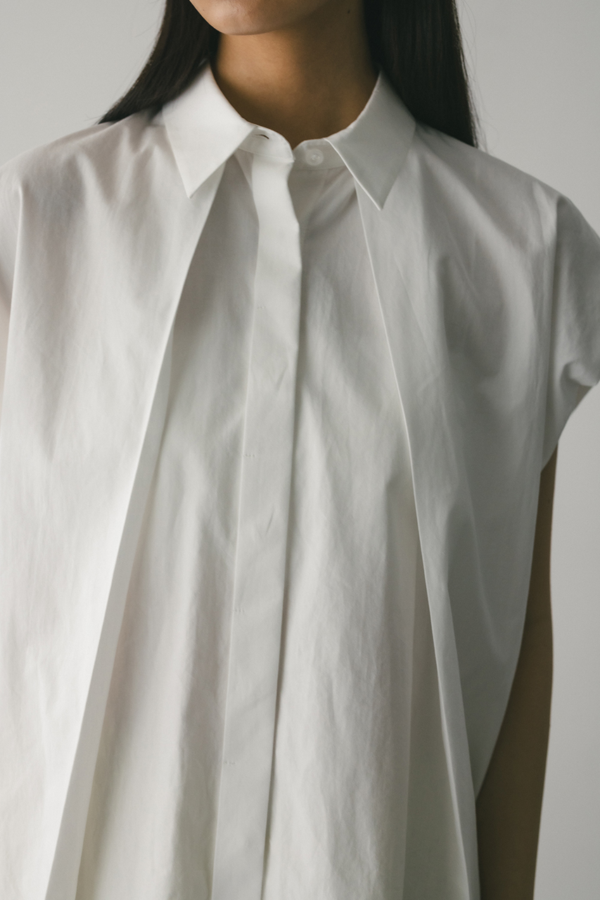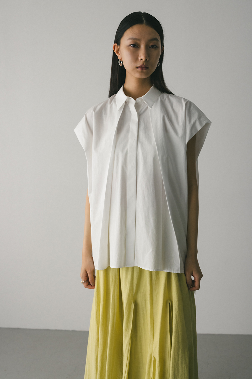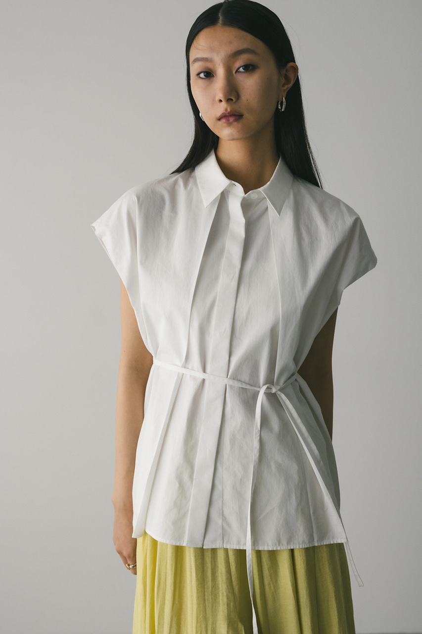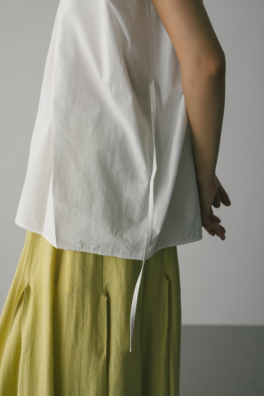 オーバーショルダーとゆったりルーズな身幅、深いタックデザインで可愛いフォルムを作ってくれるオーバーシャツ。脇のスリットから紐を通して結んだり、チョーカー風に巻いたり、襟下で結んだりとアレンジを楽しんでいただけます。ヒップをカバーしてくれる丈でボトムスを選ばず着用頂けます。透け感WHTややあり、ストレッチなし。