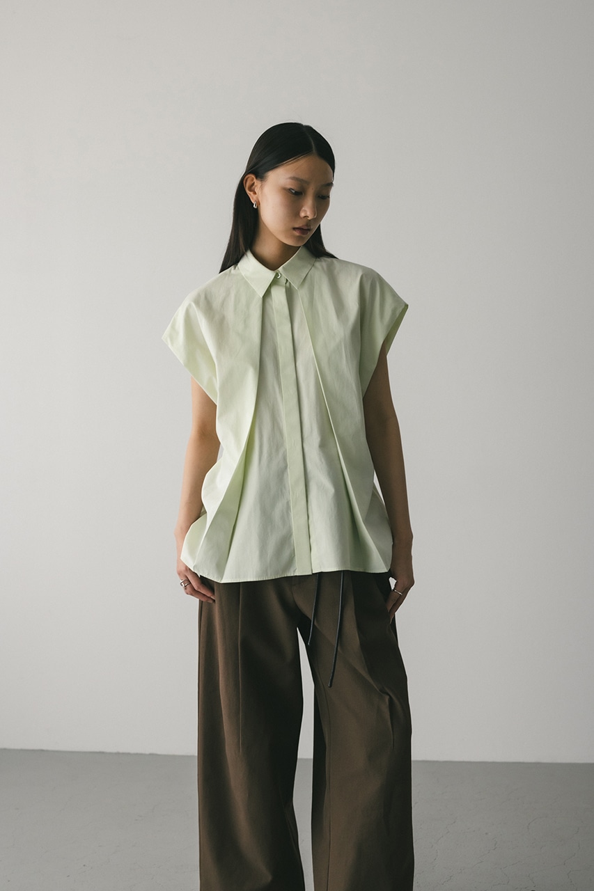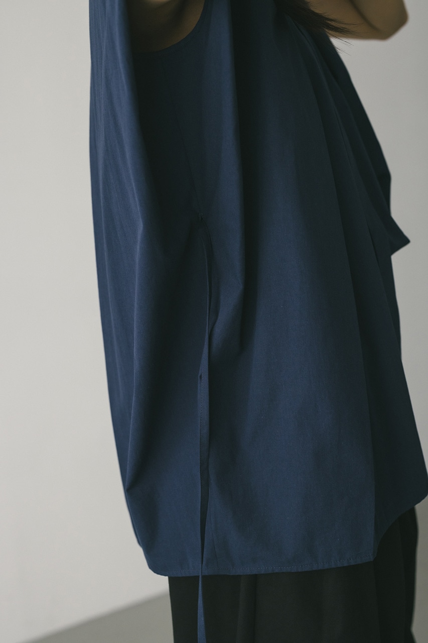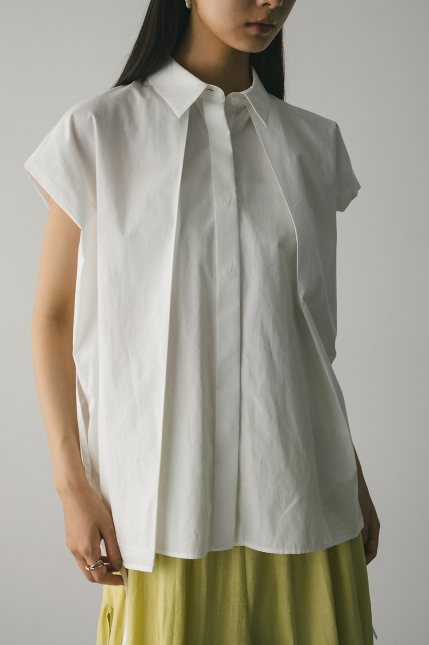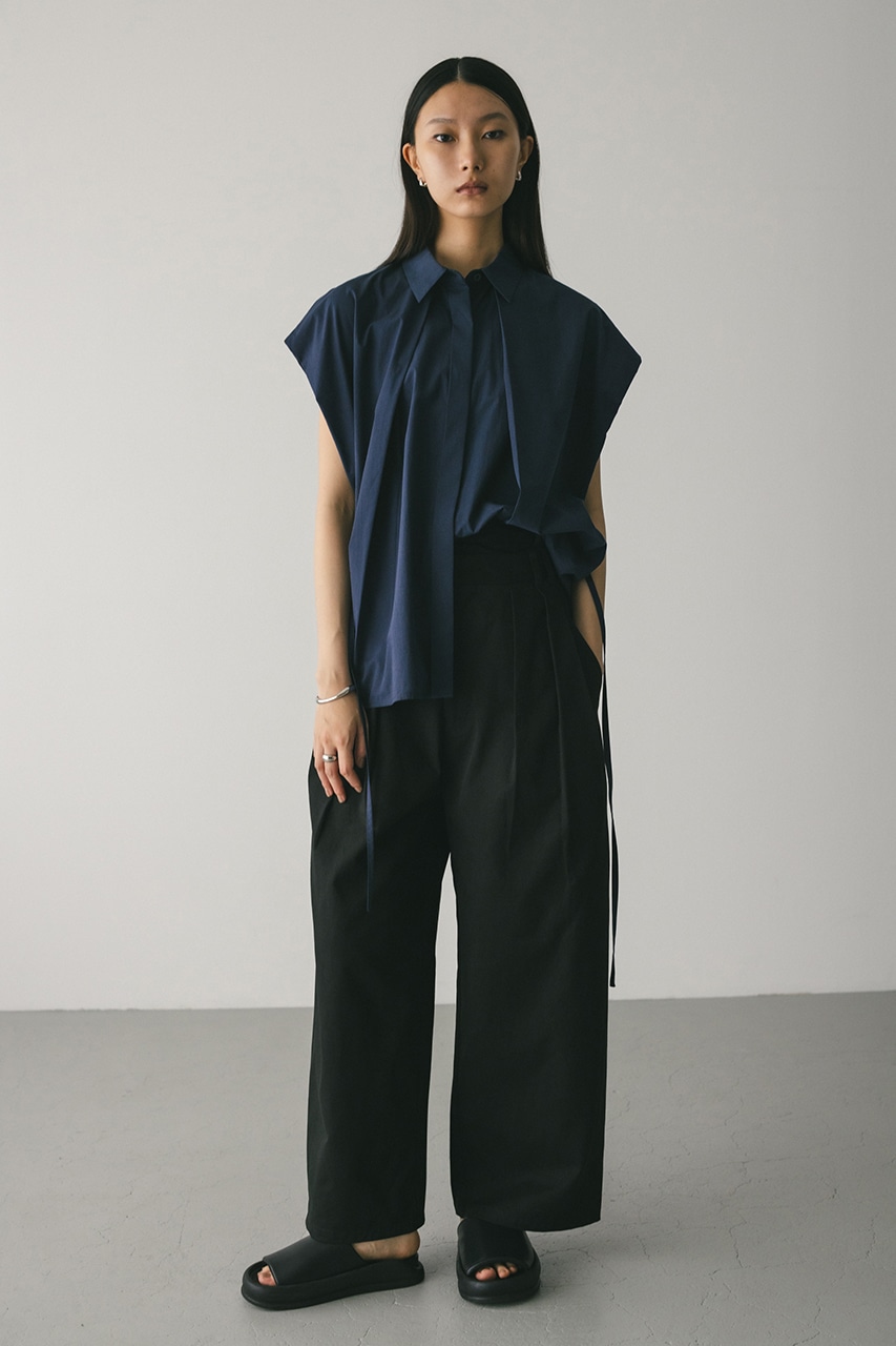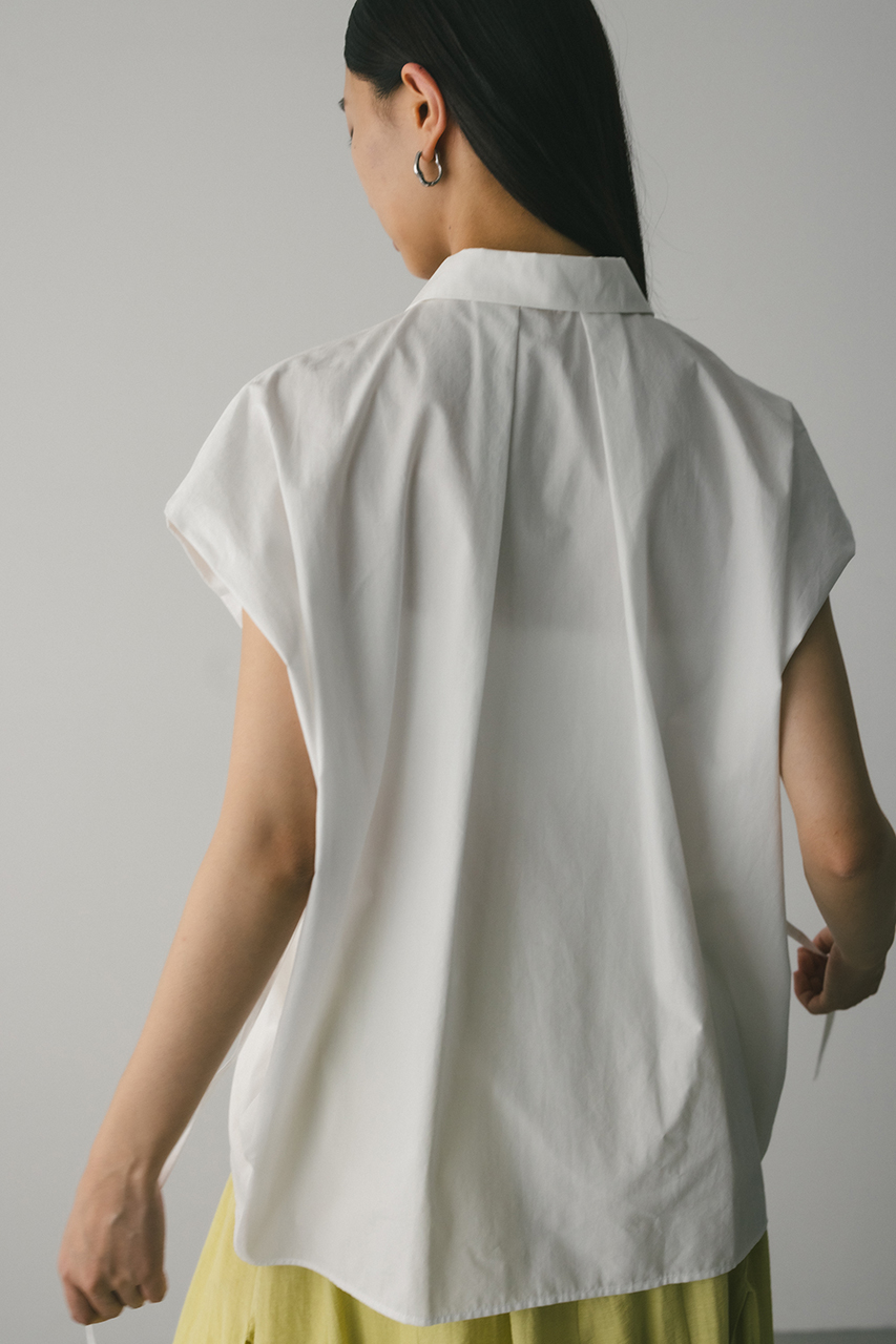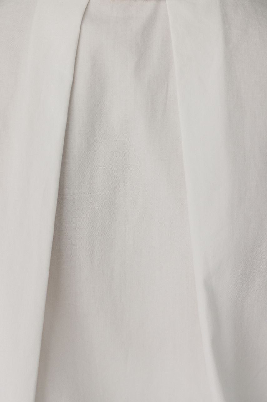 オーバーショルダーとゆったりルーズな身幅、深いタックデザインで可愛いフォルムを作ってくれるオーバーシャツ。脇のスリットから紐を通して結んだり、チョーカー風に巻いたり、襟下で結んだりとアレンジを楽しんでいただけます。ヒップをカバーしてくれる丈でボトムスを選ばず着用頂けます。透け感WHTややあり、ストレッチなし。