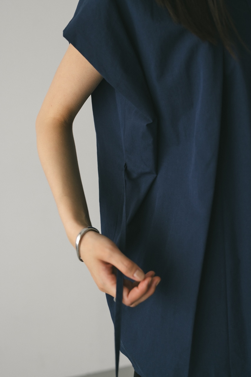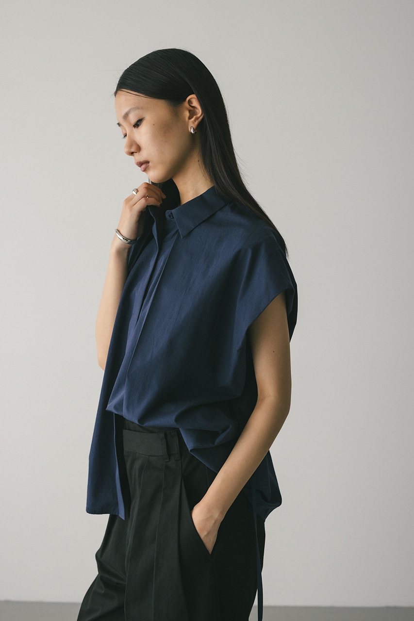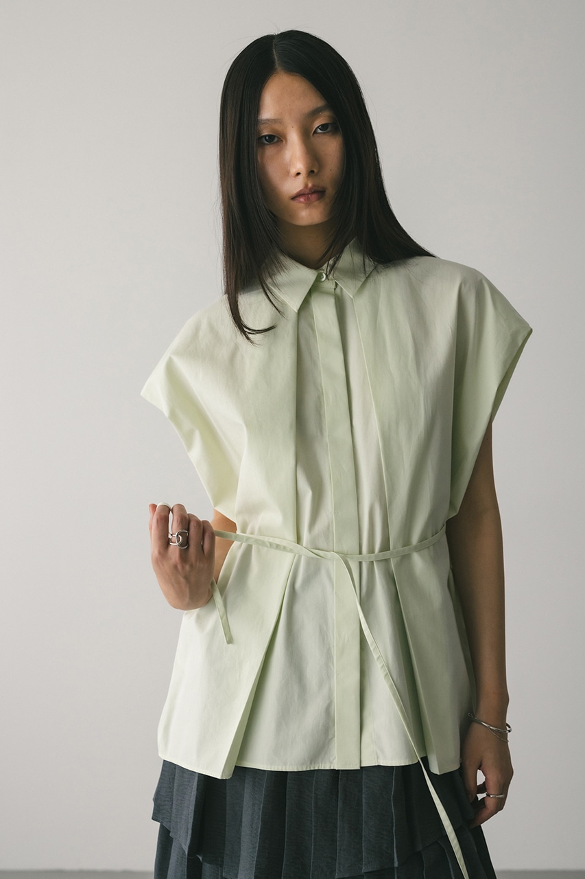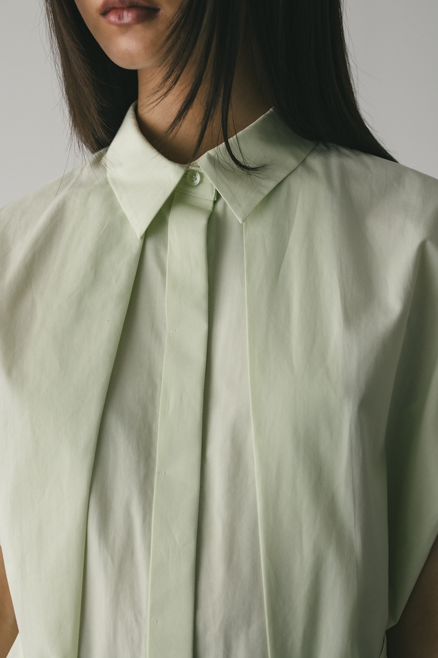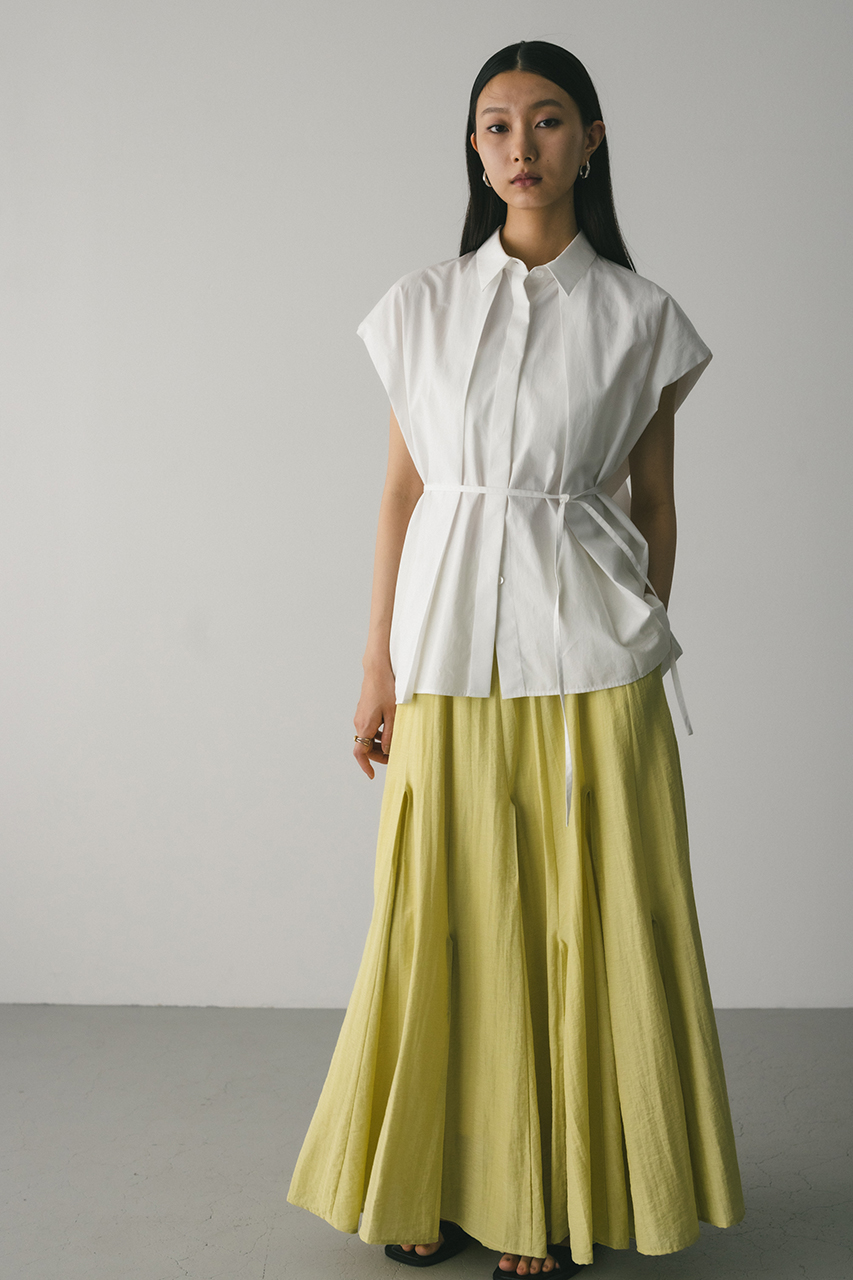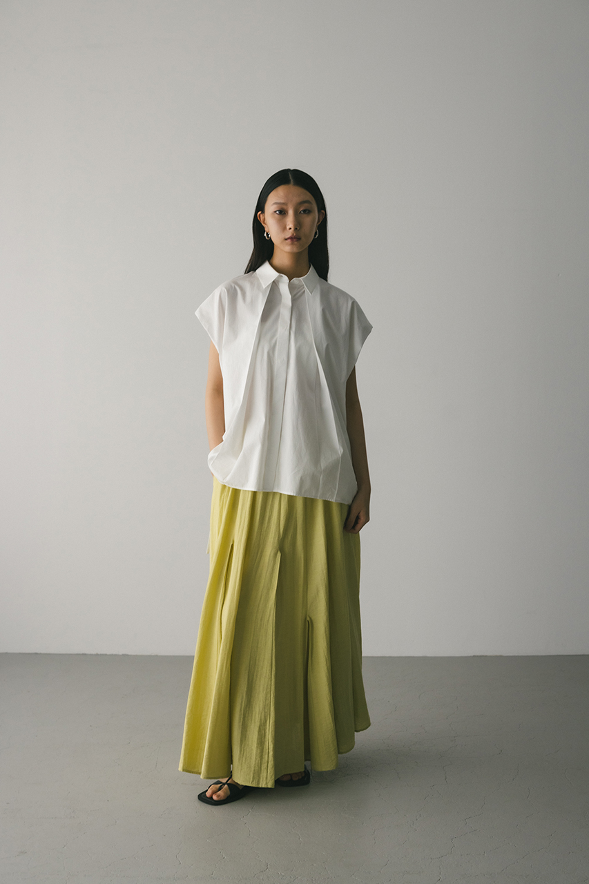 オーバーショルダーとゆったりルーズな身幅、深いタックデザインで可愛いフォルムを作ってくれるオーバーシャツ。脇のスリットから紐を通して結んだり、チョーカー風に巻いたり、襟下で結んだりとアレンジを楽しんでいただけます。ヒップをカバーしてくれる丈でボトムスを選ばず着用頂けます。透け感WHTややあり、ストレッチなし。