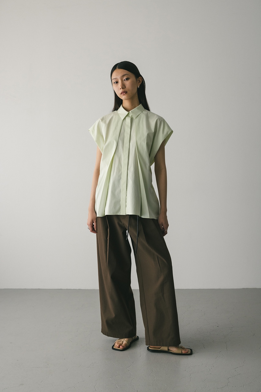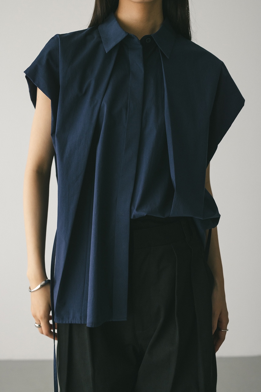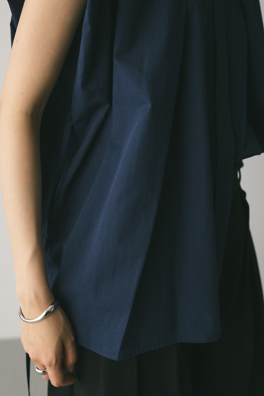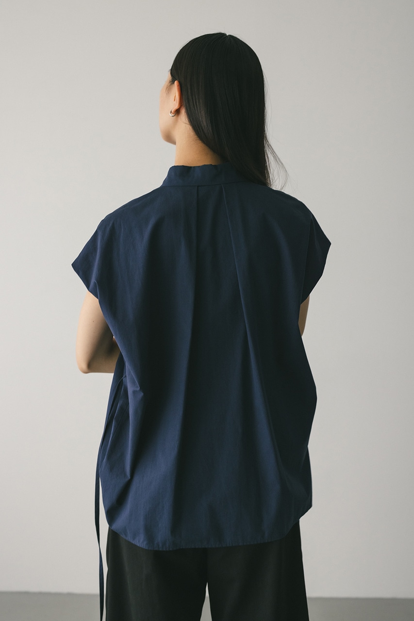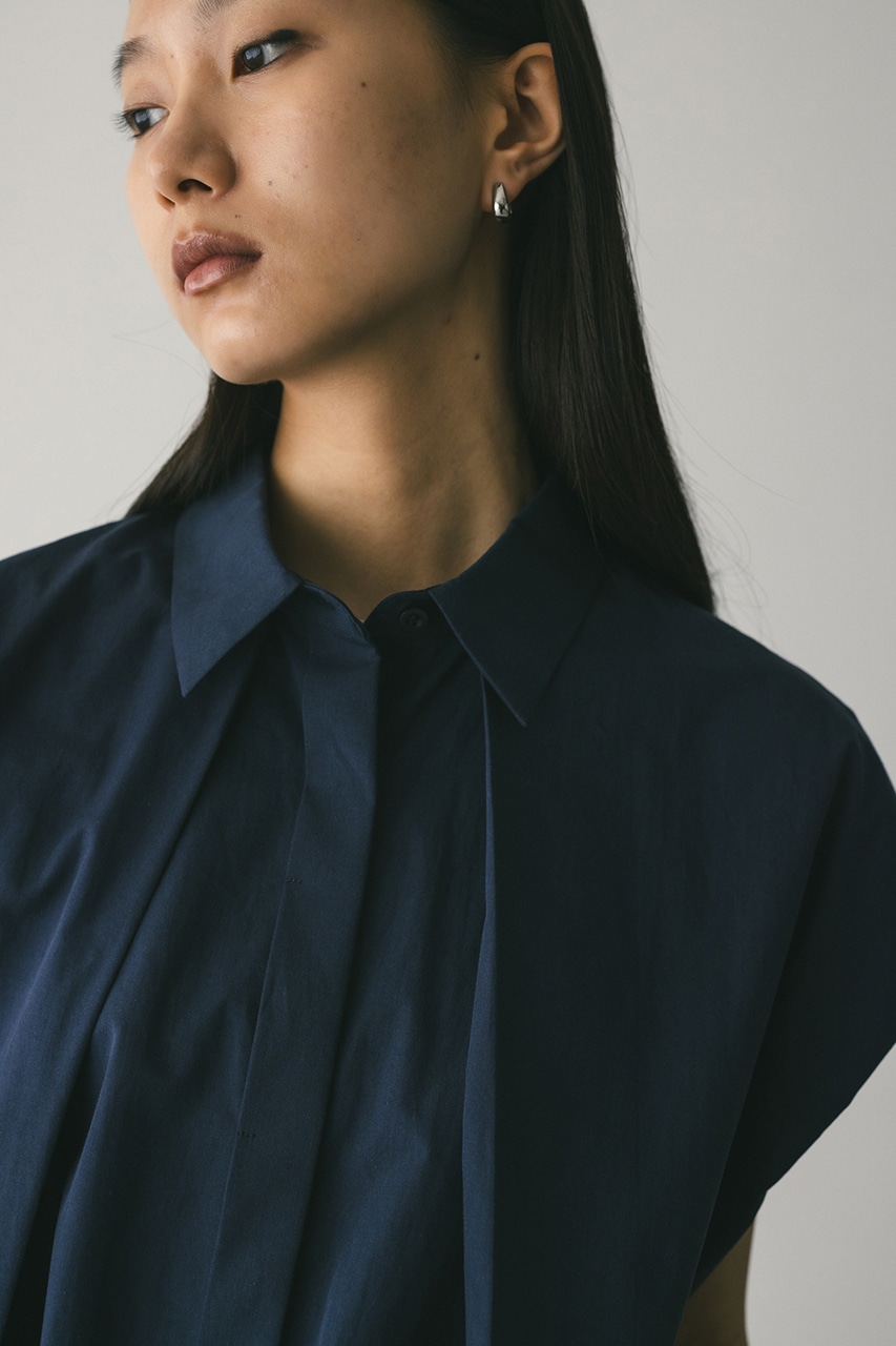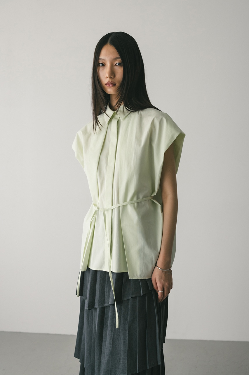 オーバーショルダーとゆったりルーズな身幅、深いタックデザインで可愛いフォルムを作ってくれるオーバーシャツ。脇のスリットから紐を通して結んだり、チョーカー風に巻いたり、襟下で結んだりとアレンジを楽しんでいただけます。ヒップをカバーしてくれる丈でボトムスを選ばず着用頂けます。透け感WHTややあり、ストレッチなし。