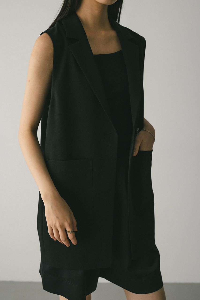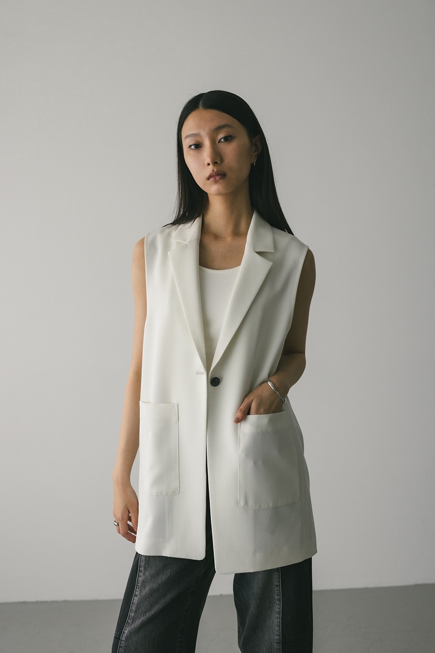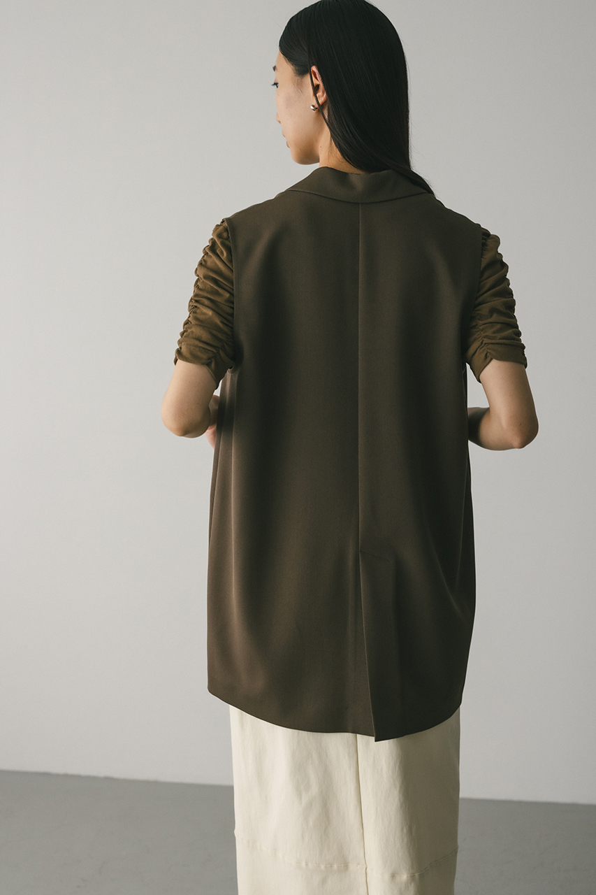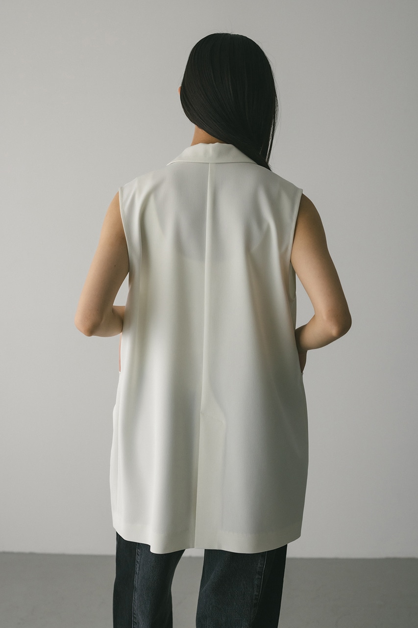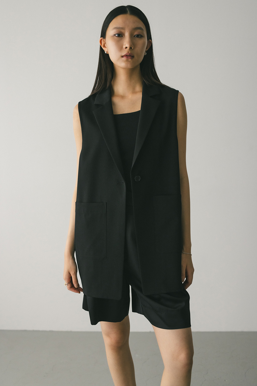 ドライタッチで着心地の良いテーラーベスト。深い前下がりデザインですっきりとモードな印象で着用していただけます。オケージョンシーンにもおすすめな一枚です。バックベンツ仕様。透け感なし、ストレッチなし。