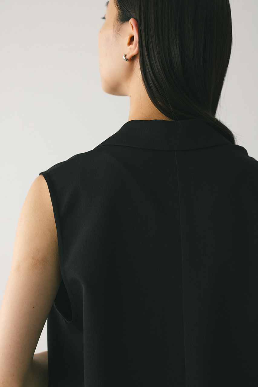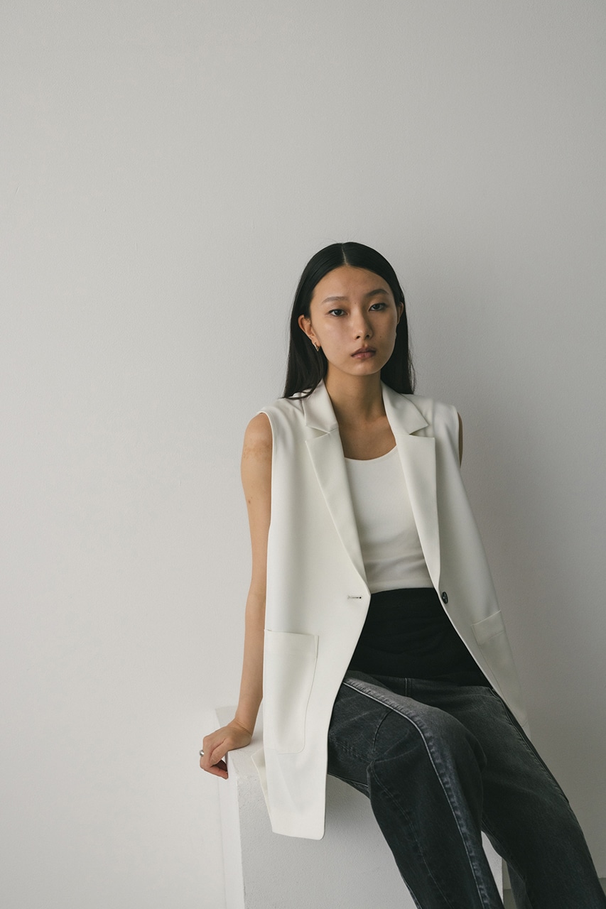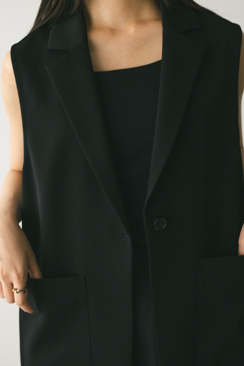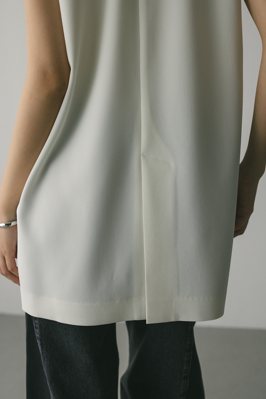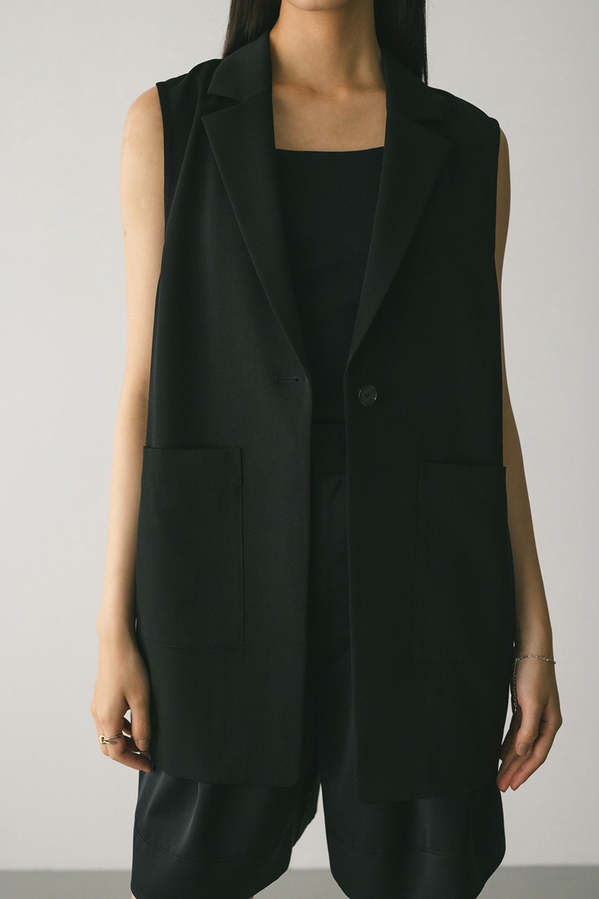 ドライタッチで着心地の良いテーラーベスト。深い前下がりデザインですっきりとモードな印象で着用していただけます。オケージョンシーンにもおすすめな一枚です。バックベンツ仕様。透け感なし、ストレッチなし。