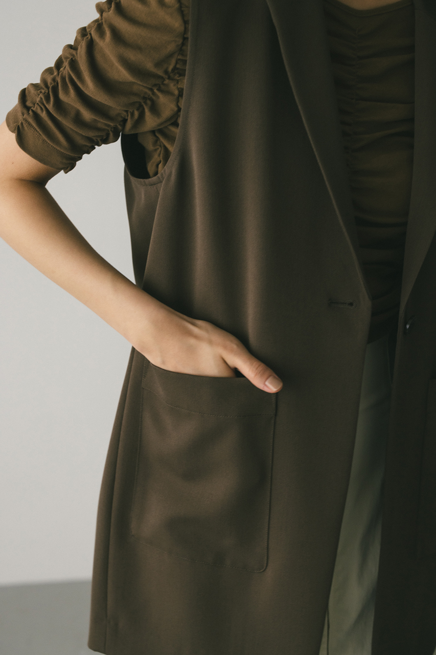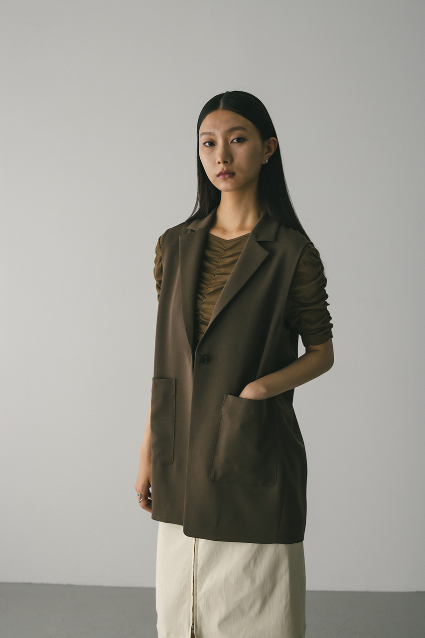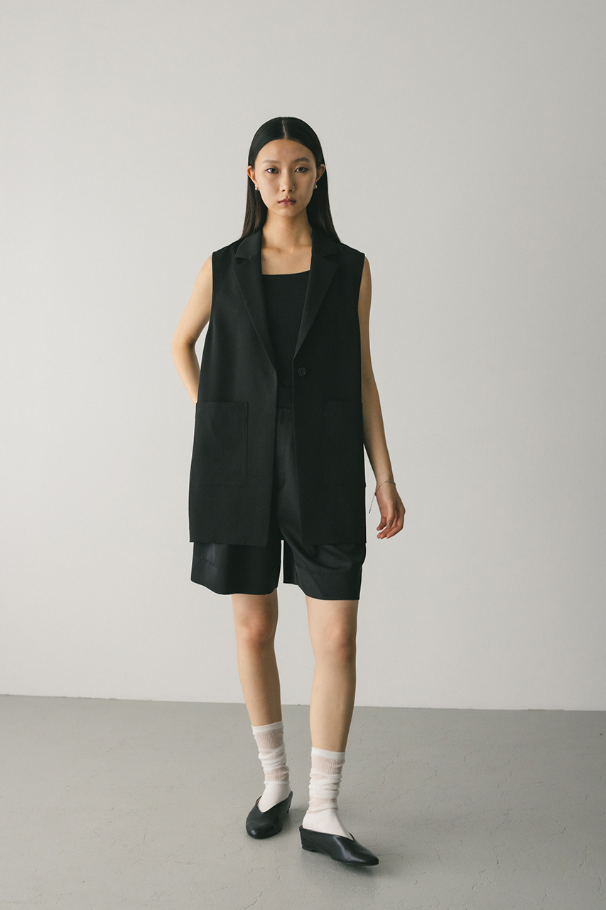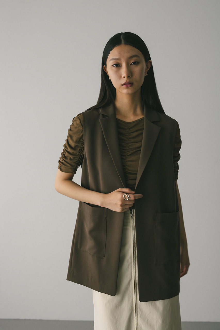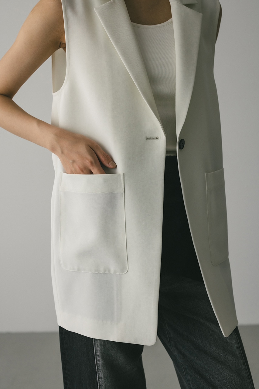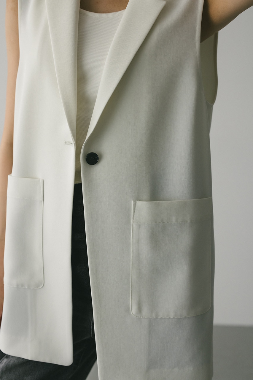 ドライタッチで着心地の良いテーラーベスト。深い前下がりデザインですっきりとモードな印象で着用していただけます。オケージョンシーンにもおすすめな一枚です。バックベンツ仕様。透け感なし、ストレッチなし。