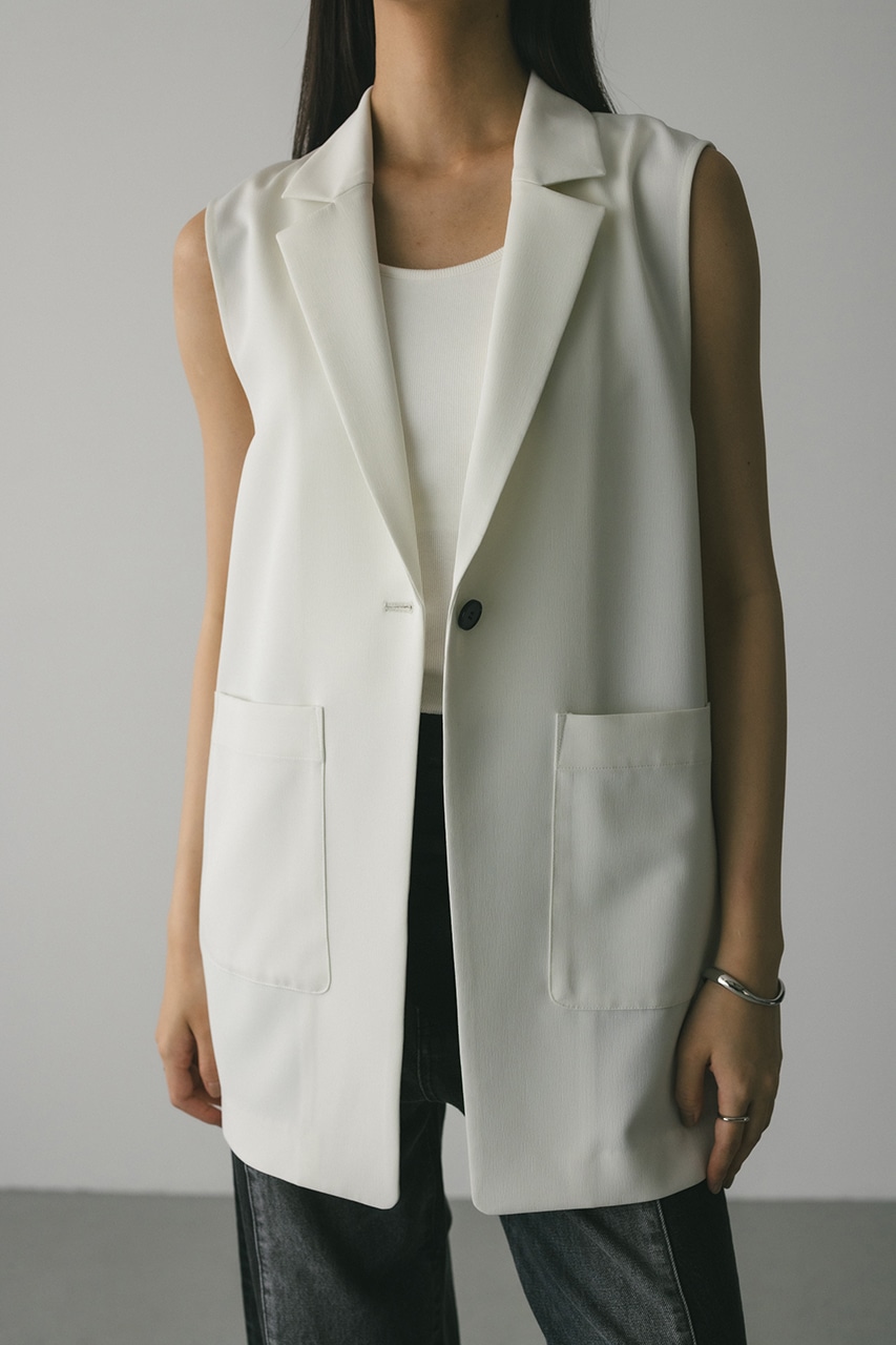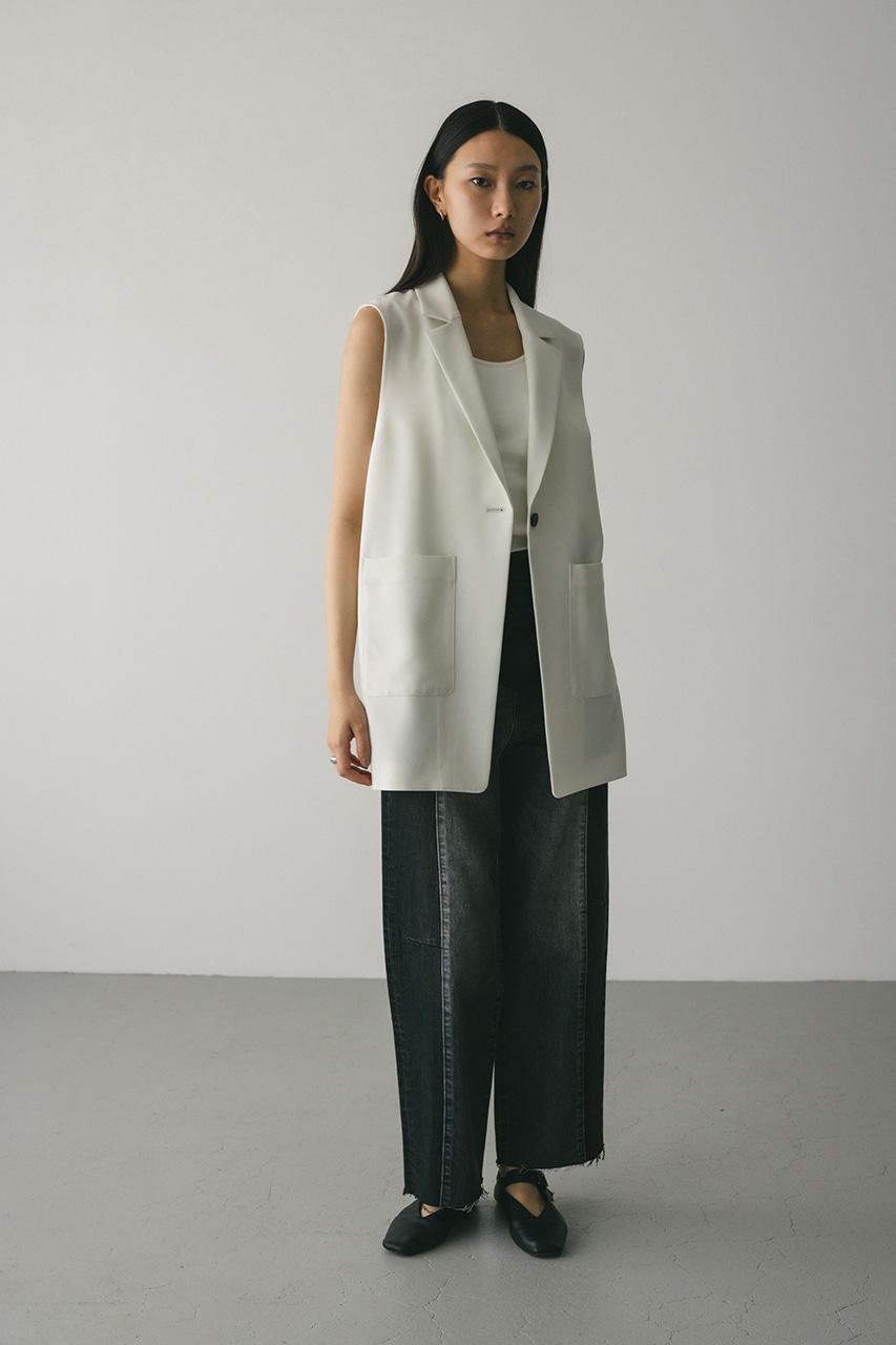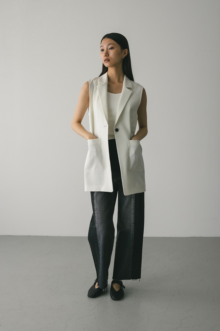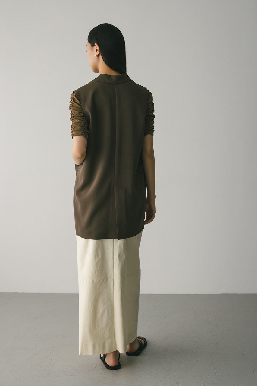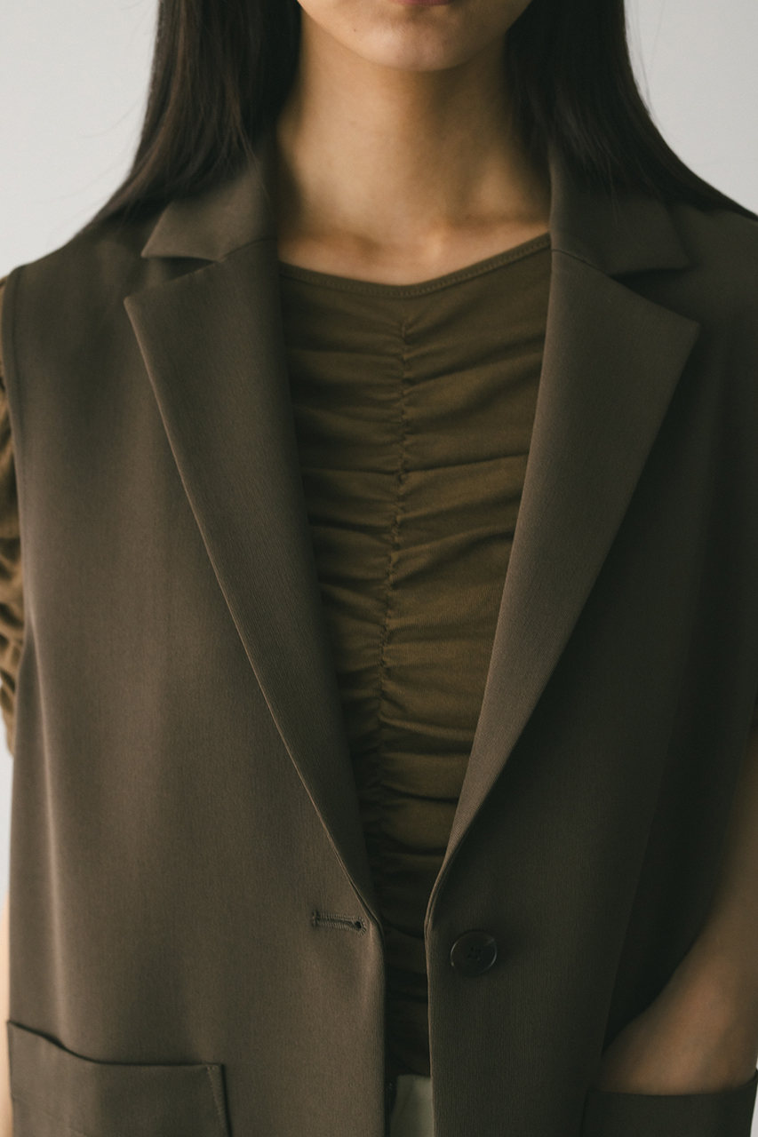 ドライタッチで着心地の良いテーラーベスト。深い前下がりデザインですっきりとモードな印象で着用していただけます。オケージョンシーンにもおすすめな一枚です。バックベンツ仕様。透け感なし、ストレッチなし。