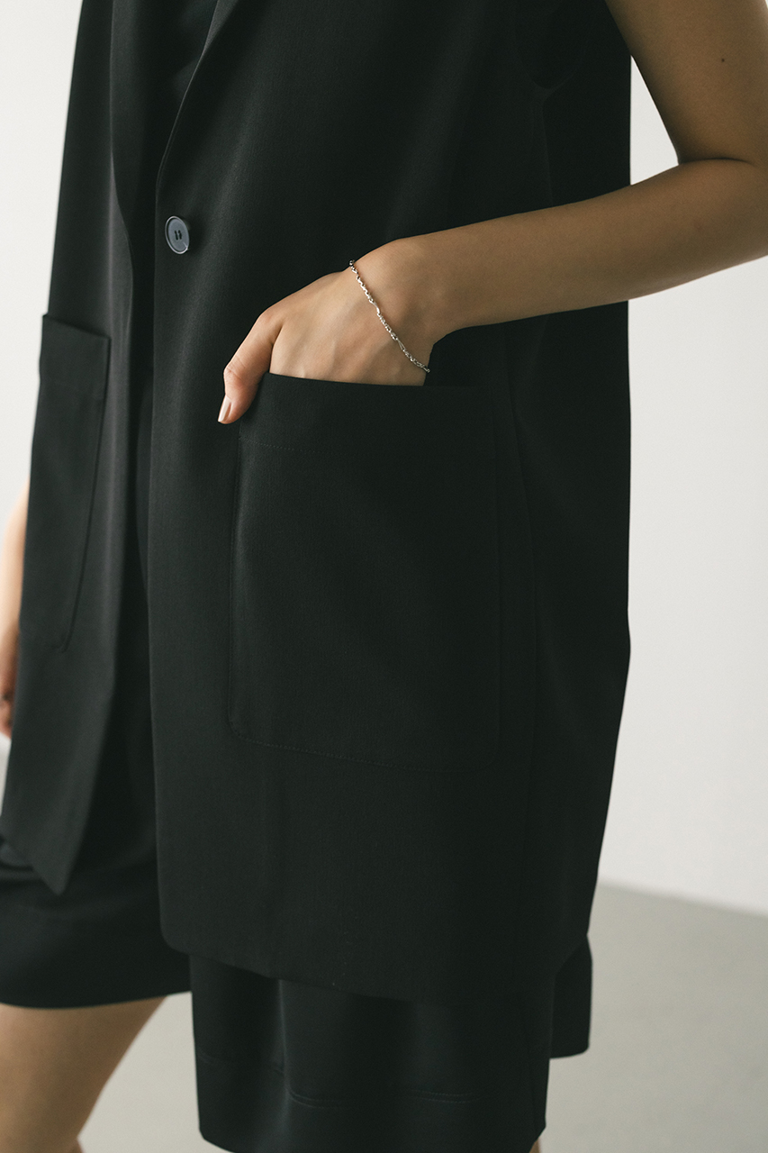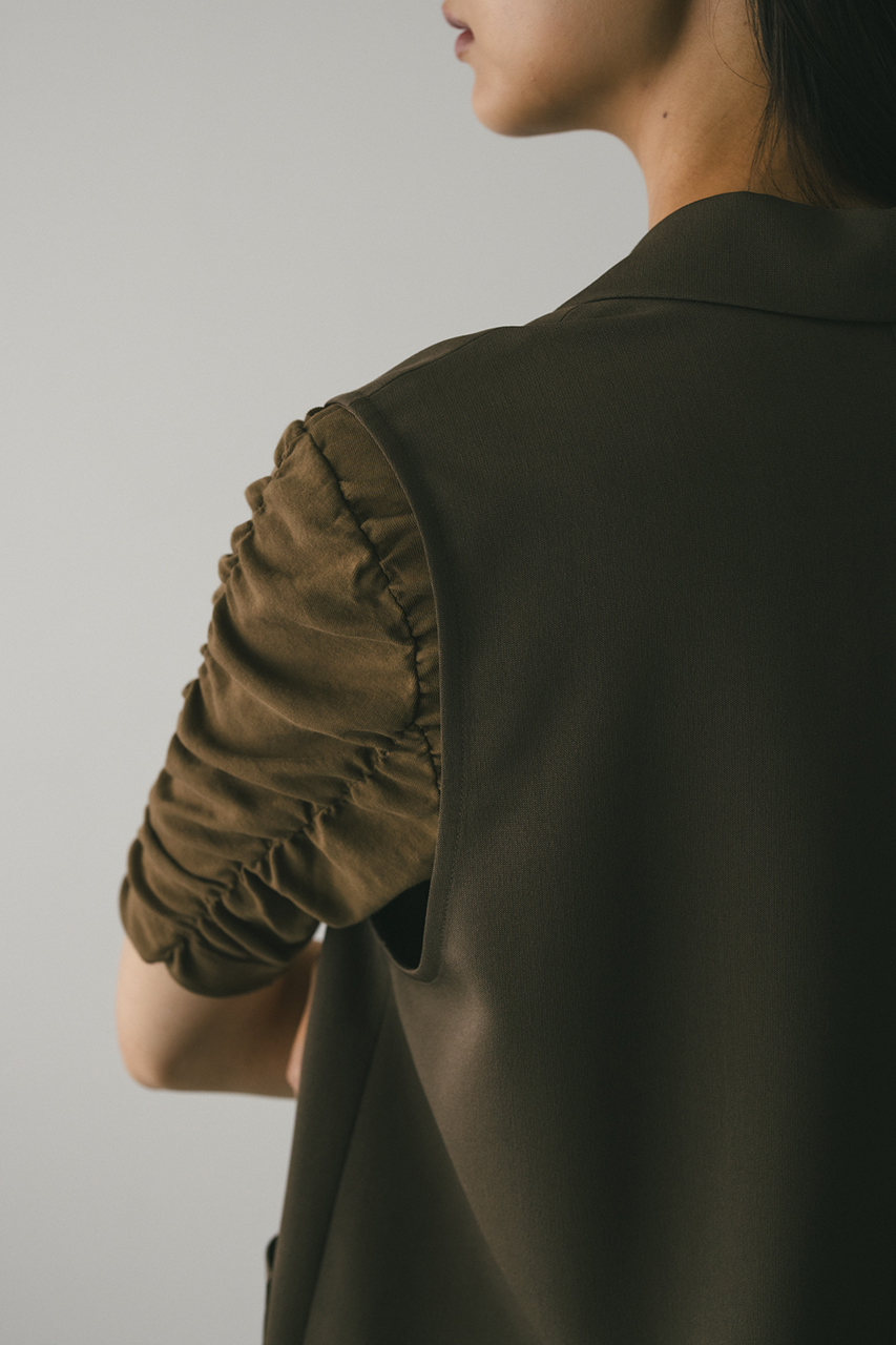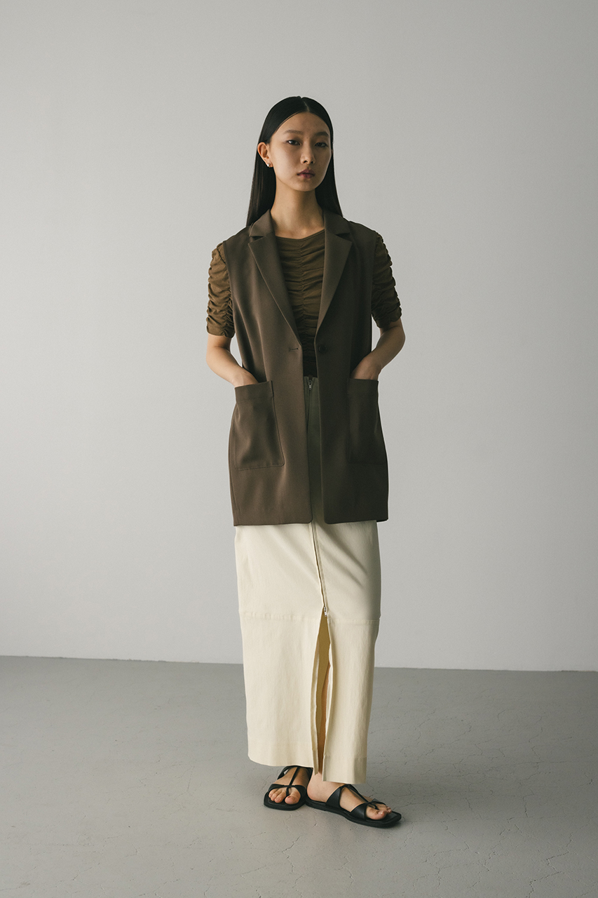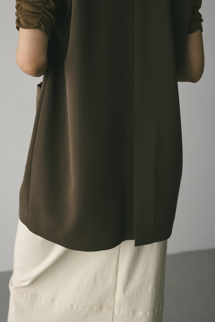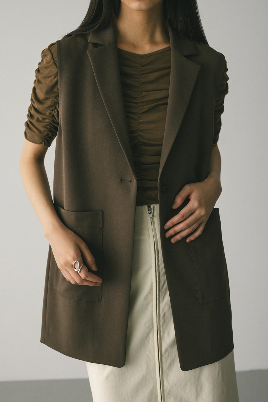 ドライタッチで着心地の良いテーラーベスト。深い前下がりデザインですっきりとモードな印象で着用していただけます。オケージョンシーンにもおすすめな一枚です。バックベンツ仕様。透け感なし、ストレッチなし。