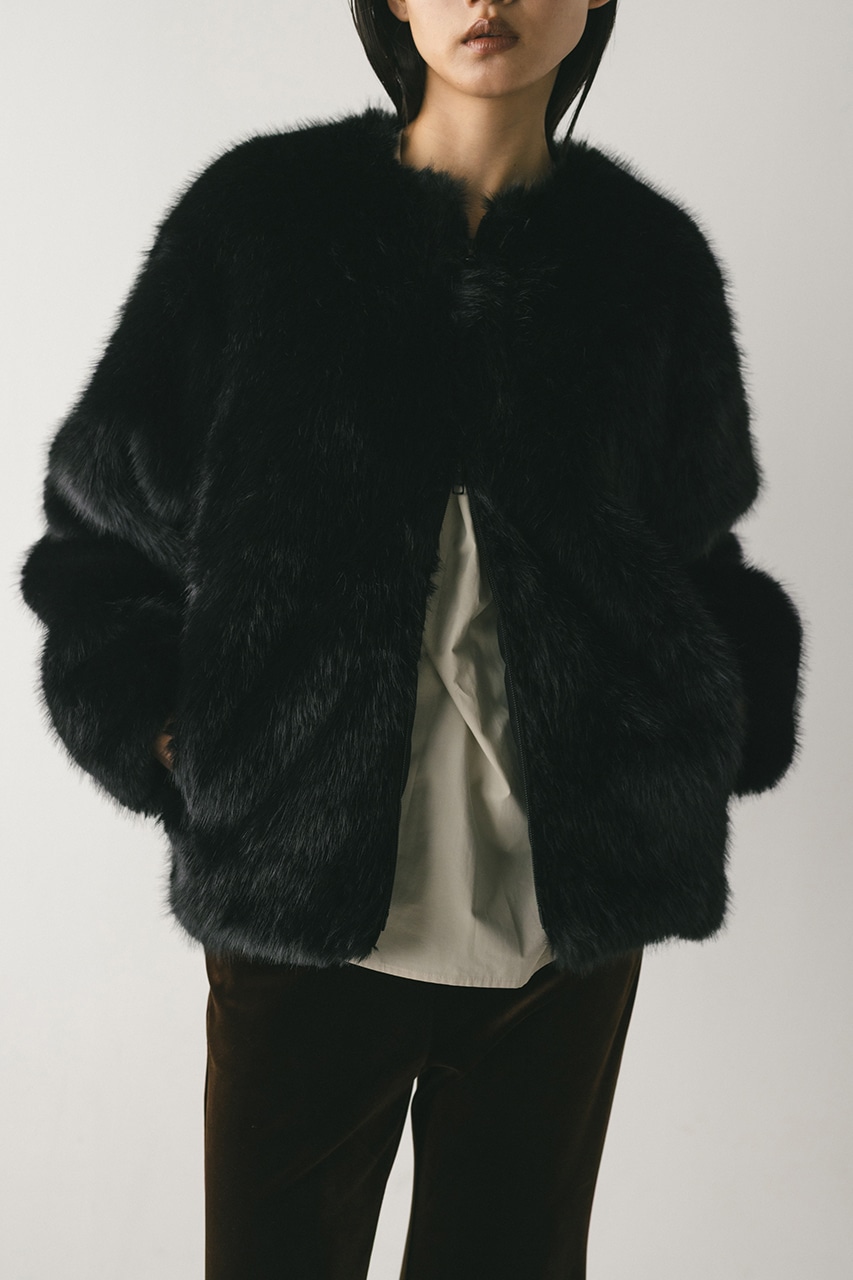 存在感のある毛足がかわいい上品なノーカラーファージャケット。ラフに羽織れるカーディガンタイプのルーズシルエットがポイント。肩接ぎを後ろに倒すことで肩が張って見えないように仕上げました。サイドにもファスナーを施しているのでレイヤードも楽しめるデザインジャケットです。フロント逆開ファスナー仕様。ストレッチなし、透け感なし。