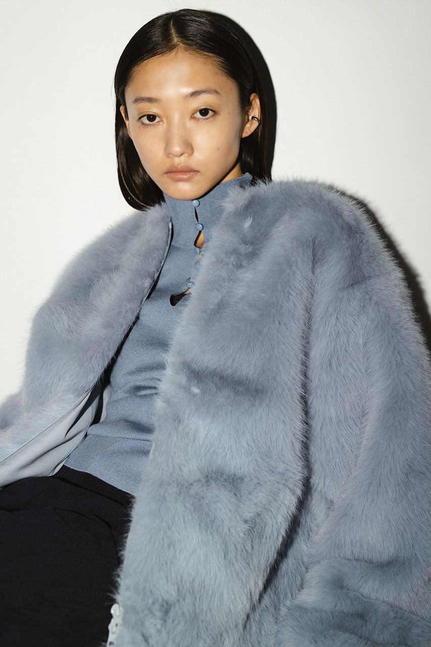 存在感のある毛足がかわいい上品なノーカラーファージャケット。ラフに羽織れるカーディガンタイプのルーズシルエットがポイント。肩接ぎを後ろに倒すことで肩が張って見えないように仕上げました。サイドにもファスナーを施しているのでレイヤードも楽しめるデザインジャケットです。フロント逆開ファスナー仕様。ストレッチなし、透け感なし。