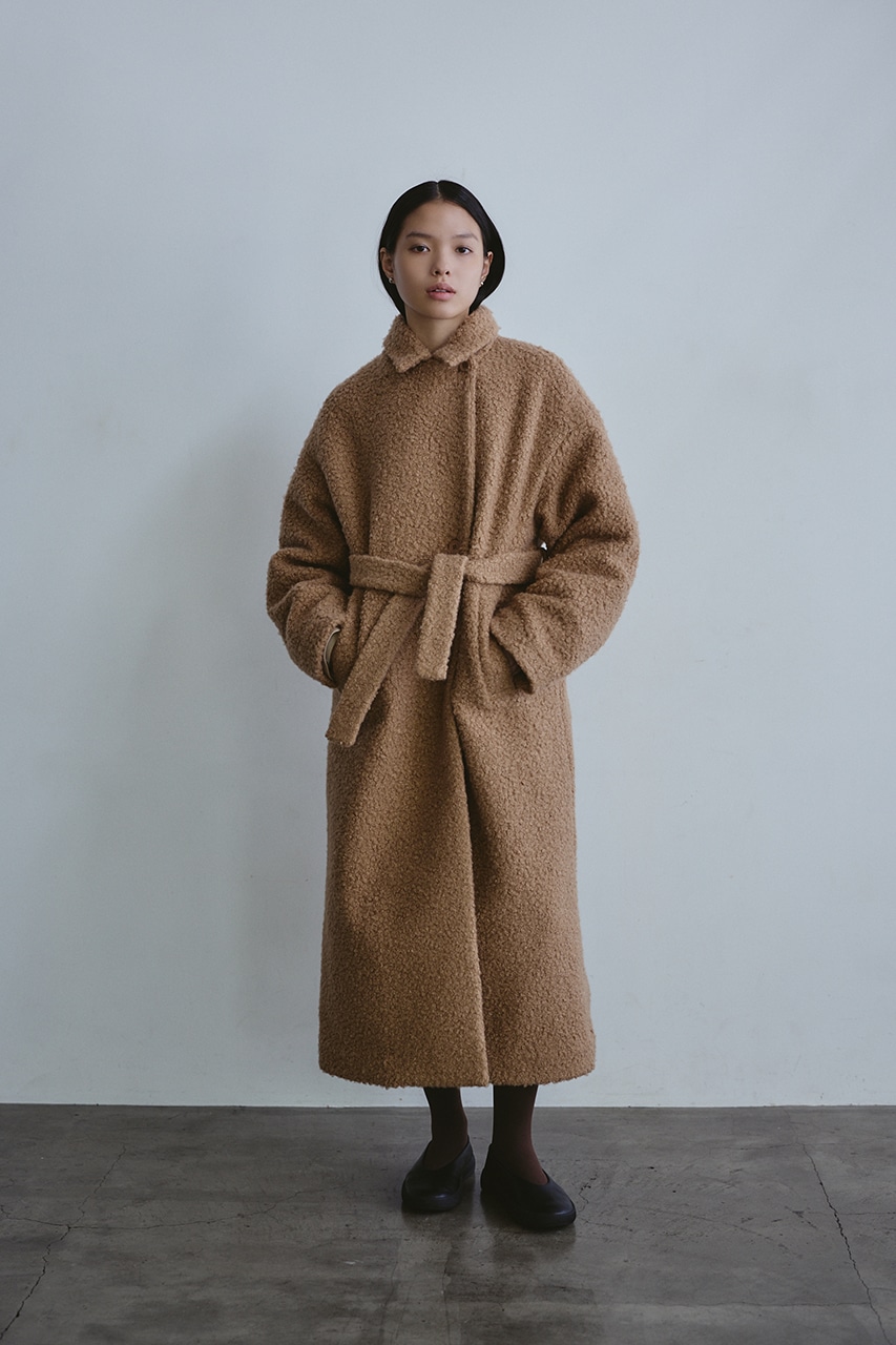 くるんとしたカールブークレーが可愛いボックスシルエットのロングコート。アップデティールでスタイルアップが叶う一枚です。シルエット変化が楽しめる共布ベルト付き。透け感なし、ストレッチなし。