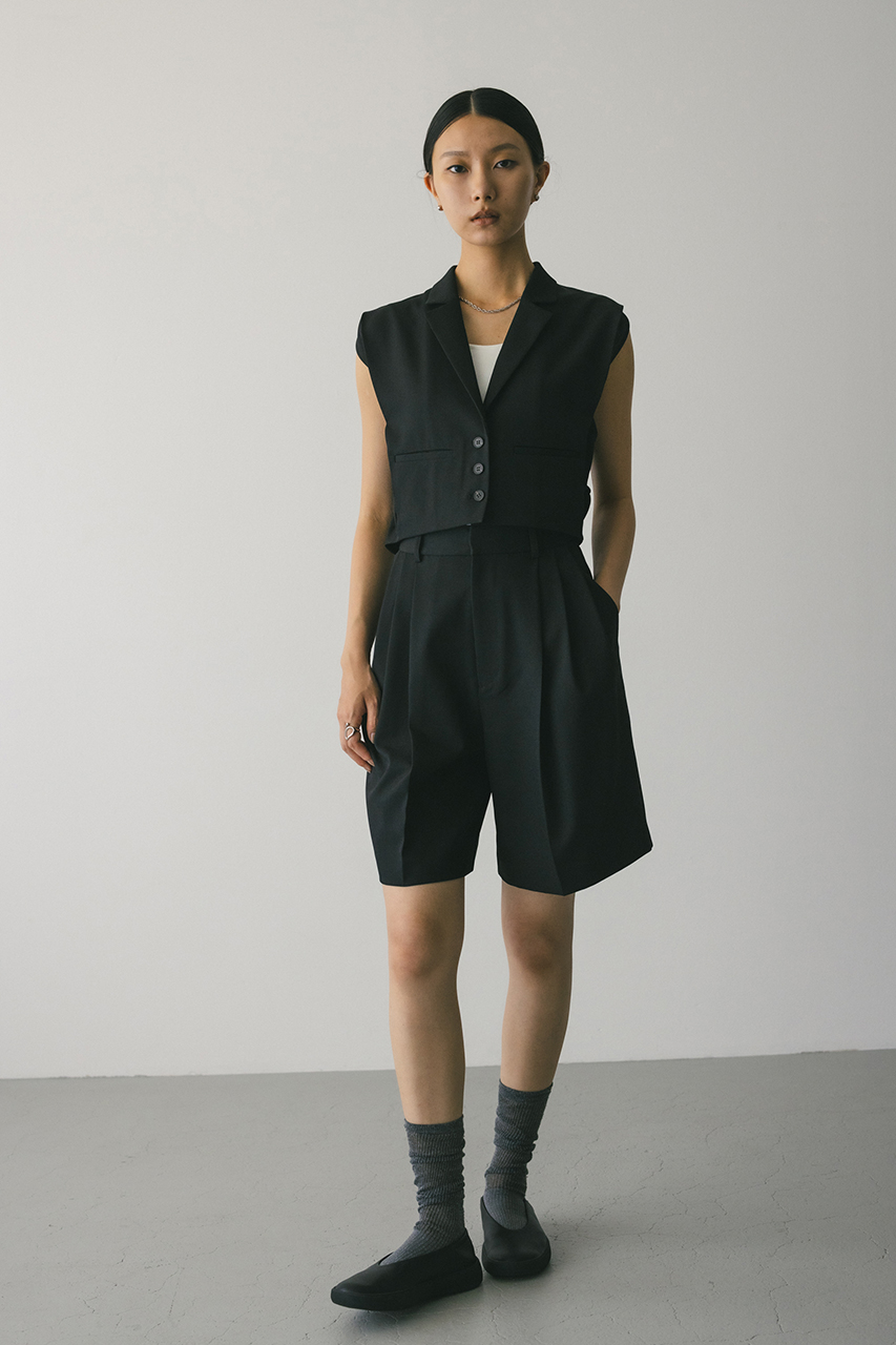 バランスのとりやすいコンパクトなショート丈ベスト。ショルダーから裾にかけて入れたタックがモードでスタイルアップに導きます。ウエストベルトは結んでも垂らしても可愛いです。インナー次第でロングシーズン着用頂けます。500IAS31-1391(3タックハーフパンツ)、500IAS31-1401(3タックスラックス)とセットアップ着用可能。透け感なし、ストレッチややあり。
