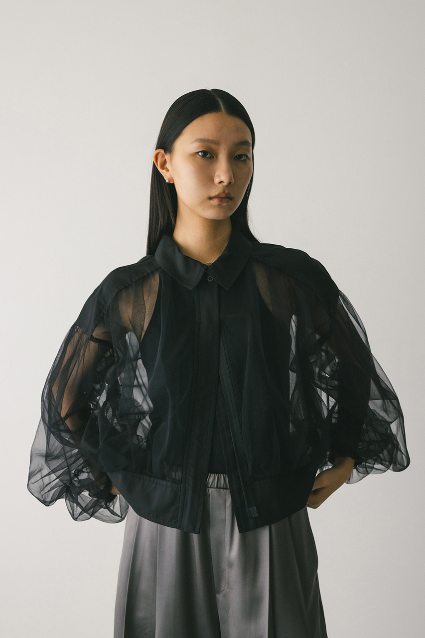 二重になったデザインスリーブが映えるシアーブルゾン。スタイリングがに鮮度をプラスしてくれる主役アイテムです。袖口はゴム仕様で腕まくりしやすいデティール。フロントはバランスのとりやすい逆開ファスナー仕様。透け感あり、ストレッチなし。