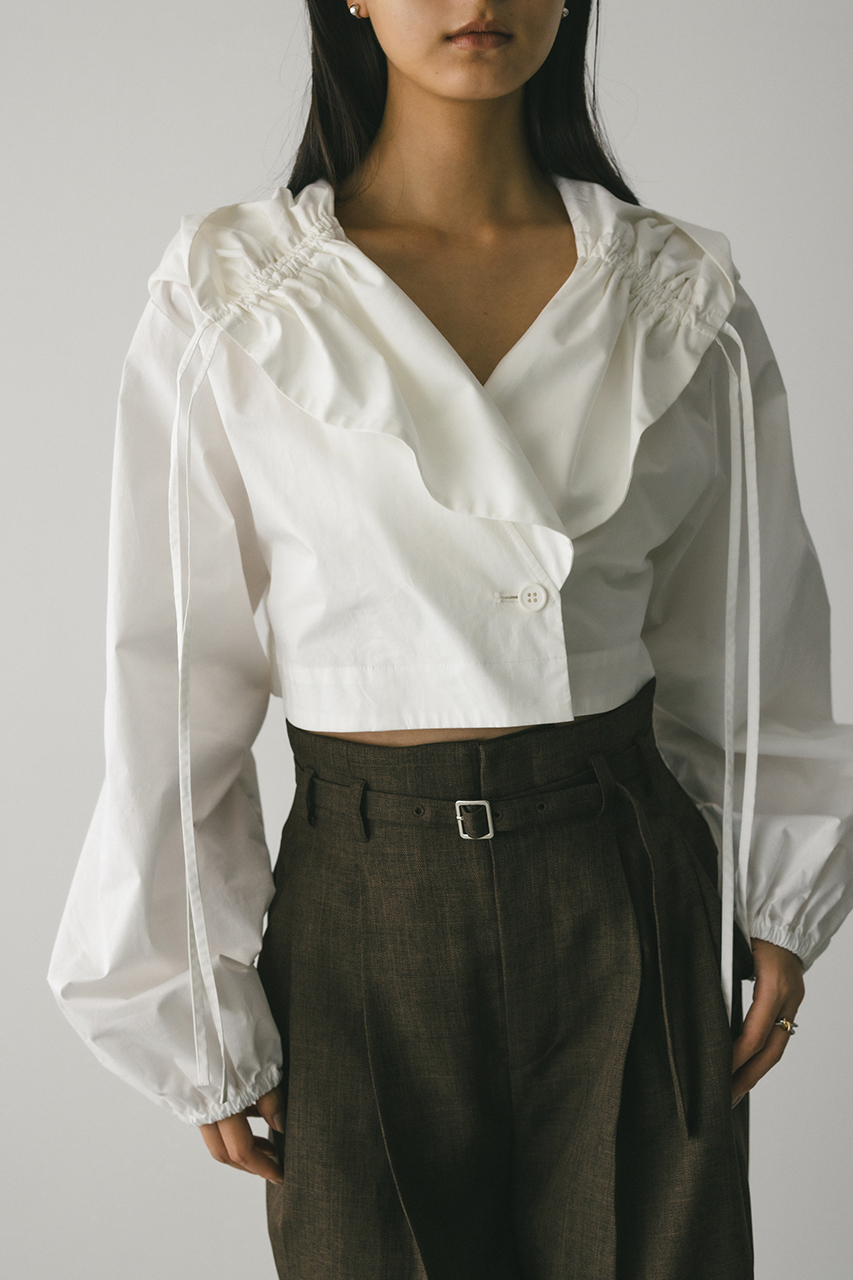 ハリ感のあるコットン素材で仕立てたデザインショートジャケット。大きなフードラペルとシャーリングが映える一枚です。バランスのとりやすいショート丈とゴム仕立てのボリュームスリーブがポイントです。透け感なし、ストレッチなし。
