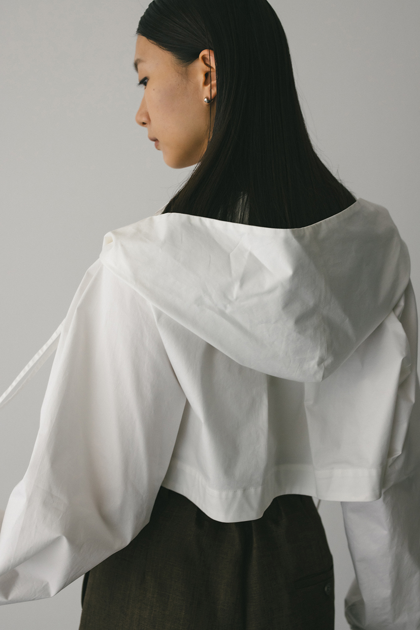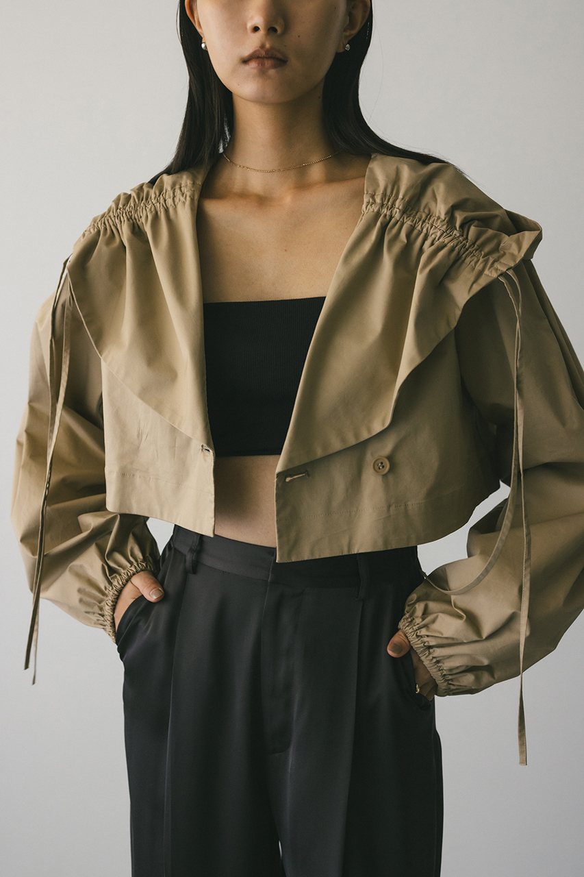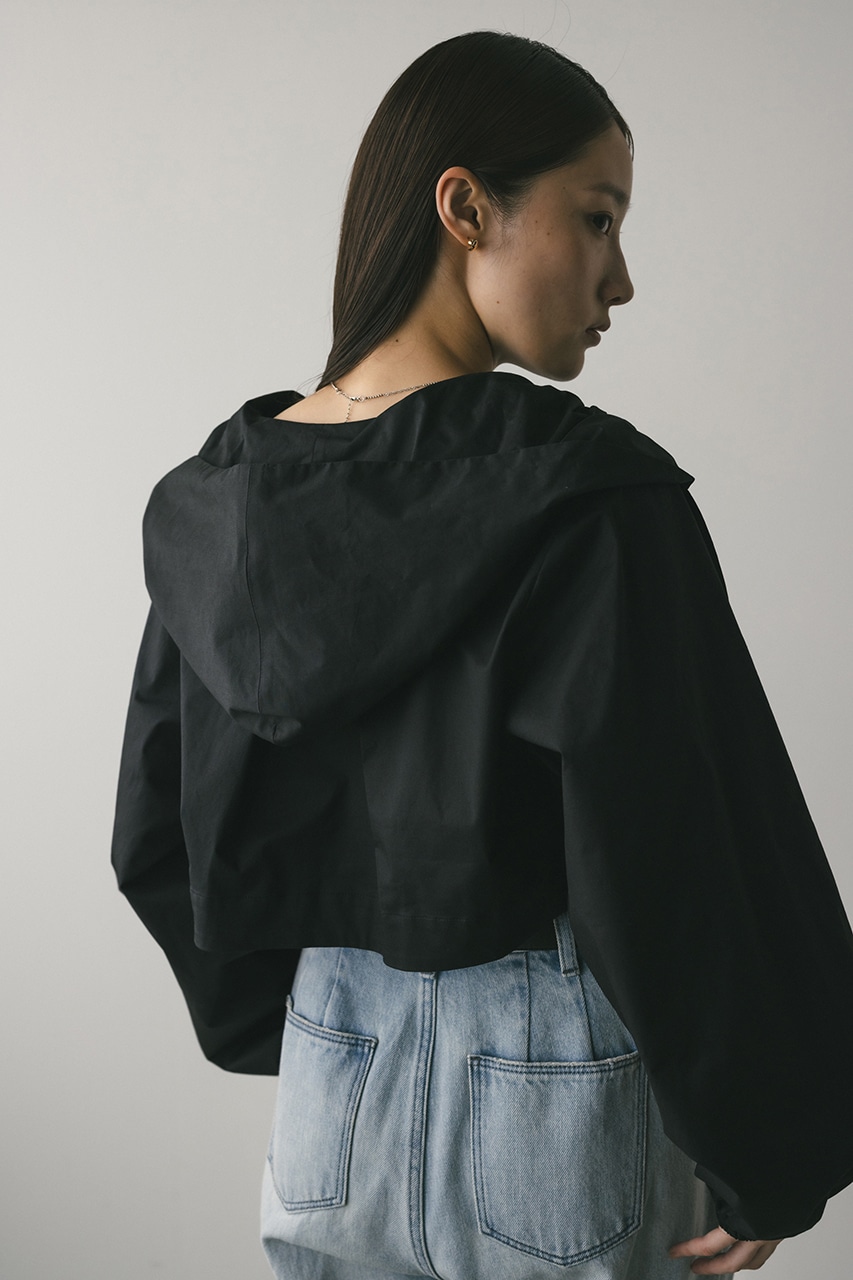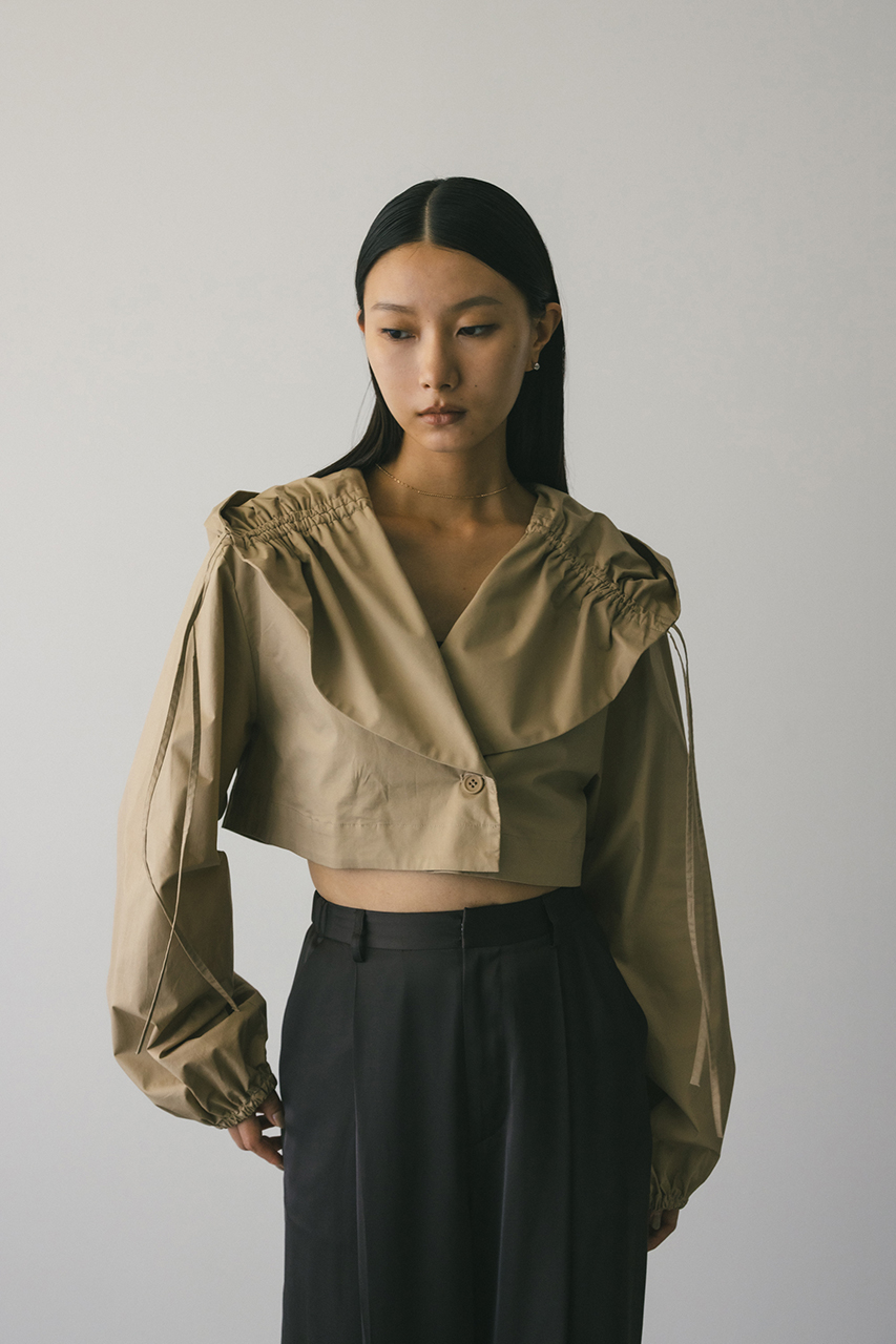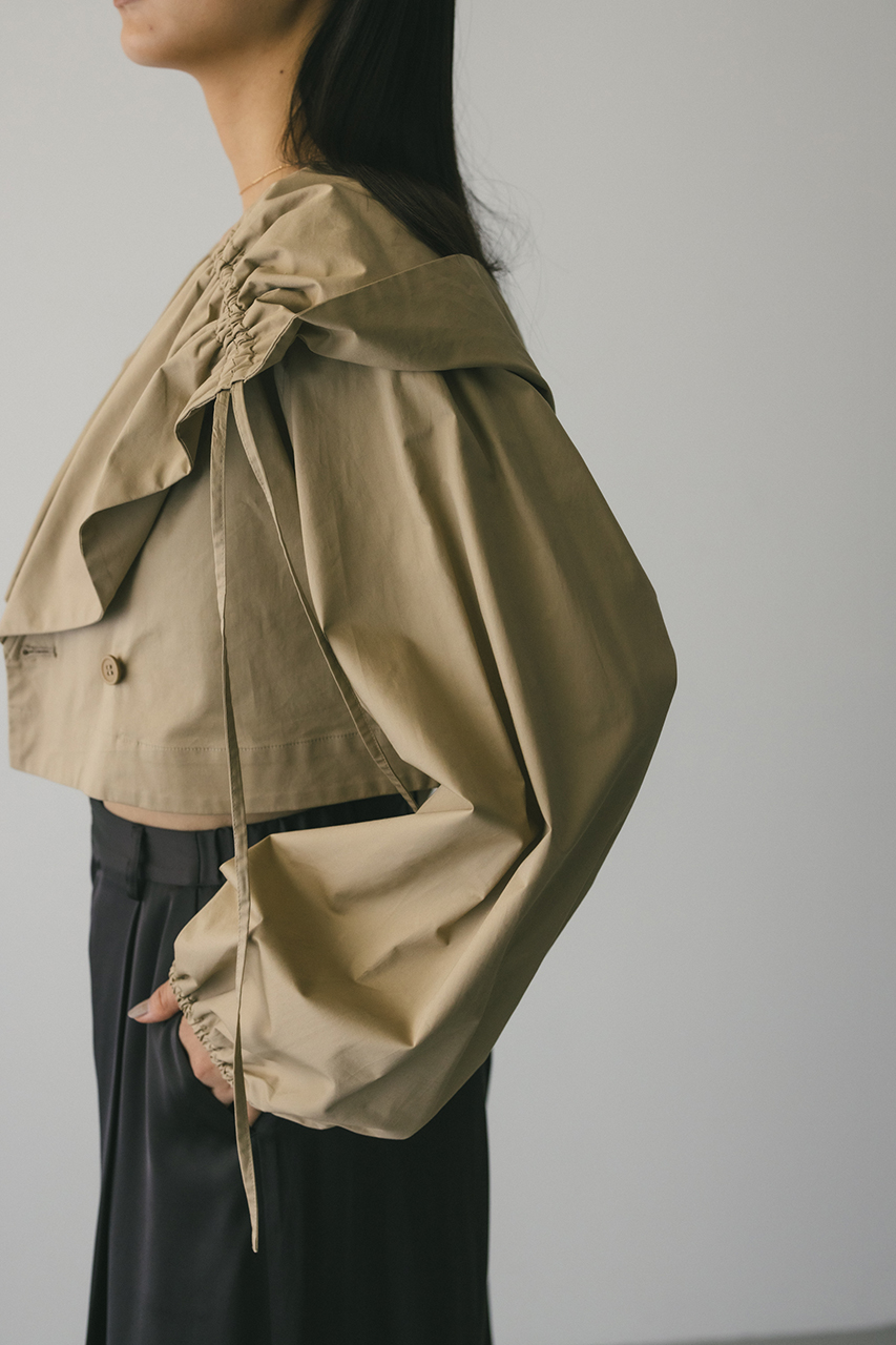 ハリ感のあるコットン素材で仕立てたデザインショートジャケット。大きなフードラペルとシャーリングが映える一枚です。バランスのとりやすいショート丈とゴム仕立てのボリュームスリーブがポイントです。透け感なし、ストレッチなし。