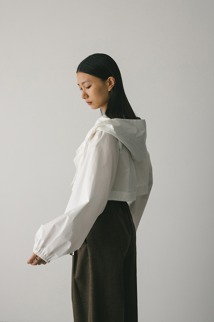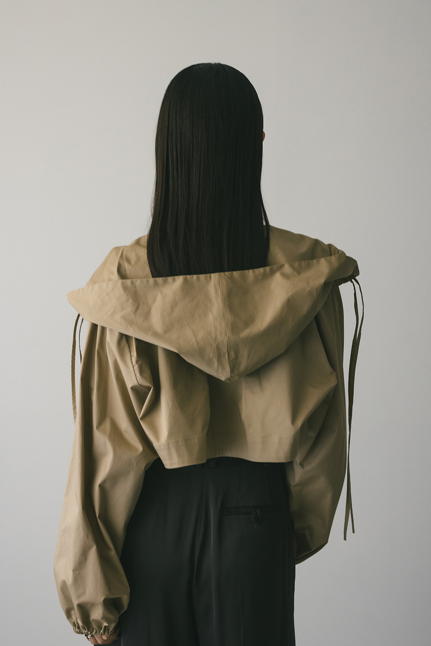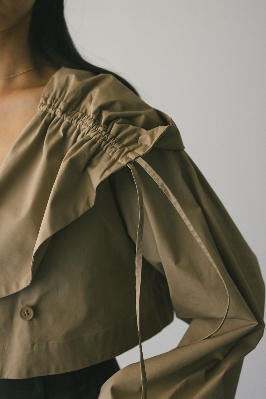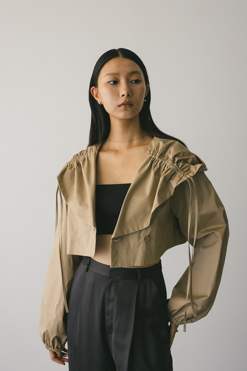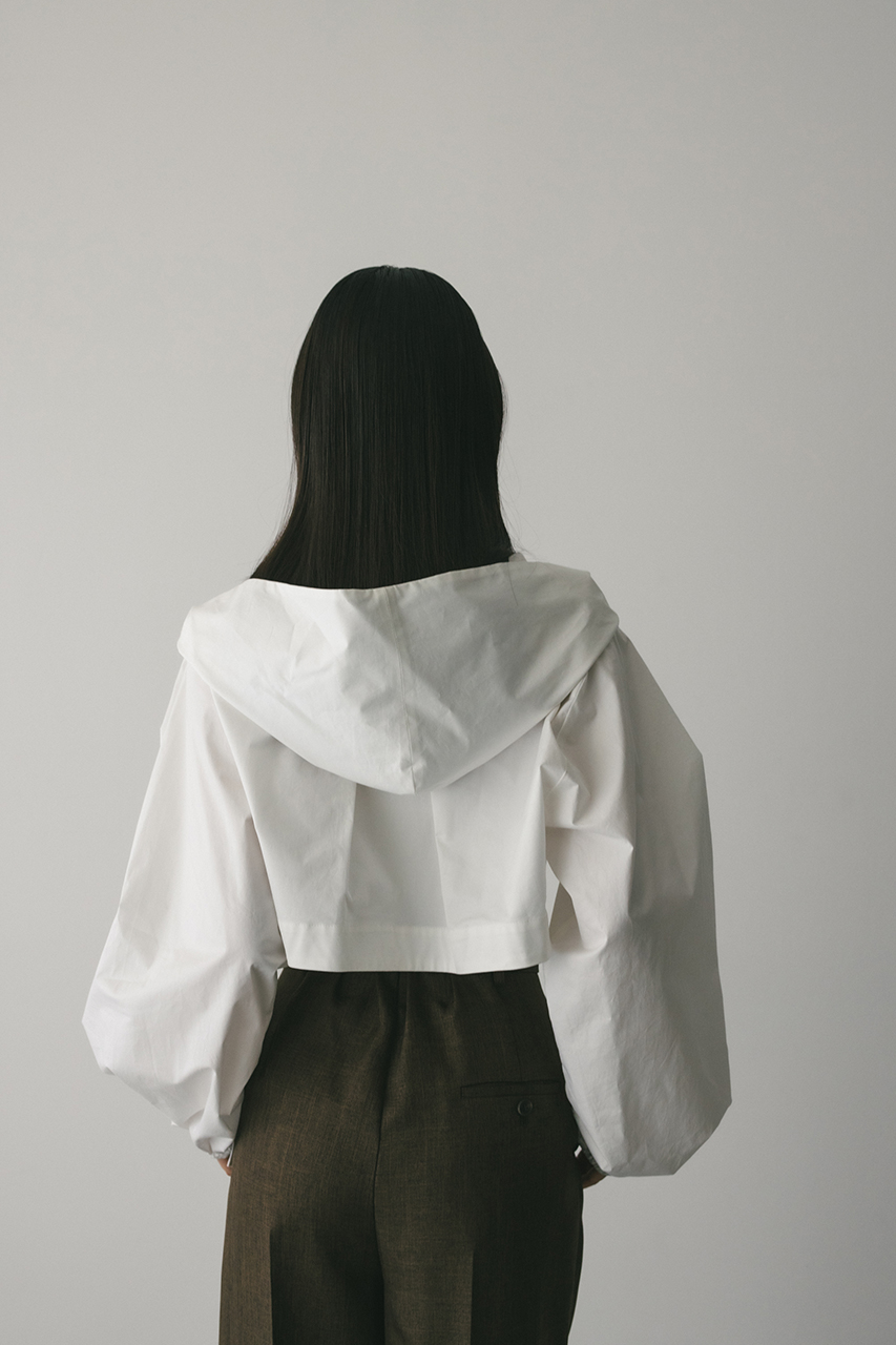 ハリ感のあるコットン素材で仕立てたデザインショートジャケット。大きなフードラペルとシャーリングが映える一枚です。バランスのとりやすいショート丈とゴム仕立てのボリュームスリーブがポイントです。透け感なし、ストレッチなし。