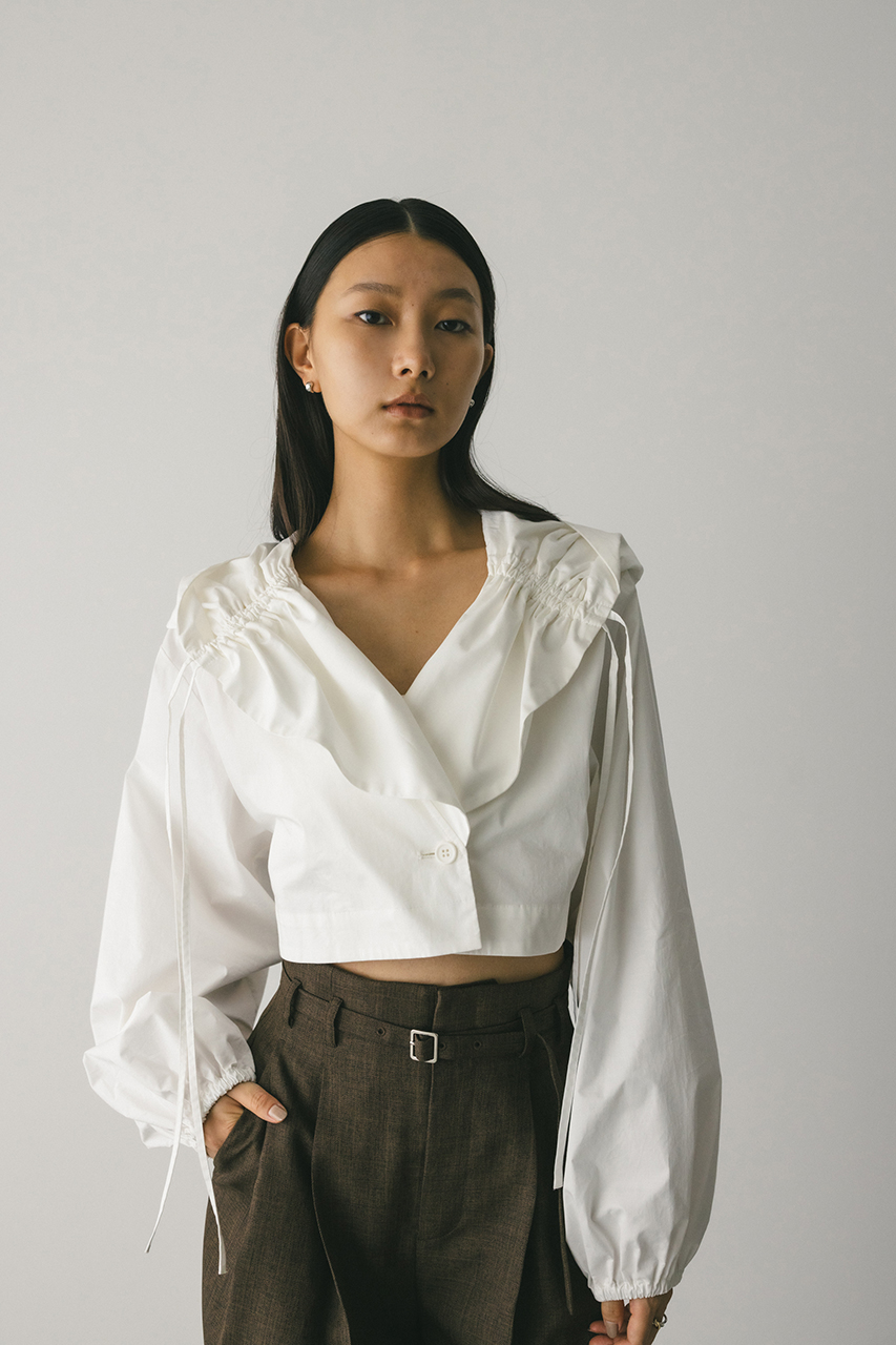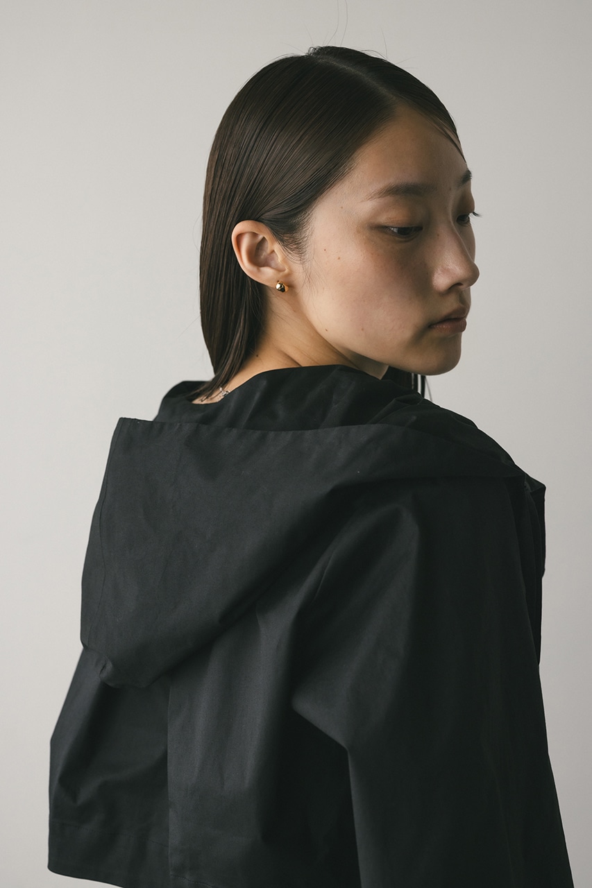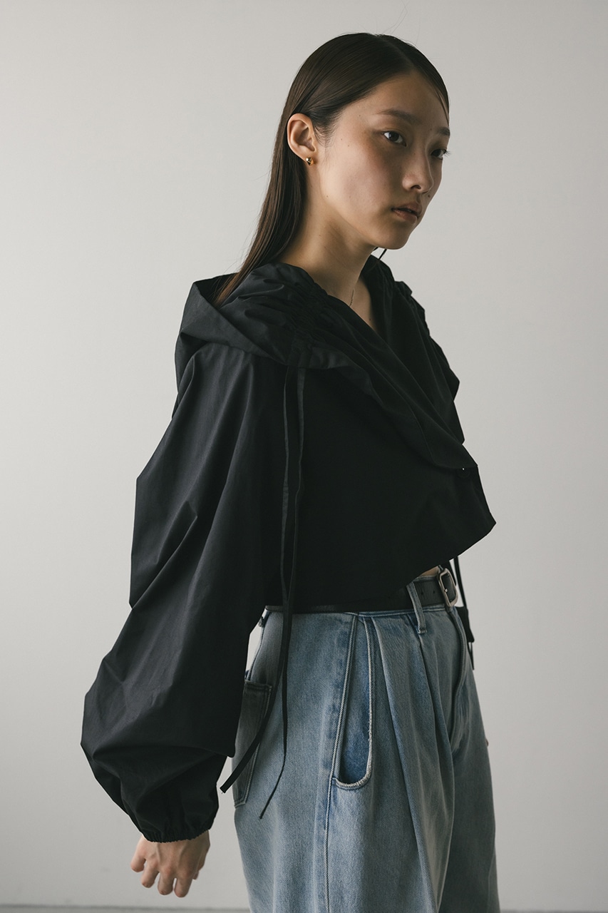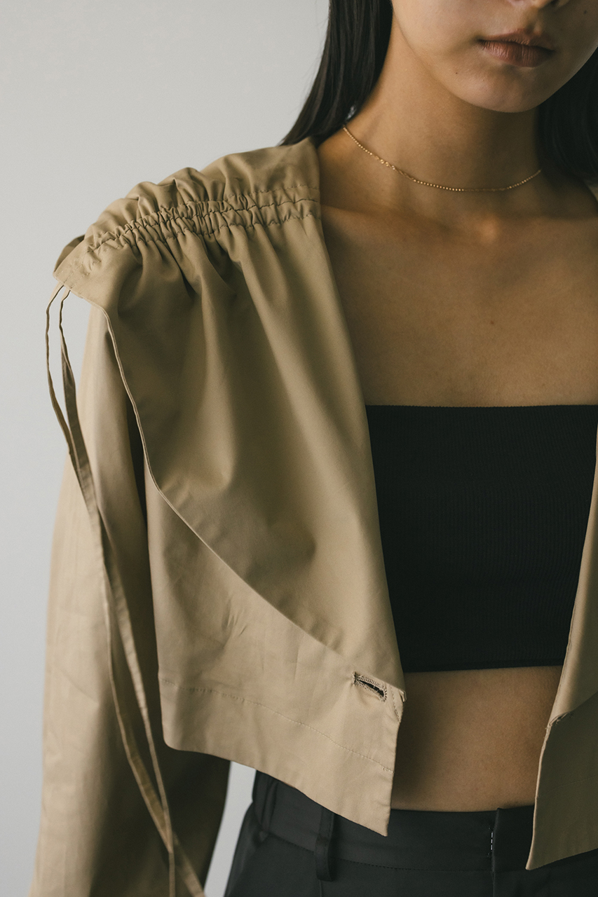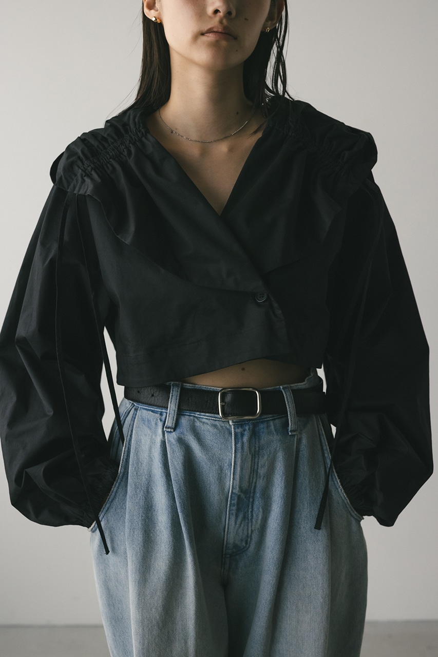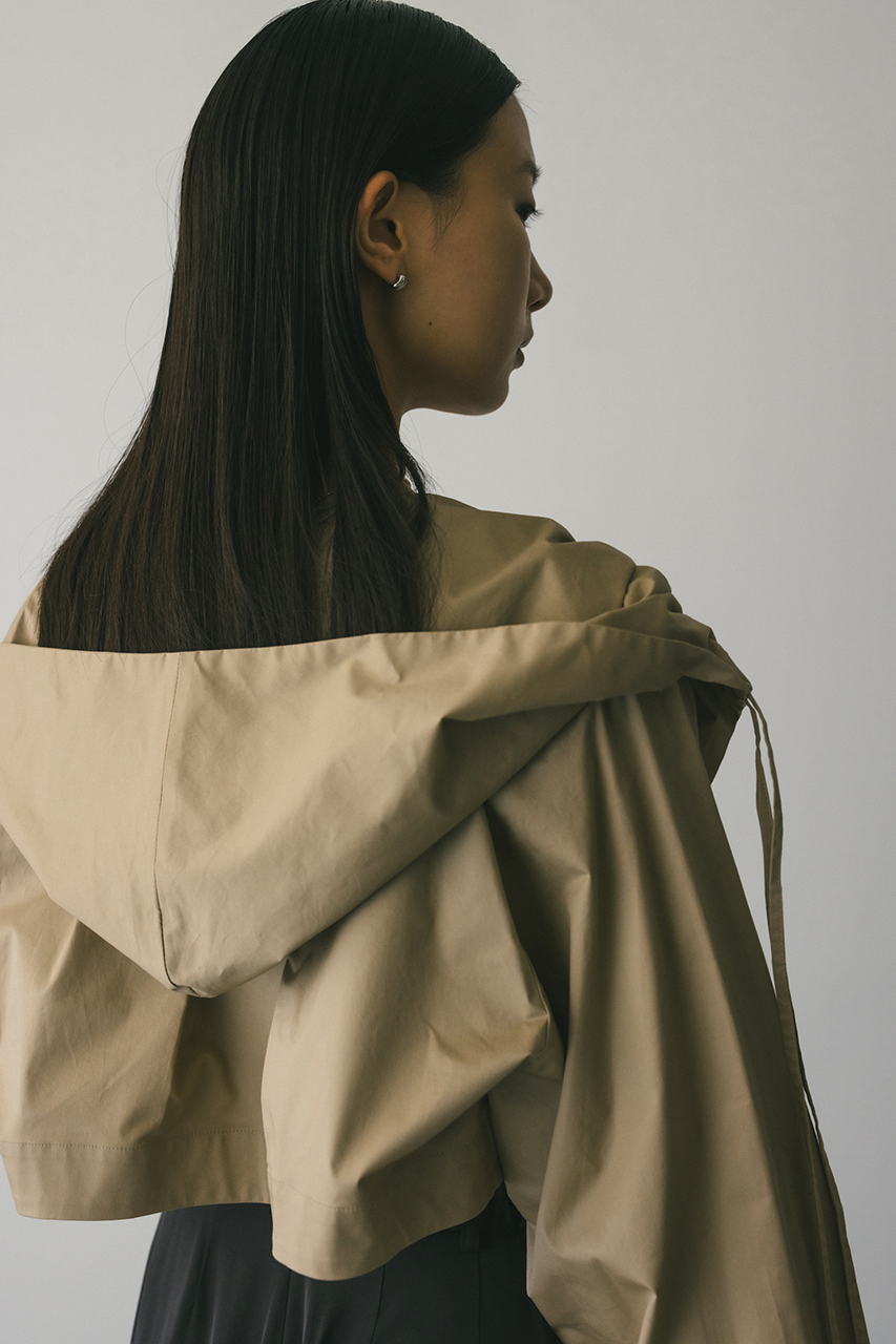 ハリ感のあるコットン素材で仕立てたデザインショートジャケット。大きなフードラペルとシャーリングが映える一枚です。バランスのとりやすいショート丈とゴム仕立てのボリュームスリーブがポイントです。透け感なし、ストレッチなし。