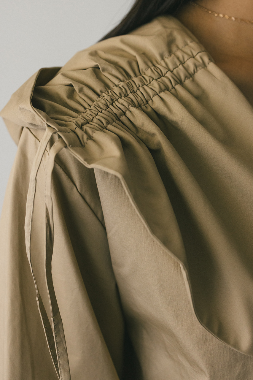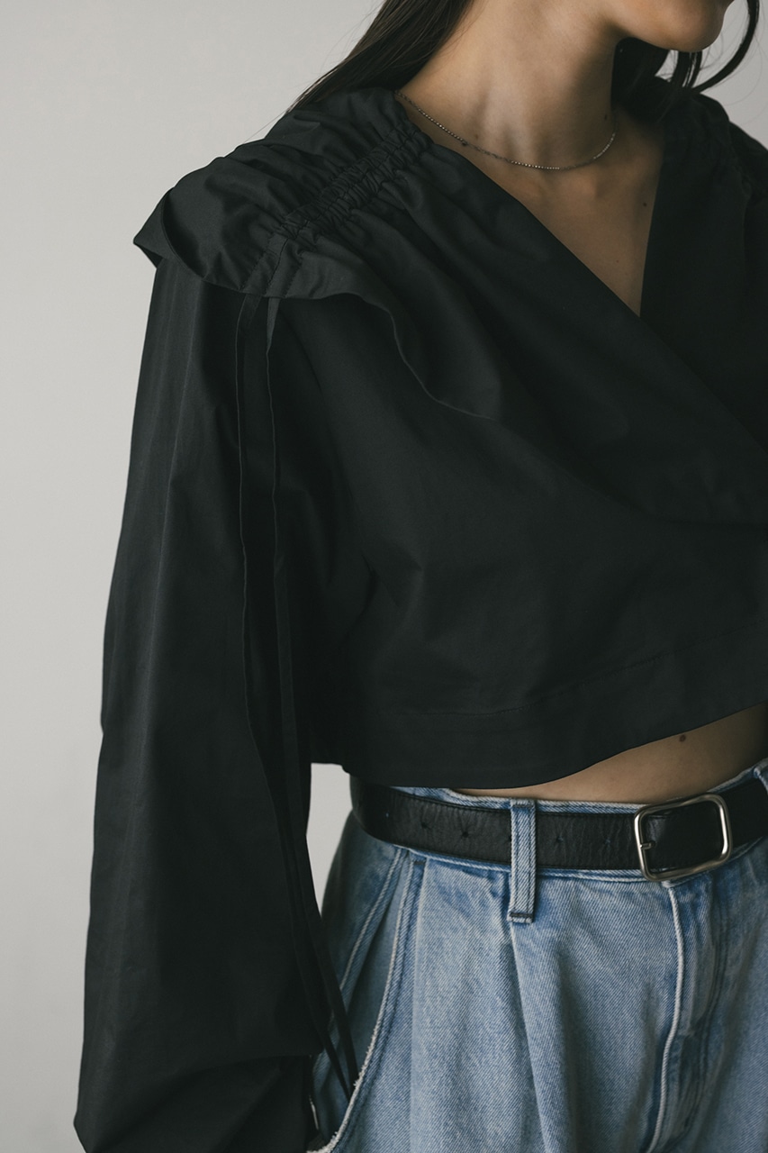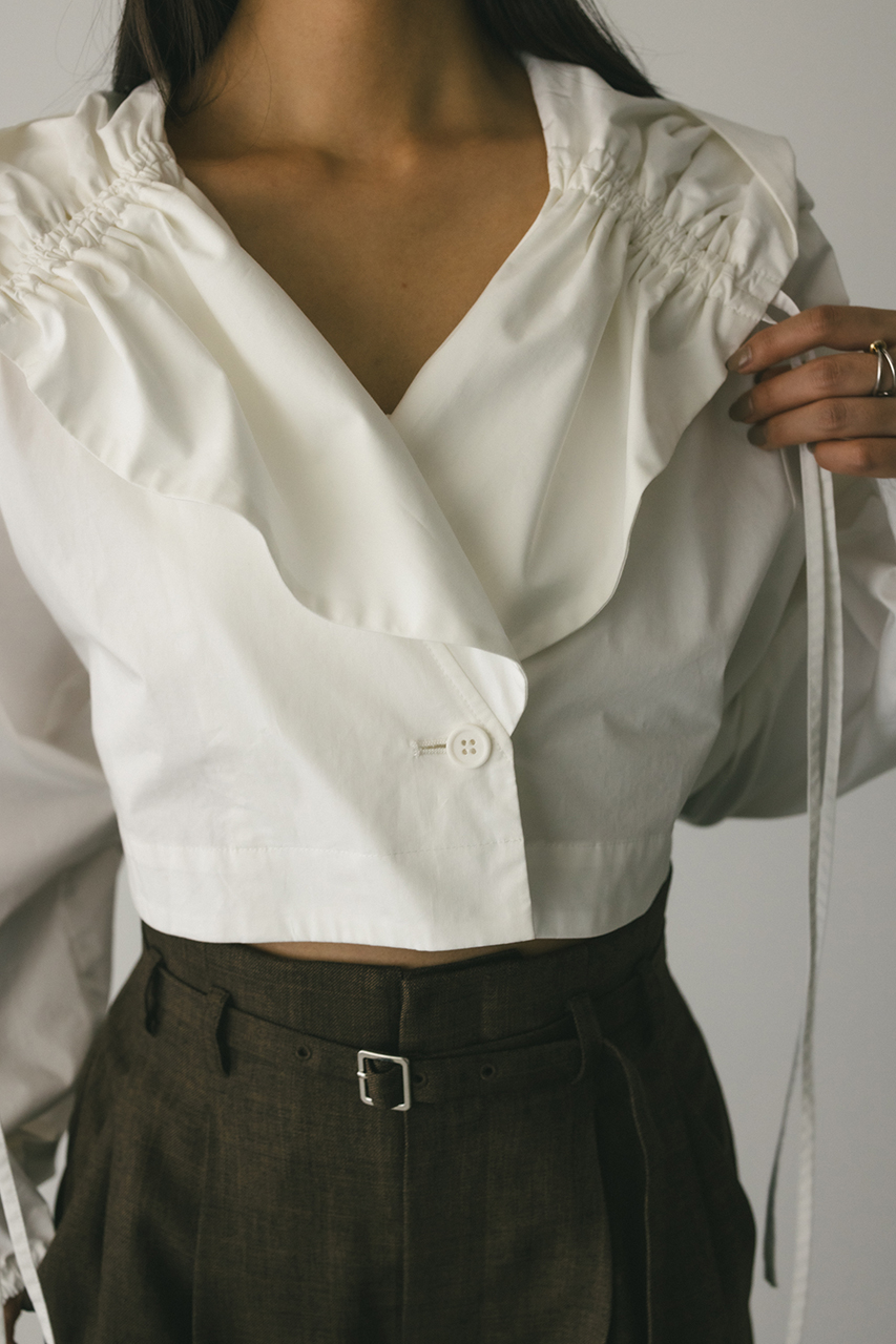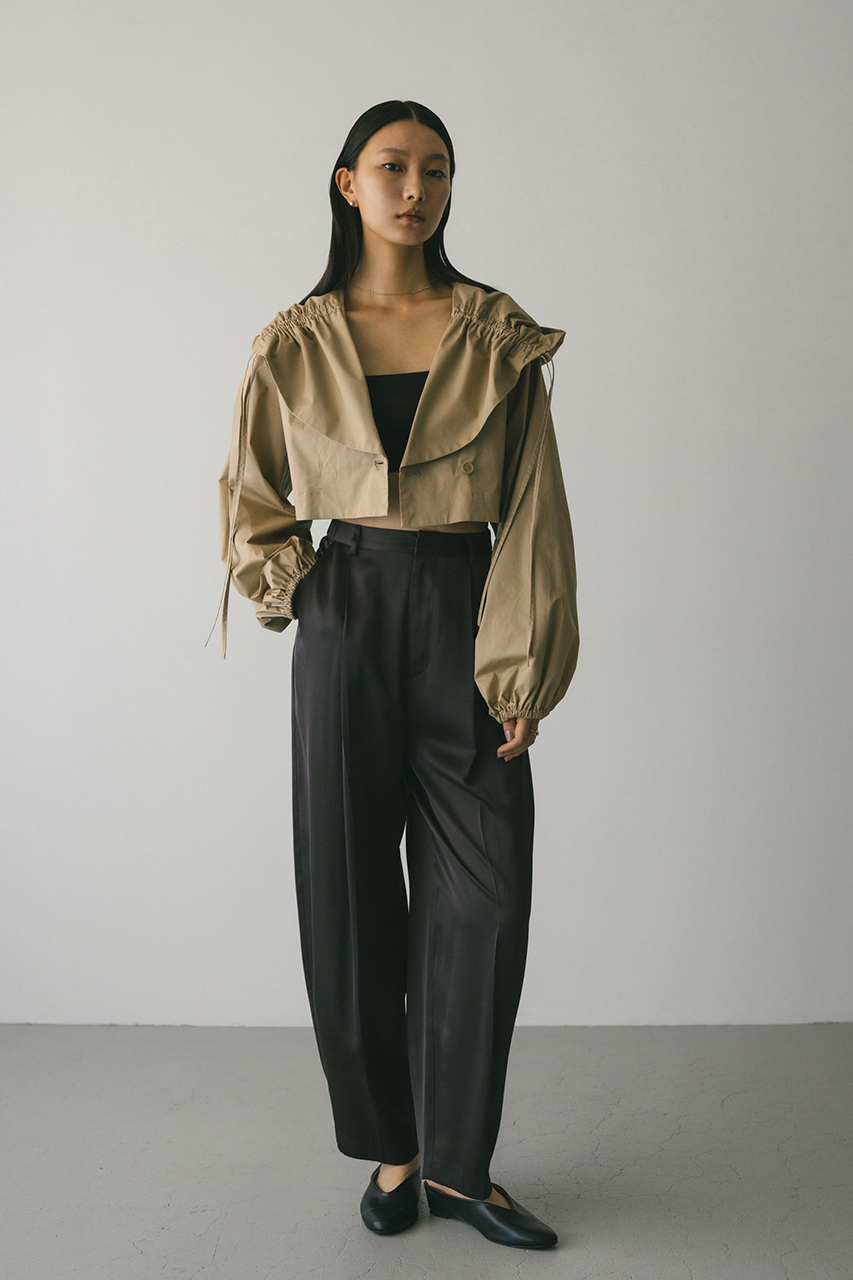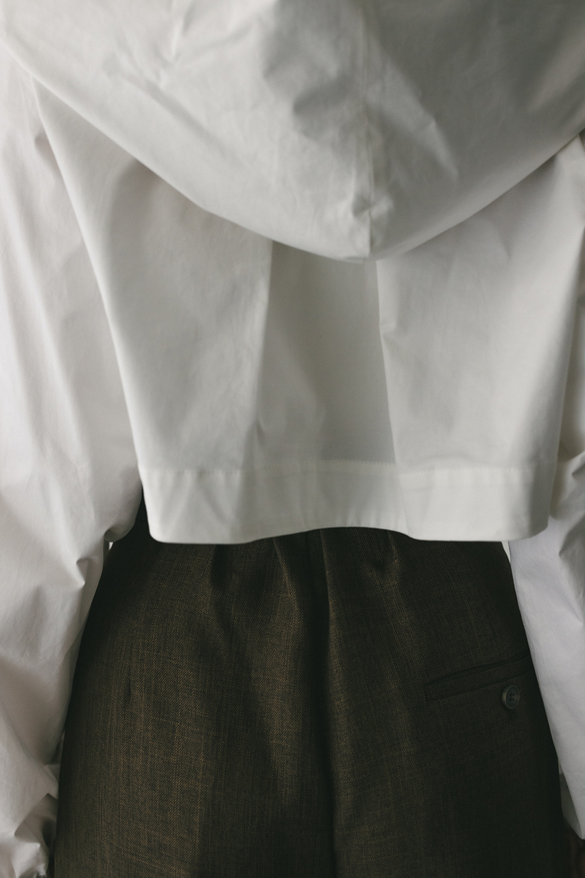 ハリ感のあるコットン素材で仕立てたデザインショートジャケット。大きなフードラペルとシャーリングが映える一枚です。バランスのとりやすいショート丈とゴム仕立てのボリュームスリーブがポイントです。透け感なし、ストレッチなし。