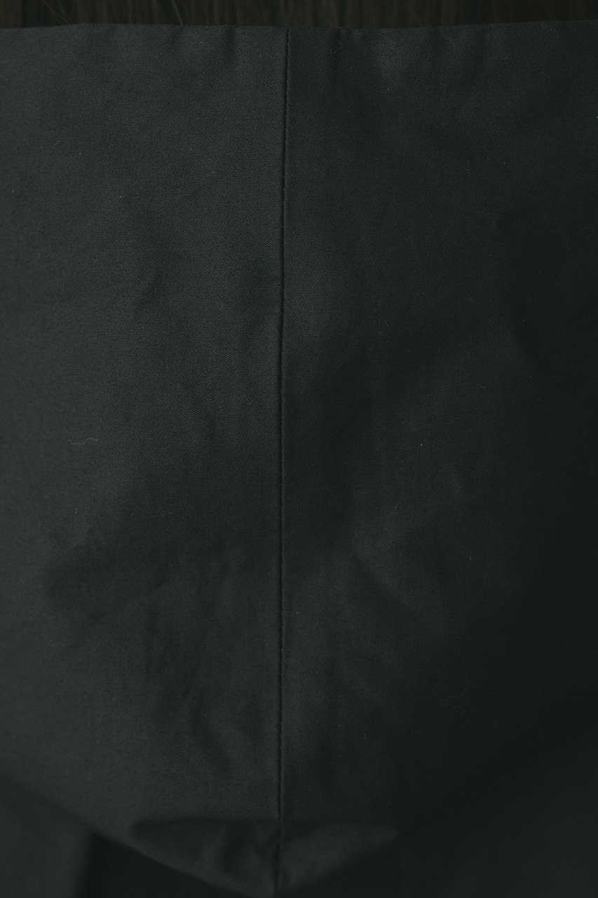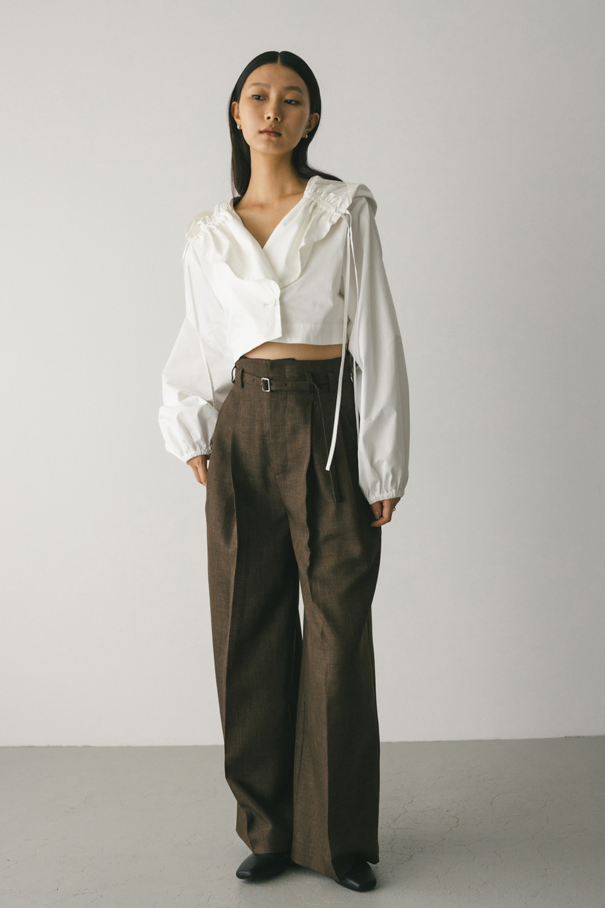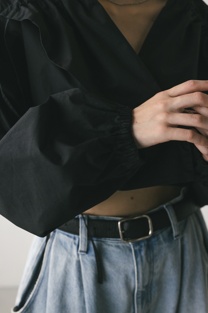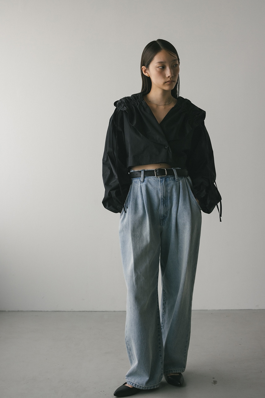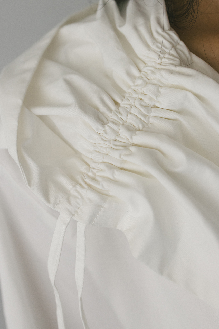 ハリ感のあるコットン素材で仕立てたデザインショートジャケット。大きなフードラペルとシャーリングが映える一枚です。バランスのとりやすいショート丈とゴム仕立てのボリュームスリーブがポイントです。透け感なし、ストレッチなし。