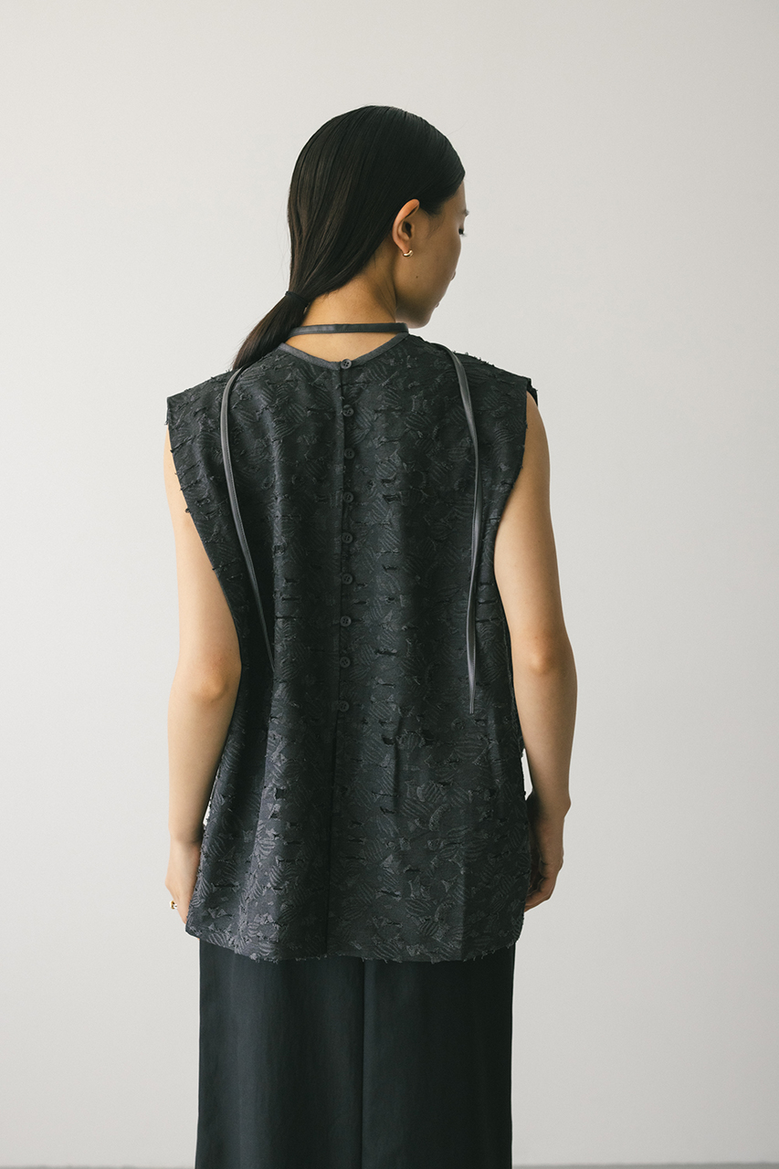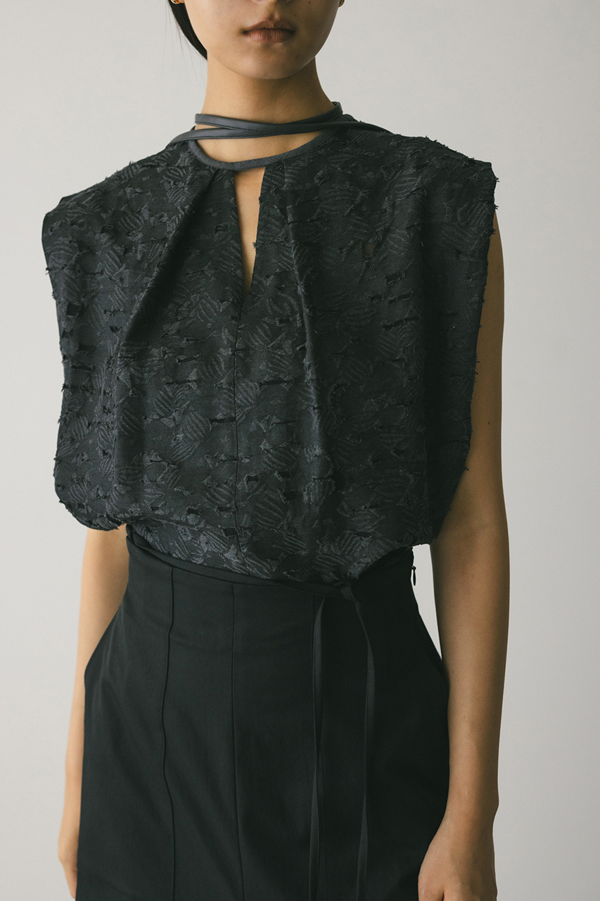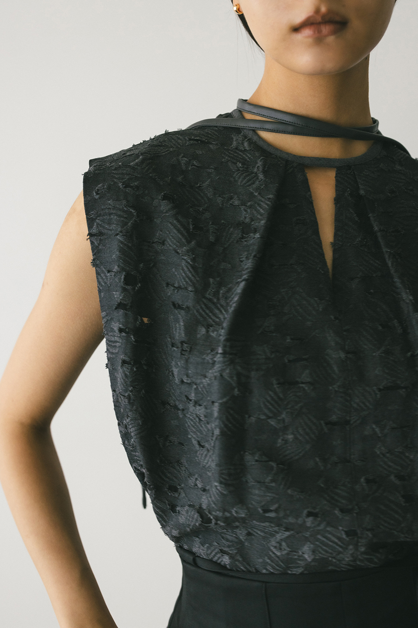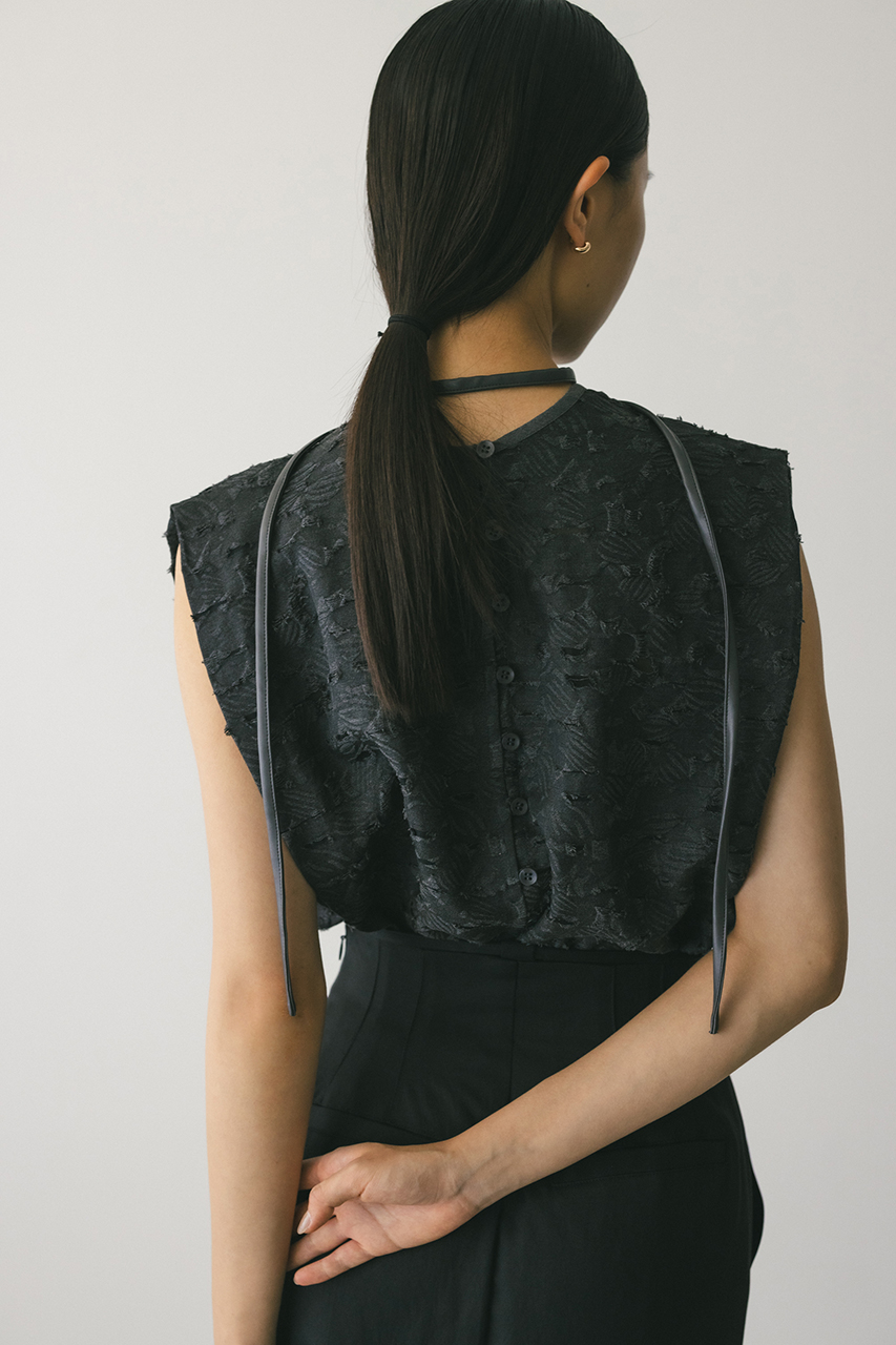 立体的なオパールジャガード素材で仕立てた前後2WAYで着用可能なトップス。アームに入れたショルダータックが二の腕ラインをカバーし、スタイリングにモード感をプラスします。ネックのレザーパイピングもデザインポイント。付属のフェイクレザー紐はチョーカーや、シルエット変化に使用いただけます。透け感あり、ストレッチなし。