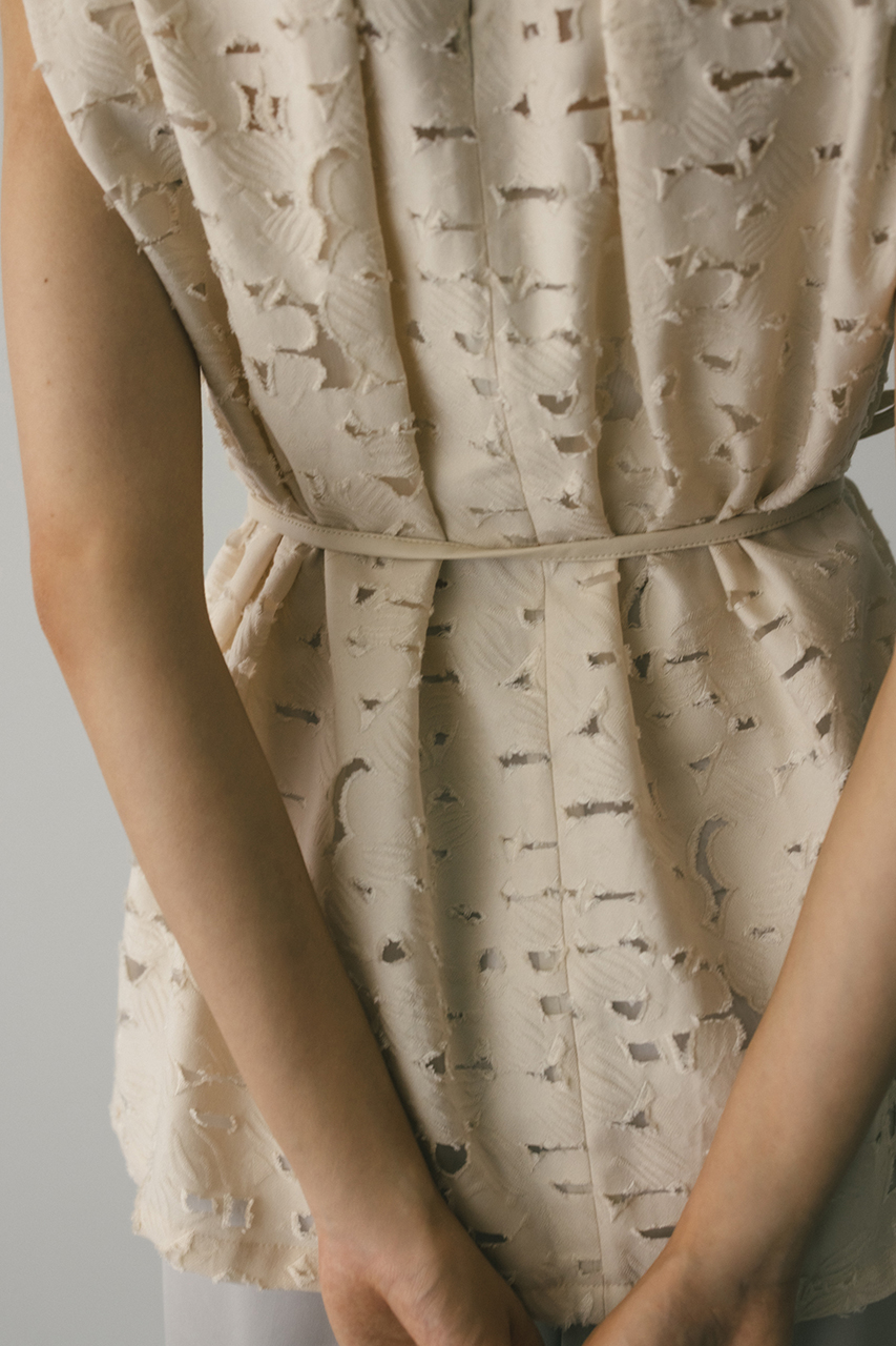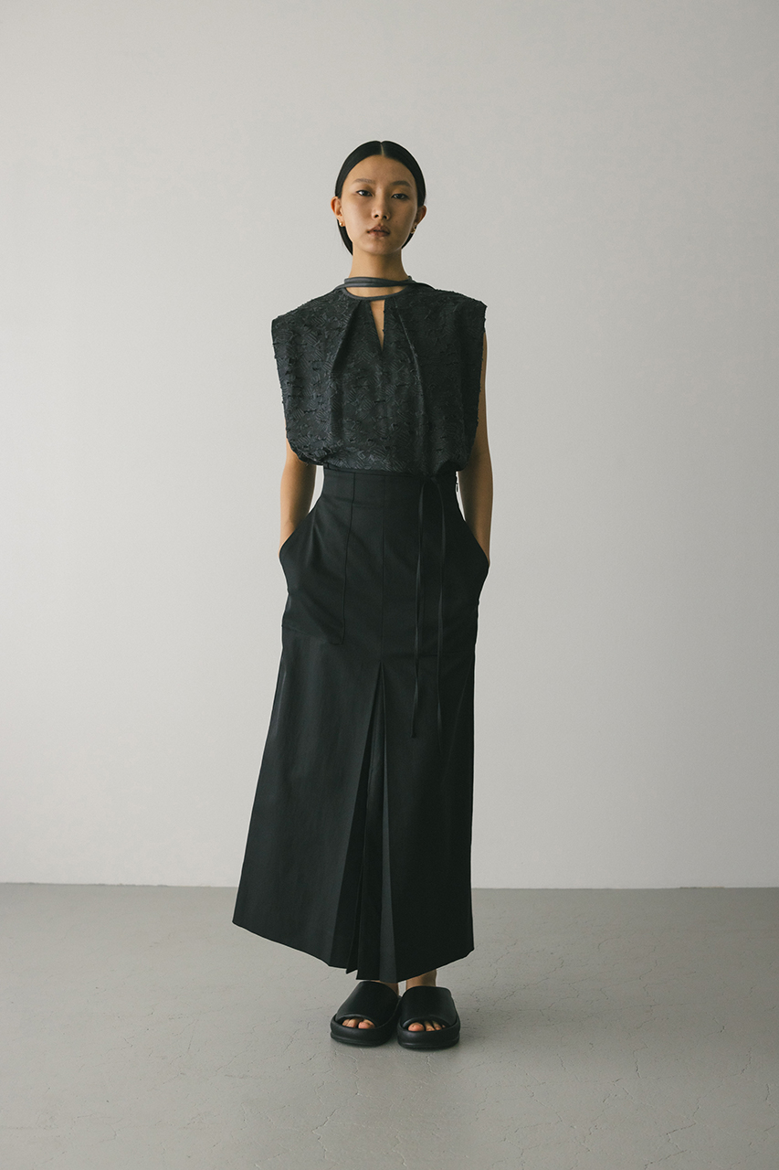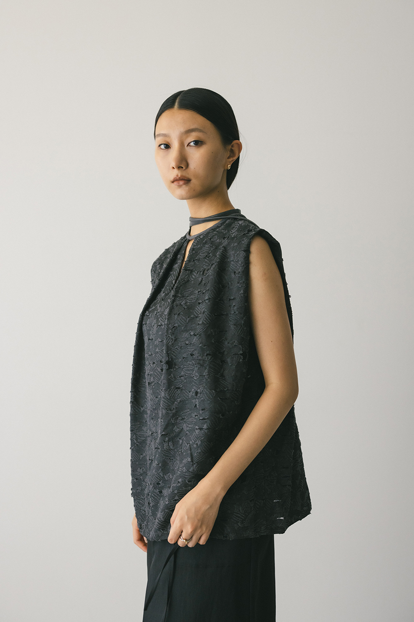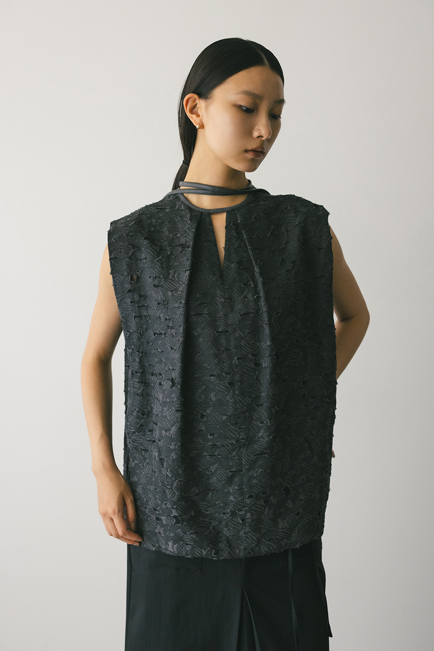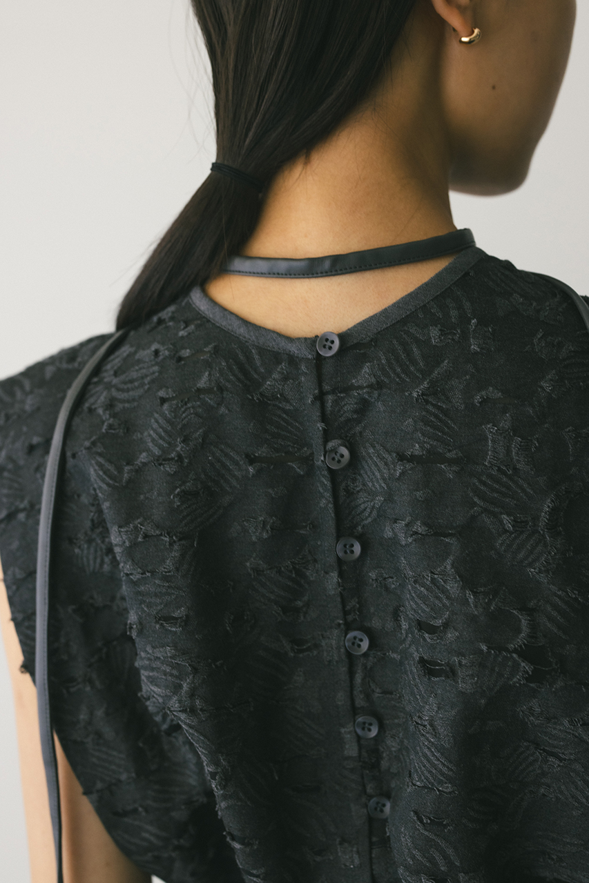 立体的なオパールジャガード素材で仕立てた前後2WAYで着用可能なトップス。アームに入れたショルダータックが二の腕ラインをカバーし、スタイリングにモード感をプラスします。ネックのレザーパイピングもデザインポイント。付属のフェイクレザー紐はチョーカーや、シルエット変化に使用いただけます。透け感あり、ストレッチなし。