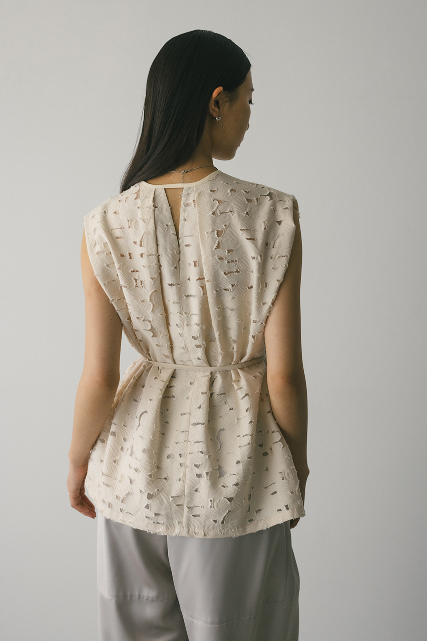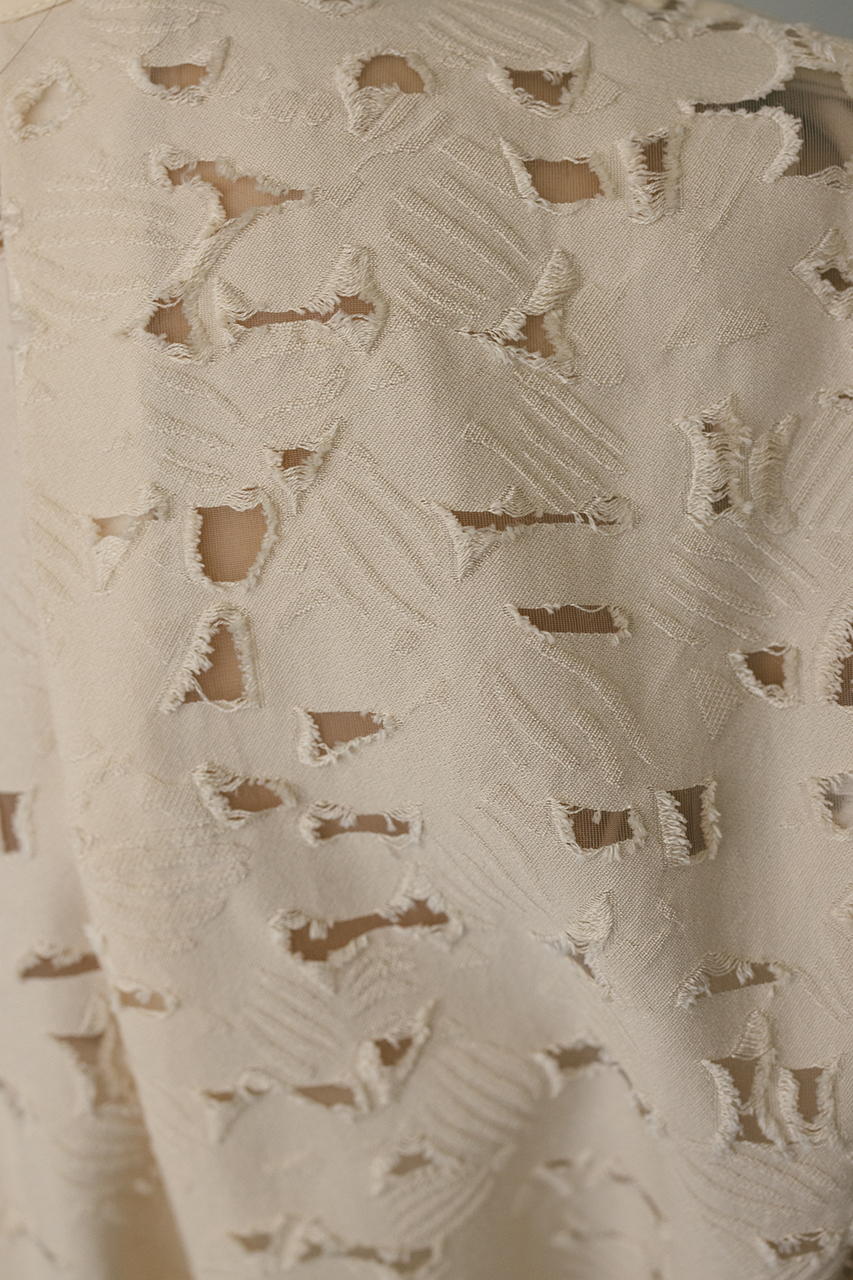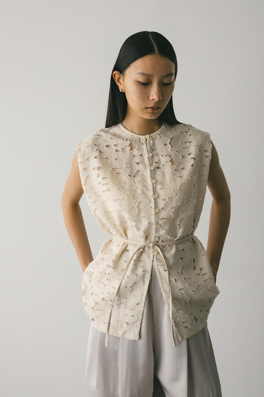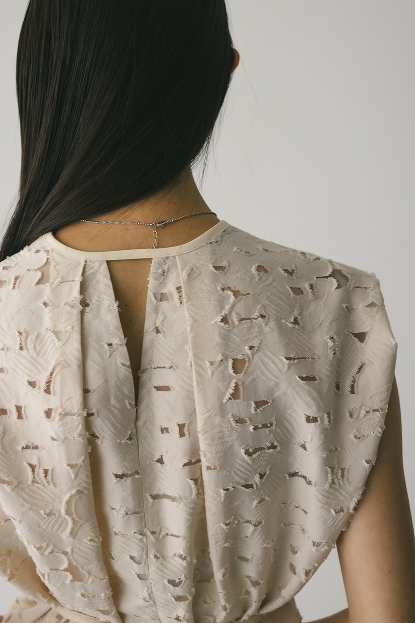 立体的なオパールジャガード素材で仕立てた前後2WAYで着用可能なトップス。アームに入れたショルダータックが二の腕ラインをカバーし、スタイリングにモード感をプラスします。ネックのレザーパイピングもデザインポイント。付属のフェイクレザー紐はチョーカーや、シルエット変化に使用いただけます。透け感あり、ストレッチなし。