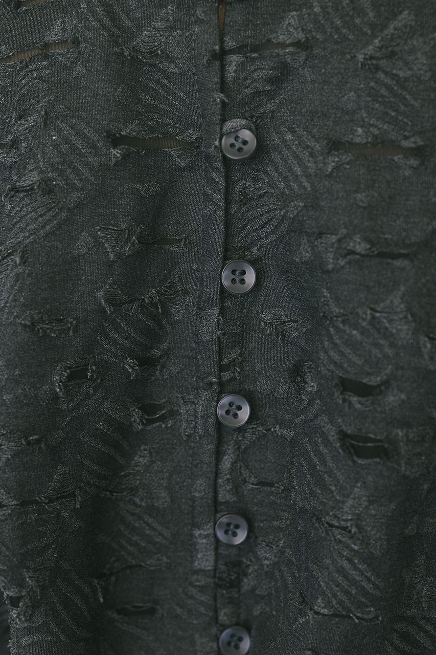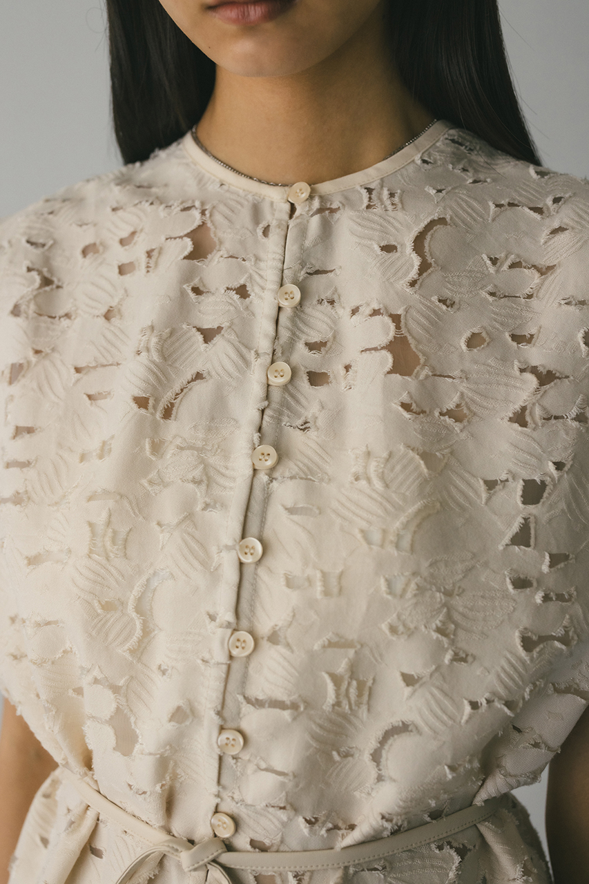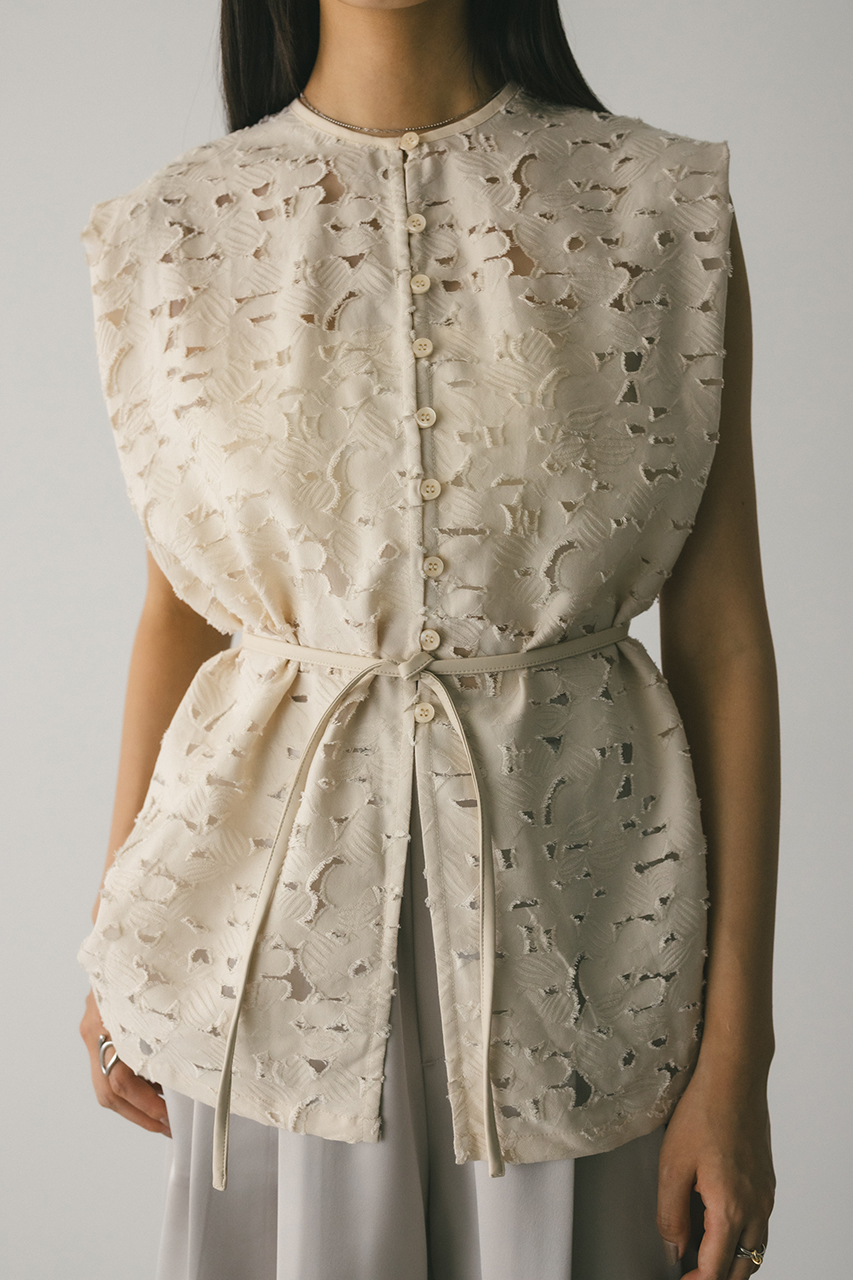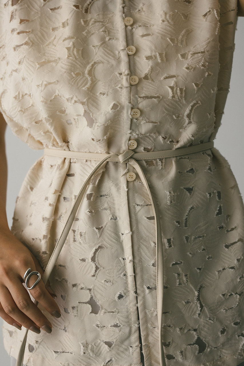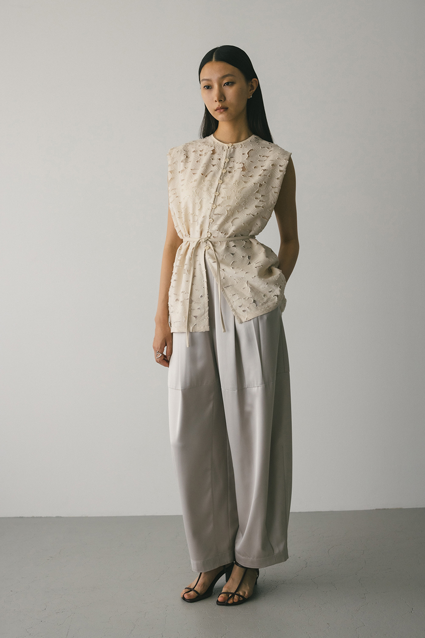 立体的なオパールジャガード素材で仕立てた前後2WAYで着用可能なトップス。アームに入れたショルダータックが二の腕ラインをカバーし、スタイリングにモード感をプラスします。ネックのレザーパイピングもデザインポイント。付属のフェイクレザー紐はチョーカーや、シルエット変化に使用いただけます。透け感あり、ストレッチなし。