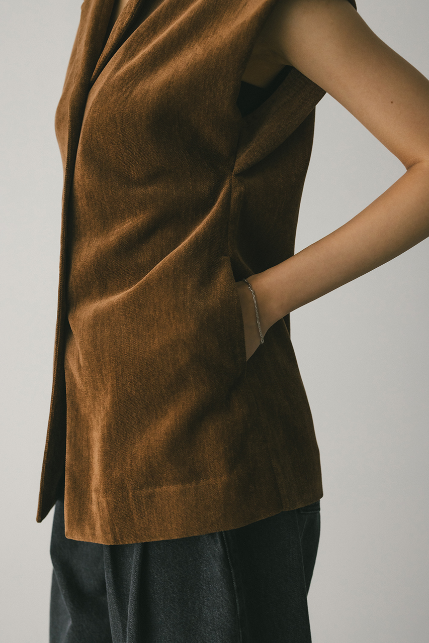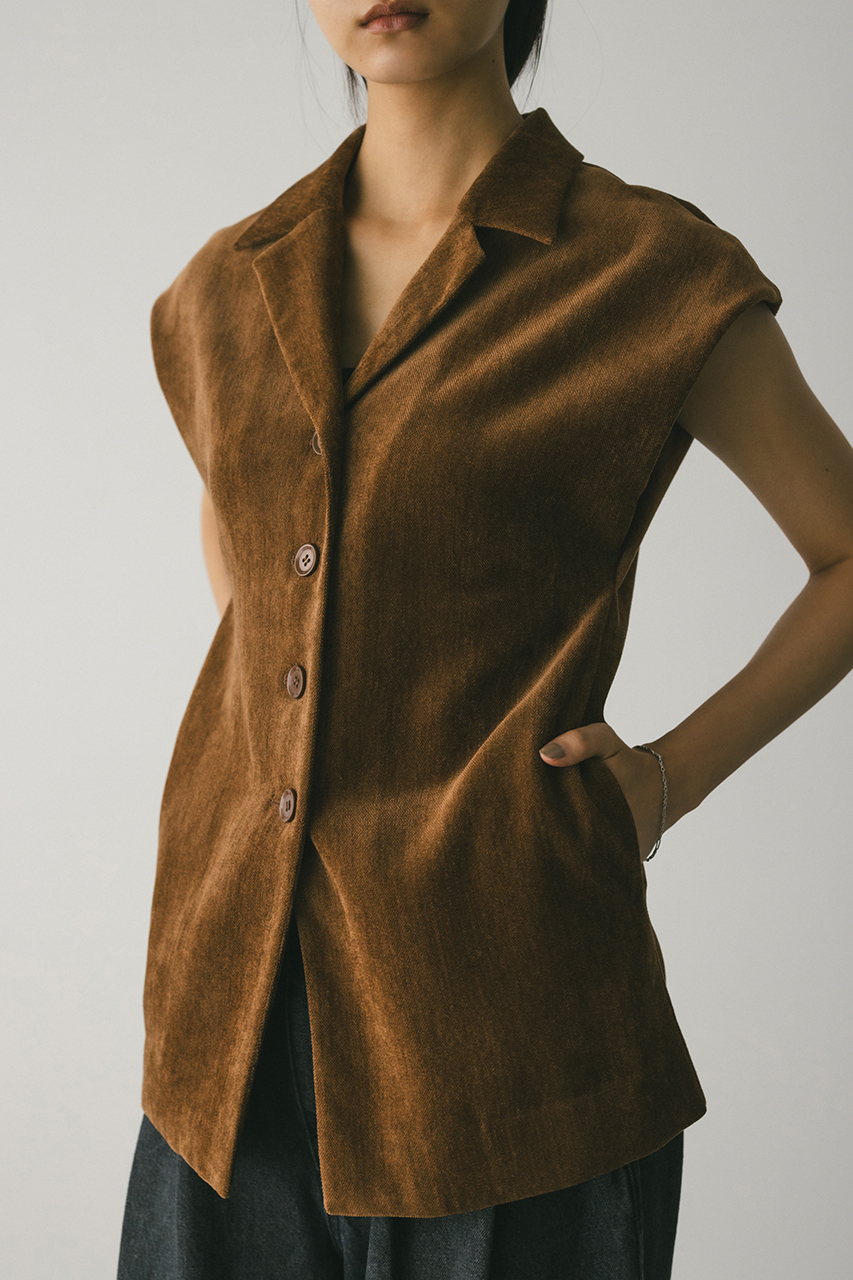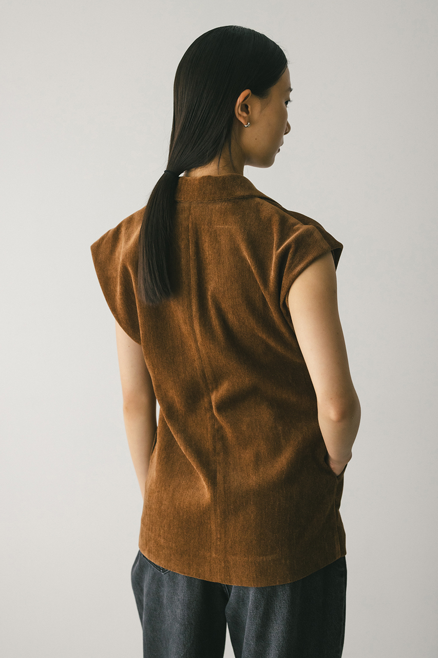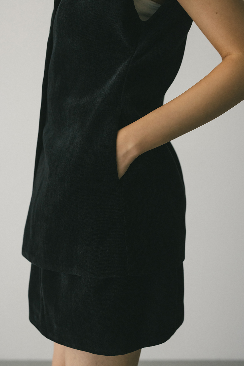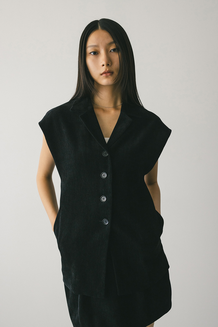 程よくハリがありながらもしなやかな風合いがポイントのベロア素材を使用したベスト。ヒップをカバーしてくれるロング丈とバランスのとりやすいボタン位置、肩からウエストにつなげたタックがデザインポイント。美しいシルエットでスタイルアップに導きます。インナー次第でロングシーズン着用頂けます。500IAS31-1661(ベロアミニスカートパンツ)とセットアップ着用可能。透け感なし、ストレッチなし。