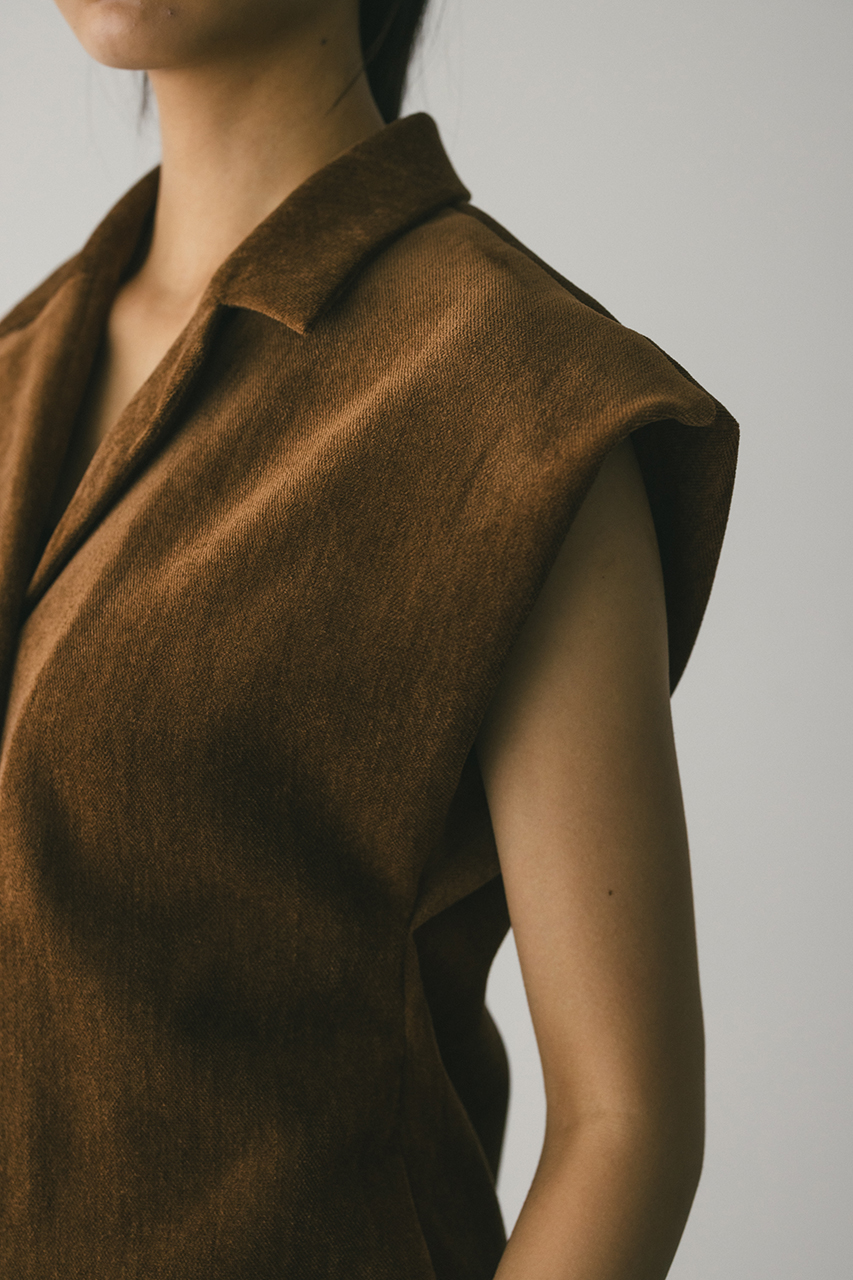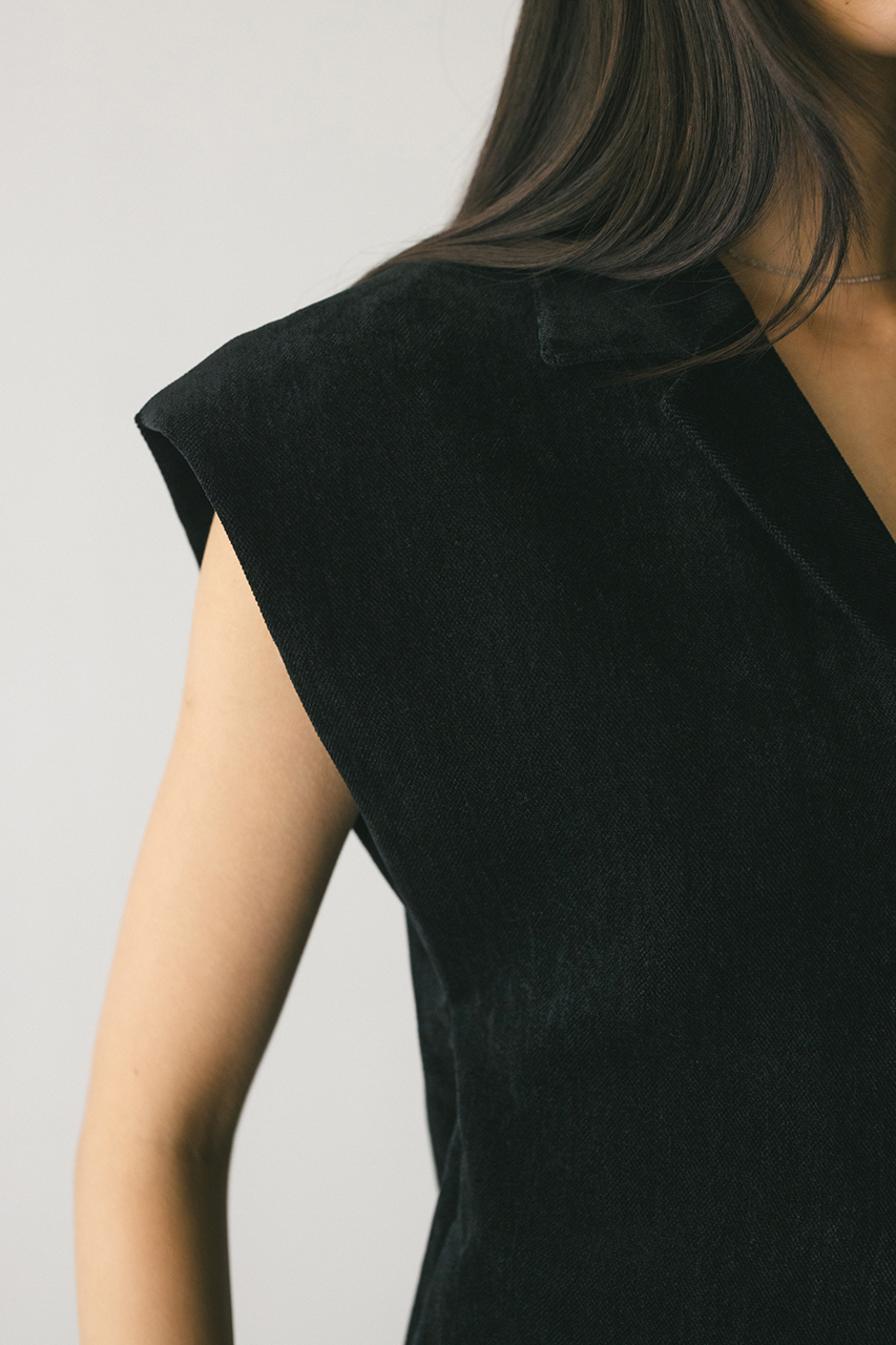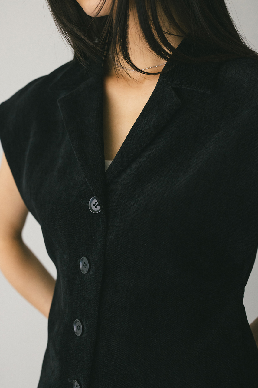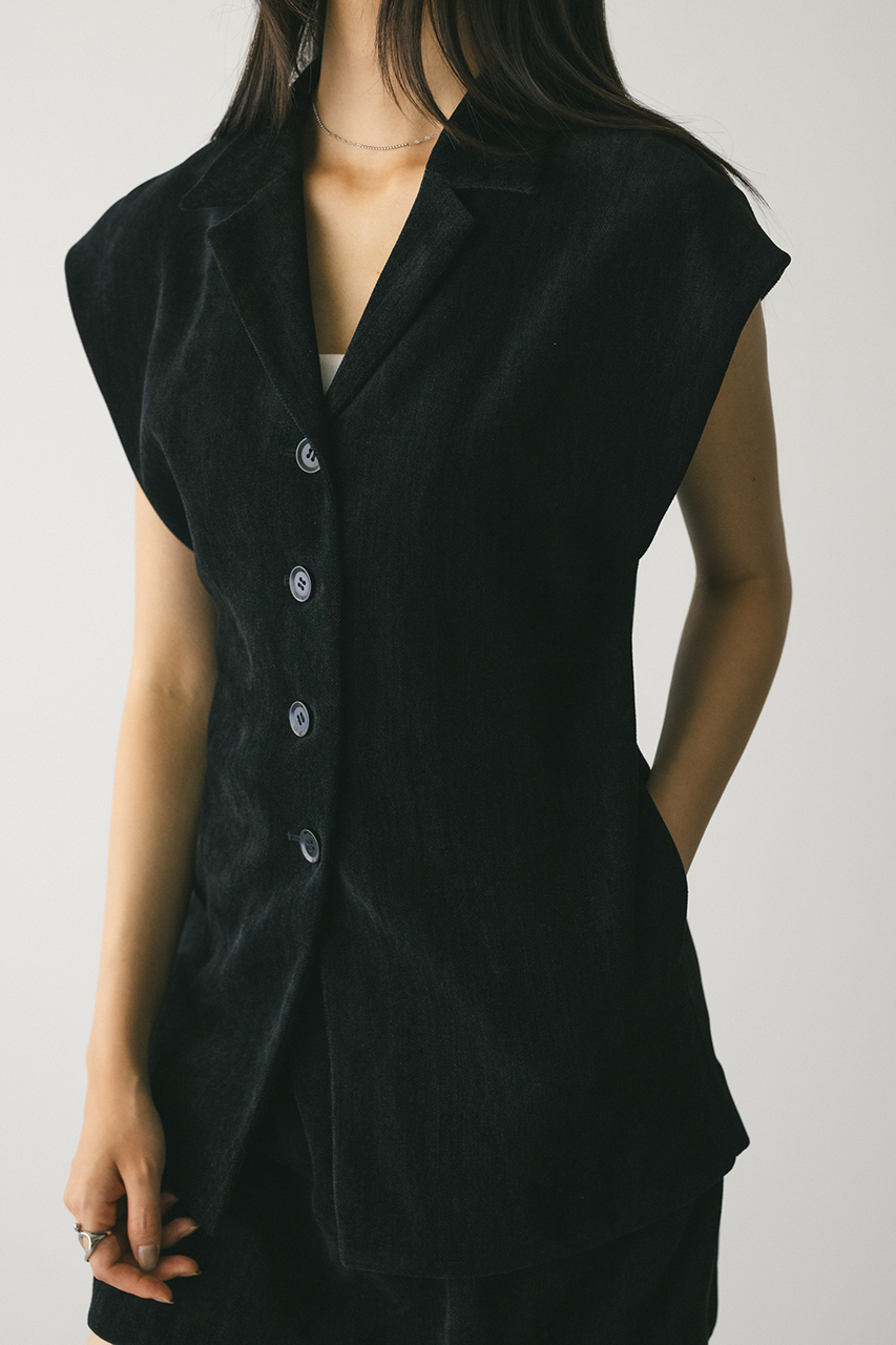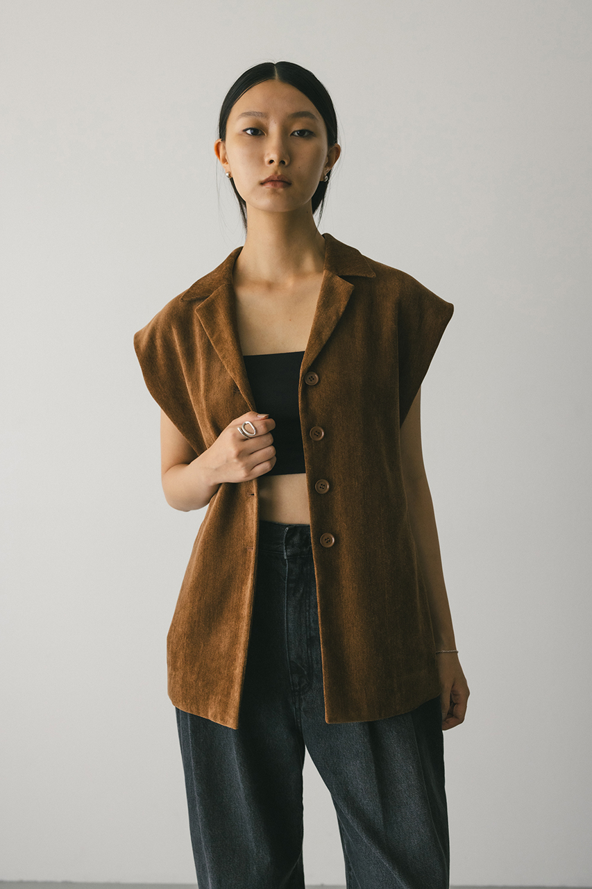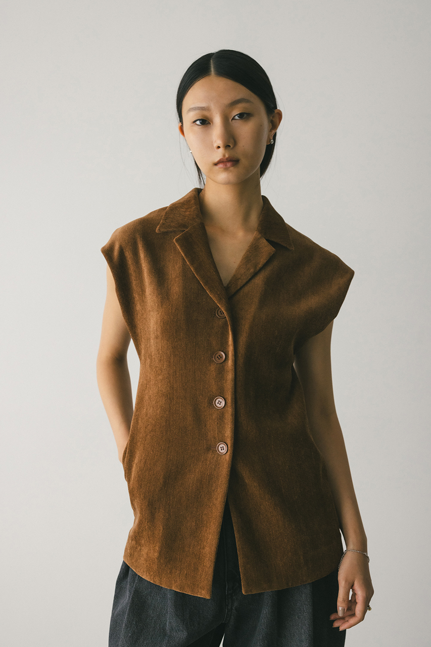 程よくハリがありながらもしなやかな風合いがポイントのベロア素材を使用したベスト。ヒップをカバーしてくれるロング丈とバランスのとりやすいボタン位置、肩からウエストにつなげたタックがデザインポイント。美しいシルエットでスタイルアップに導きます。インナー次第でロングシーズン着用頂けます。500IAS31-1661(ベロアミニスカートパンツ)とセットアップ着用可能。透け感なし、ストレッチなし。