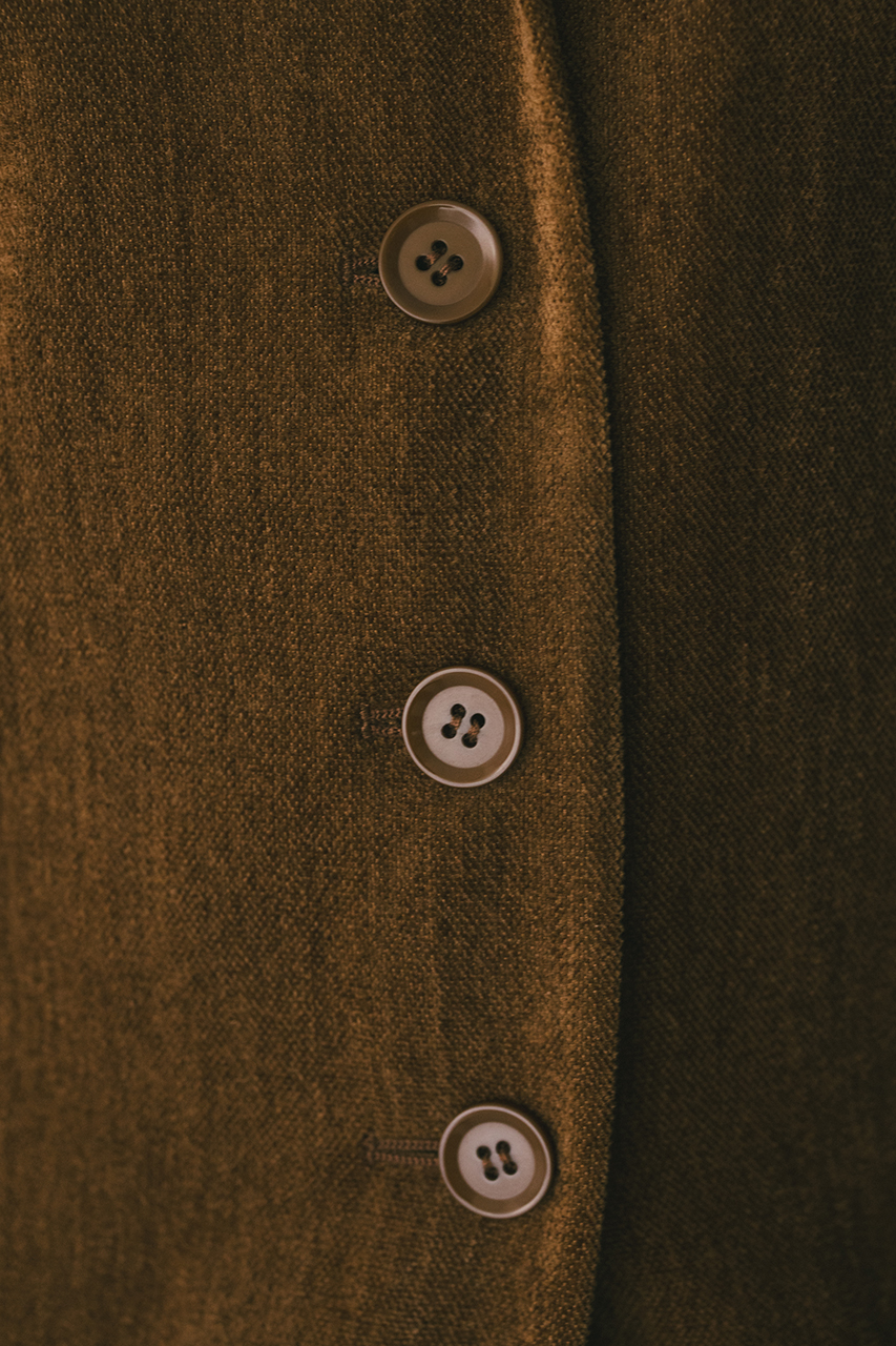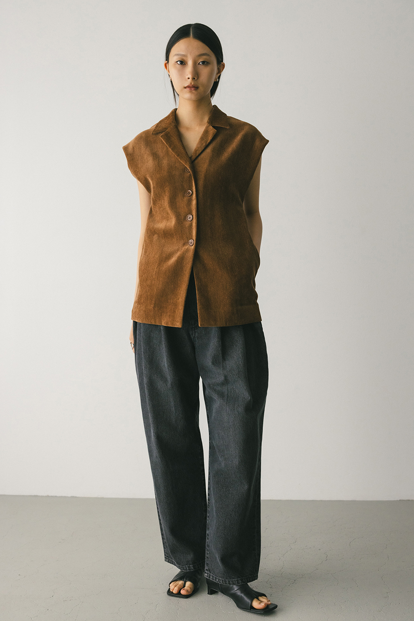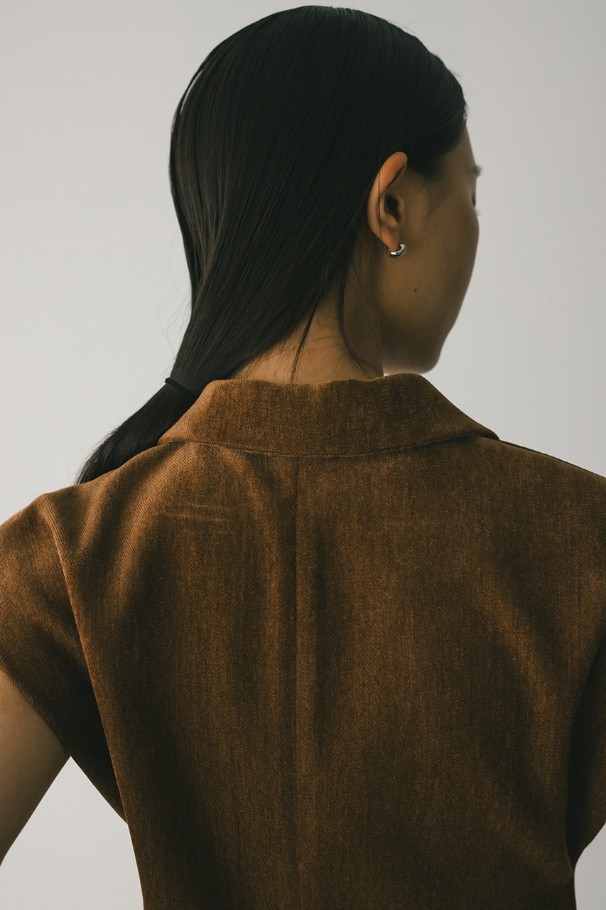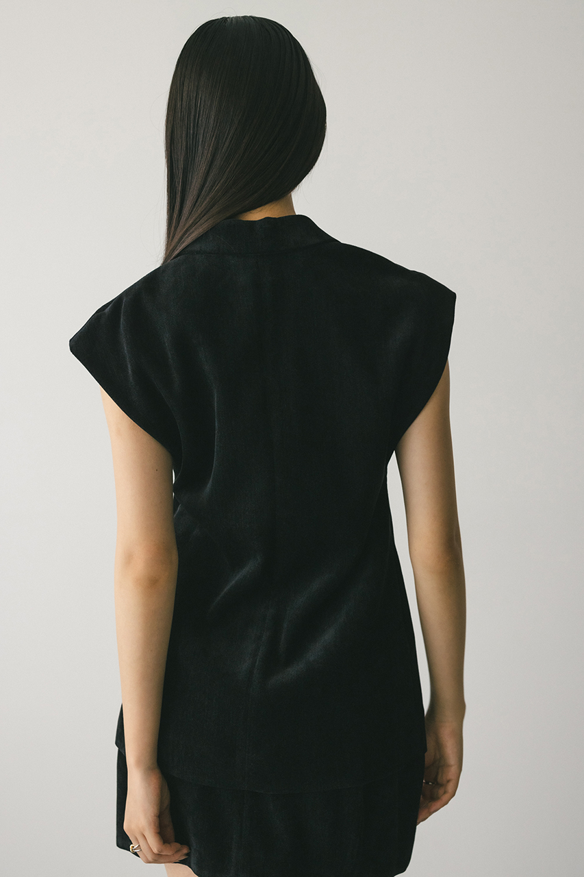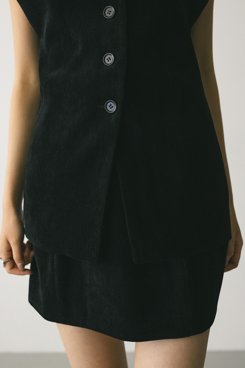 程よくハリがありながらもしなやかな風合いがポイントのベロア素材を使用したベスト。ヒップをカバーしてくれるロング丈とバランスのとりやすいボタン位置、肩からウエストにつなげたタックがデザインポイント。美しいシルエットでスタイルアップに導きます。インナー次第でロングシーズン着用頂けます。500IAS31-1661(ベロアミニスカートパンツ)とセットアップ着用可能。透け感なし、ストレッチなし。