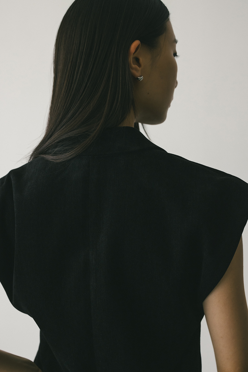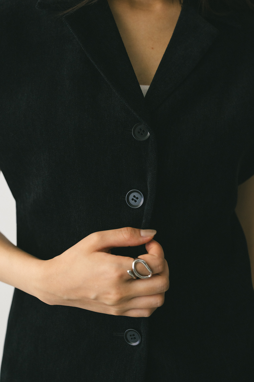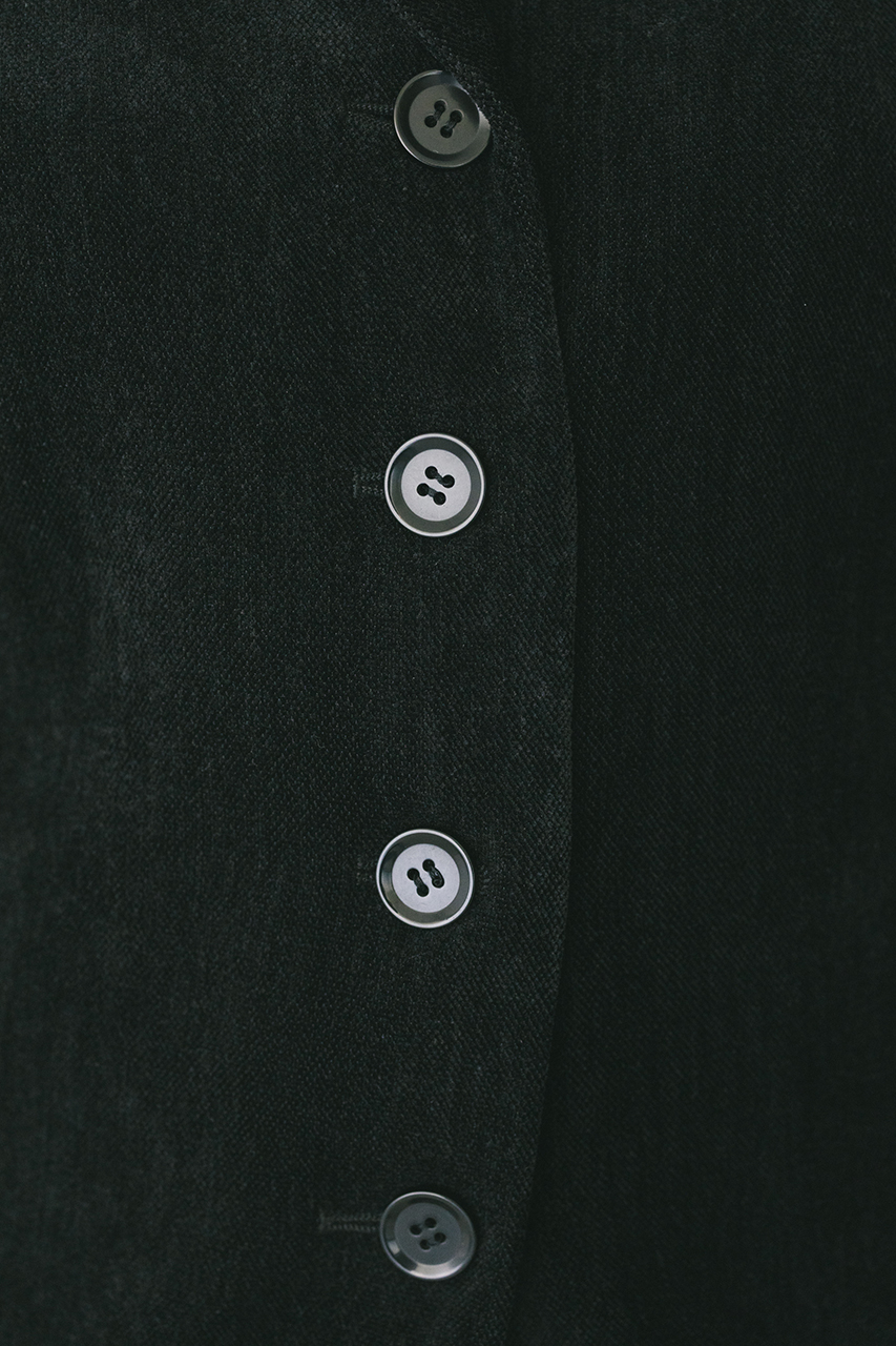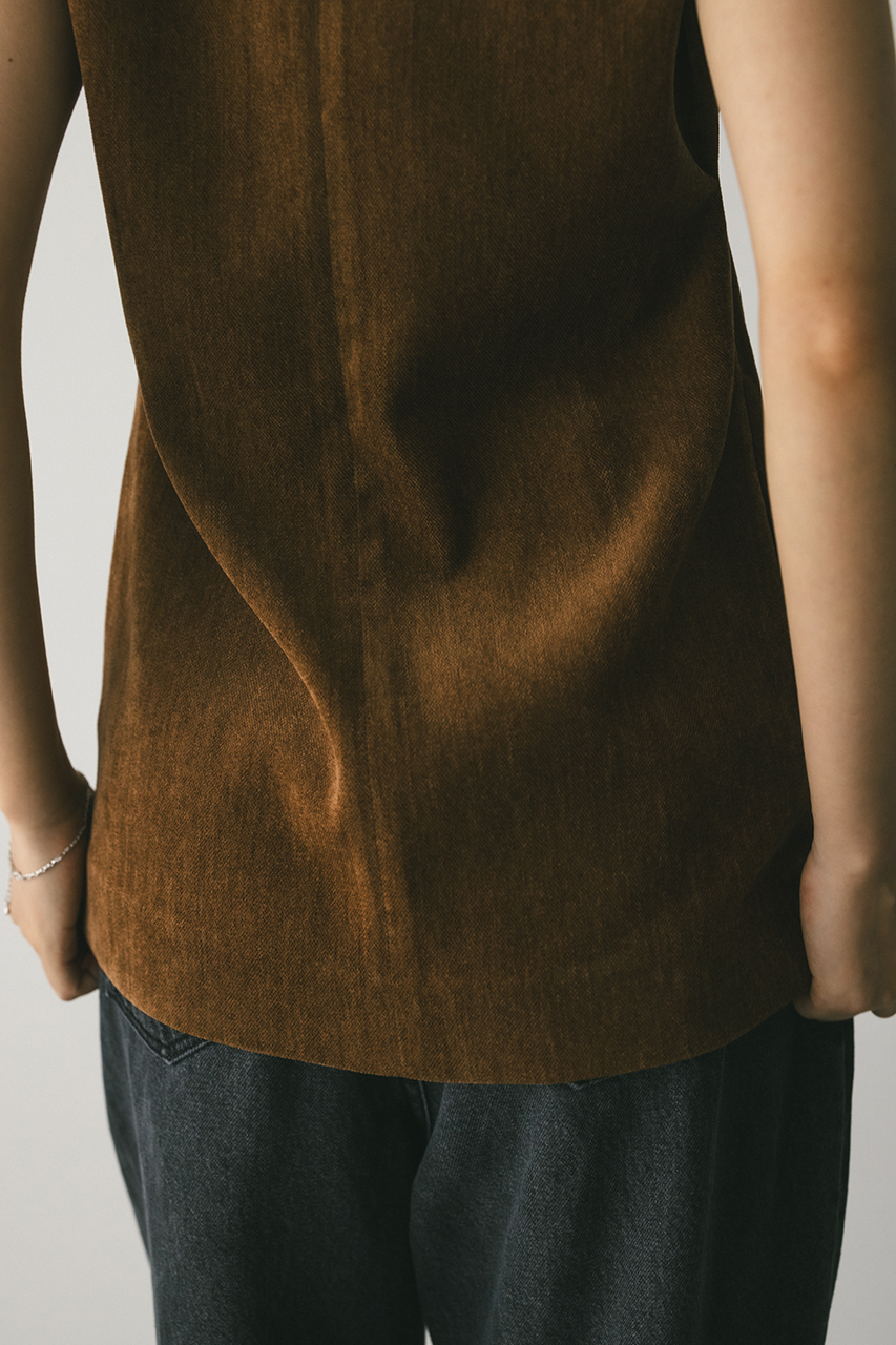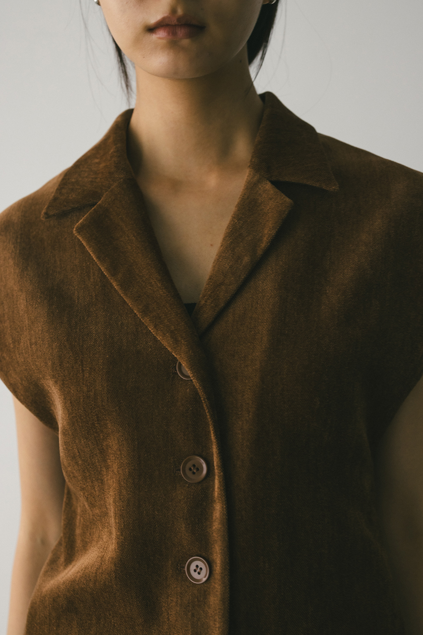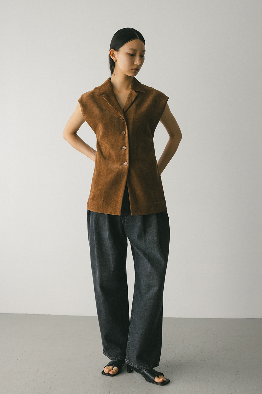 程よくハリがありながらもしなやかな風合いがポイントのベロア素材を使用したベスト。ヒップをカバーしてくれるロング丈とバランスのとりやすいボタン位置、肩からウエストにつなげたタックがデザインポイント。美しいシルエットでスタイルアップに導きます。インナー次第でロングシーズン着用頂けます。500IAS31-1661(ベロアミニスカートパンツ)とセットアップ着用可能。透け感なし、ストレッチなし。