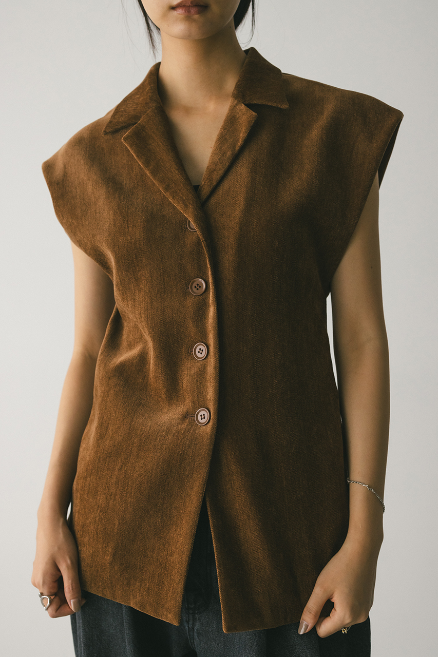 程よくハリがありながらもしなやかな風合いがポイントのベロア素材を使用したベスト。ヒップをカバーしてくれるロング丈とバランスのとりやすいボタン位置、肩からウエストにつなげたタックがデザインポイント。美しいシルエットでスタイルアップに導きます。インナー次第でロングシーズン着用頂けます。500IAS31-1661(ベロアミニスカートパンツ)とセットアップ着用可能。透け感なし、ストレッチなし。
