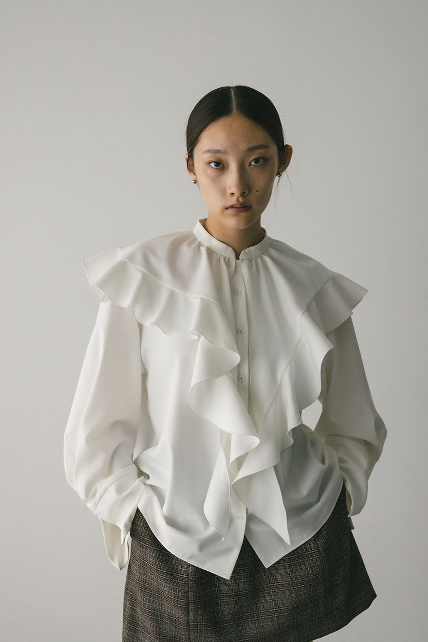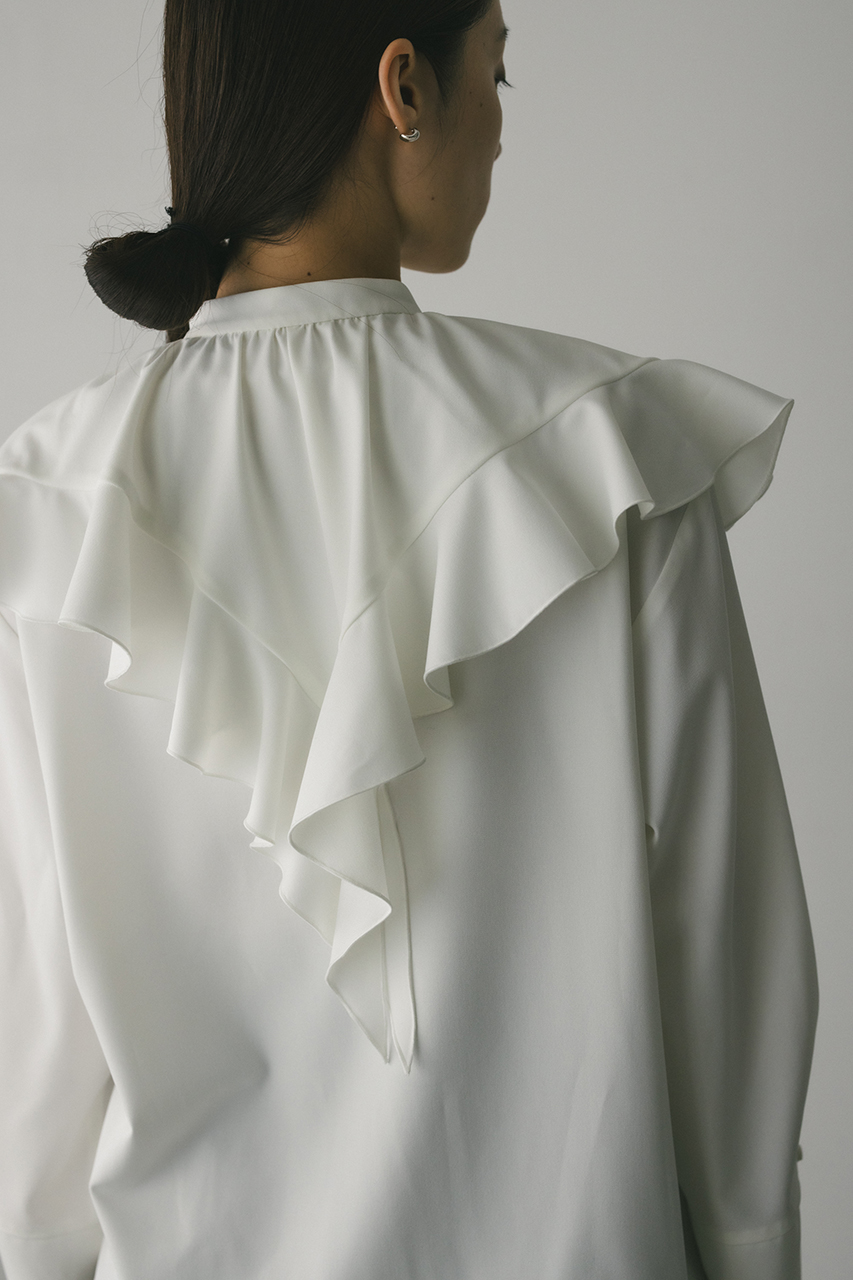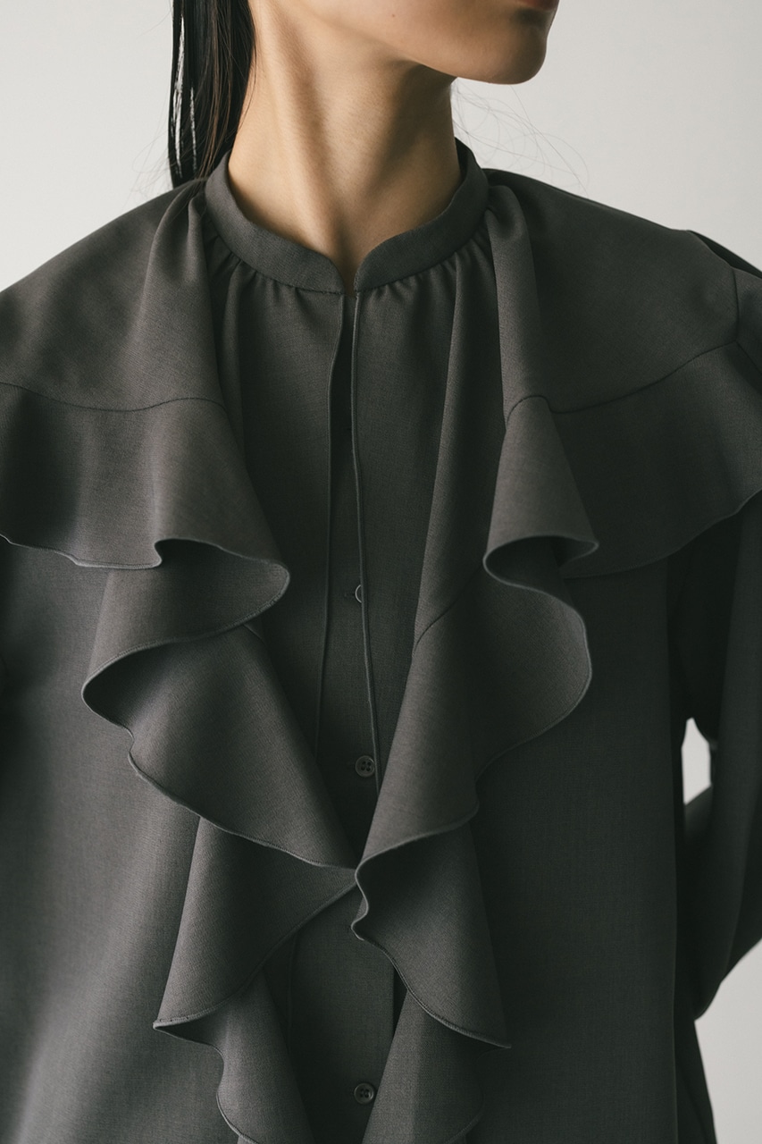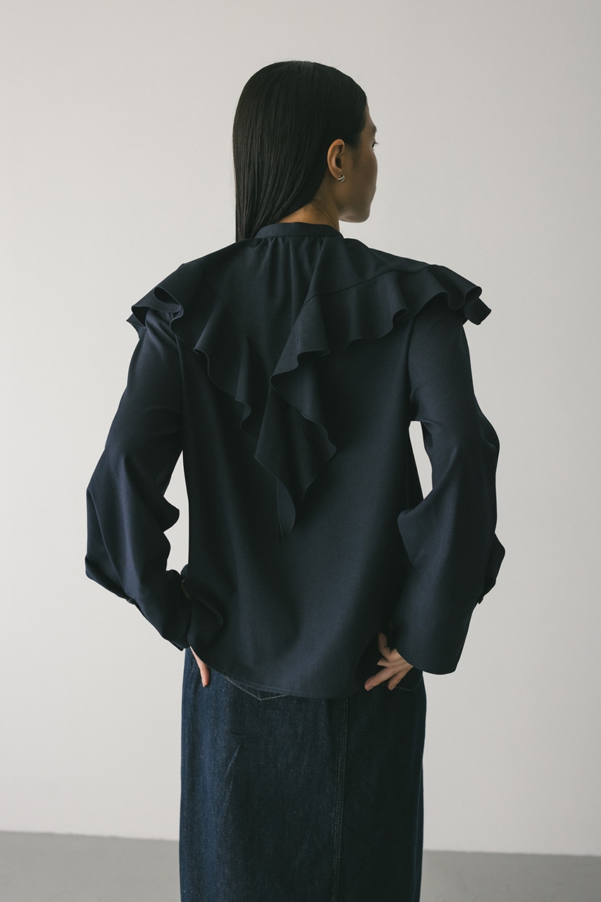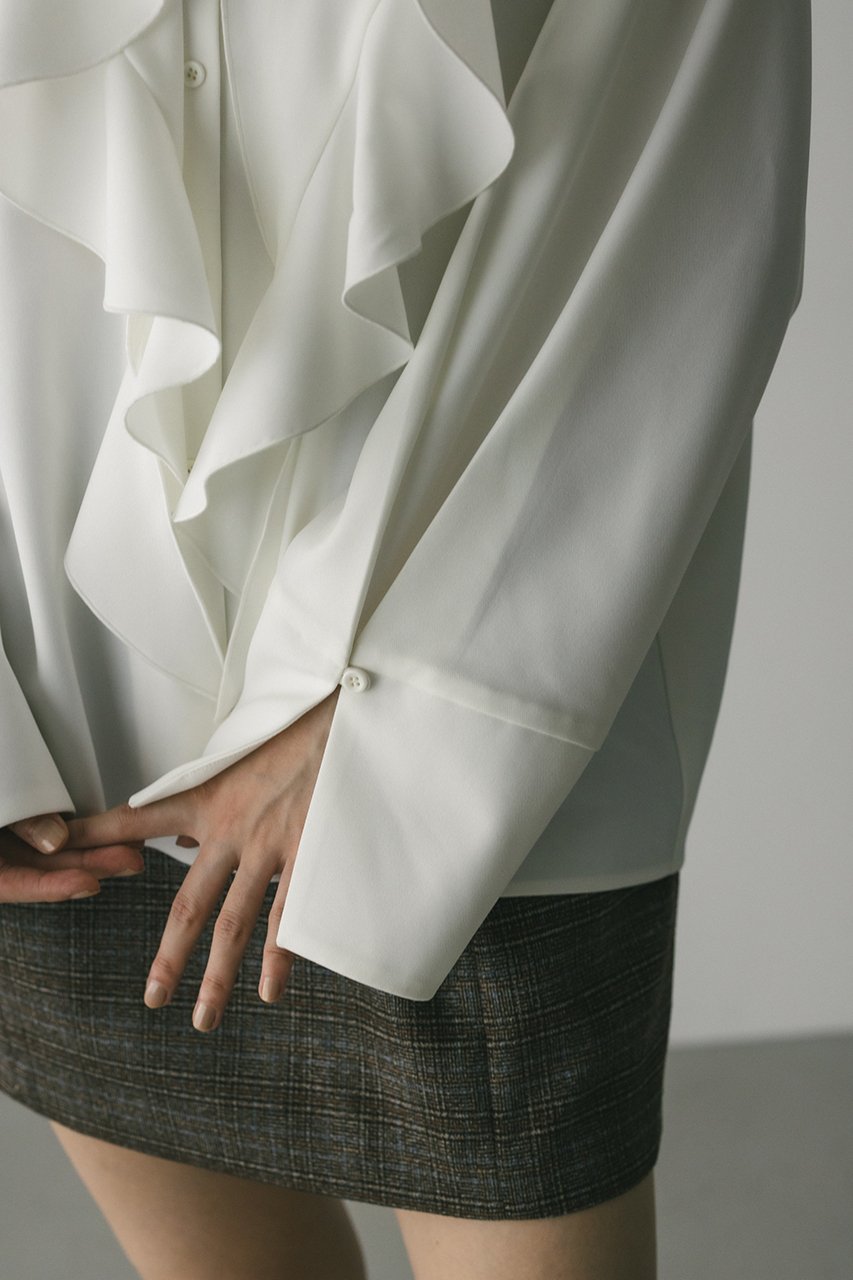 甘くなりすぎないようにスカーフヘムのようなフリルデザインに仕上げたブラウス。フリルはそのまま垂らしても、フロントで片結びしても可愛く決まります。抜け感のあるサイジングやワイドカフにこだわった一枚です。透け感なし、ストレッチややあり。