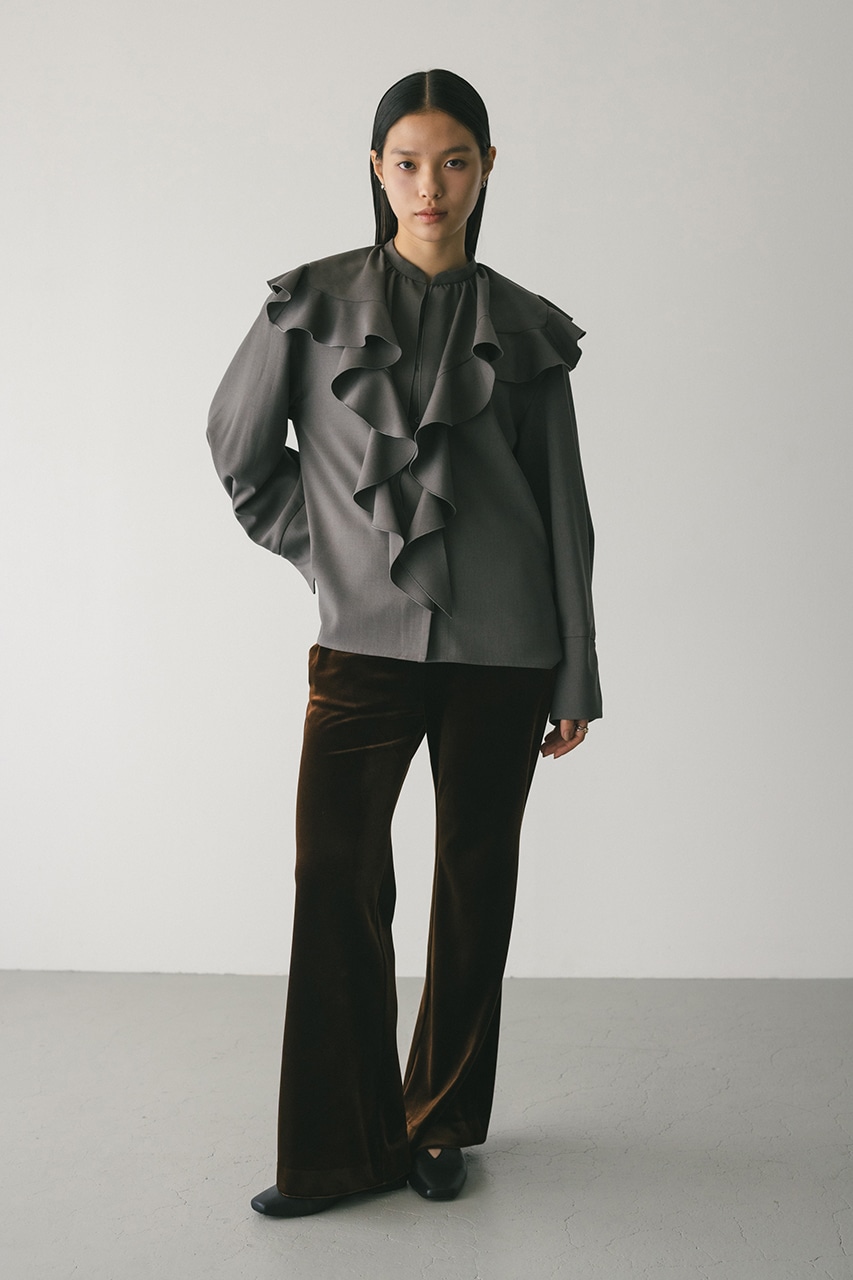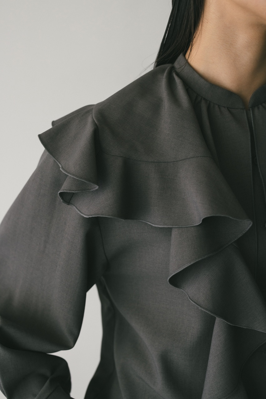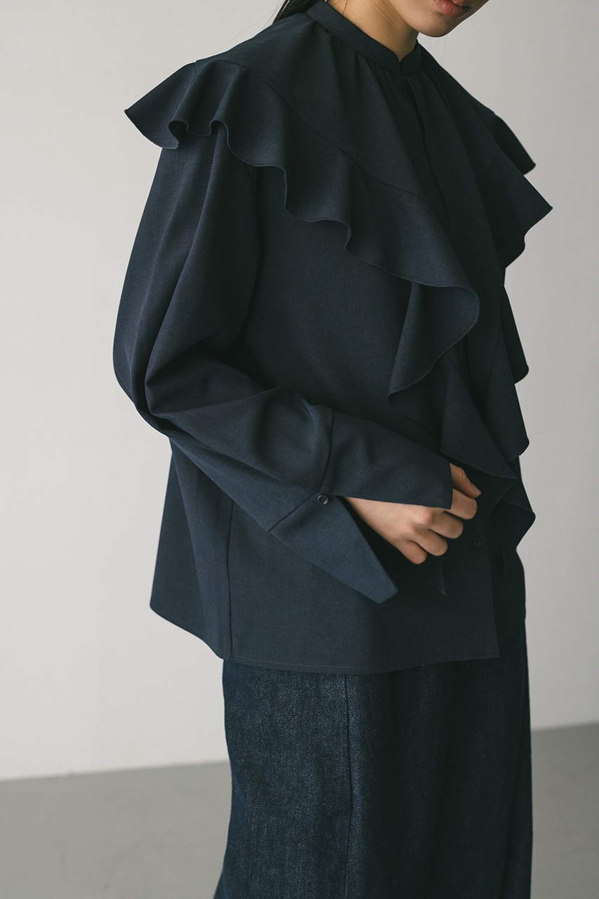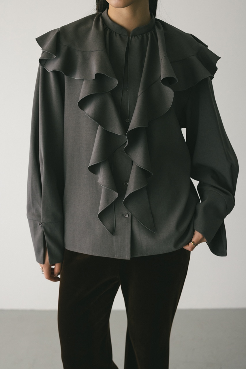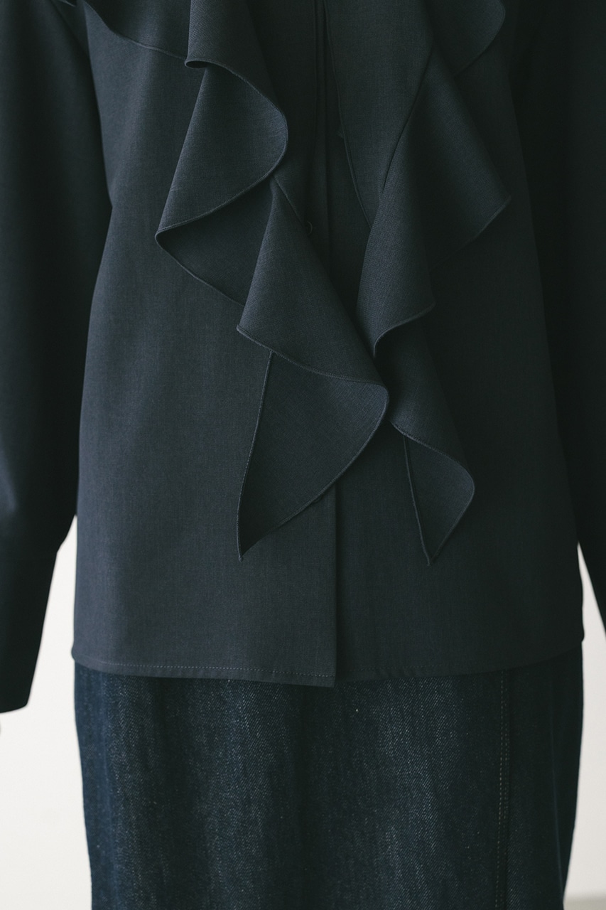 甘くなりすぎないようにスカーフヘムのようなフリルデザインに仕上げたブラウス。フリルはそのまま垂らしても、フロントで片結びしても可愛く決まります。抜け感のあるサイジングやワイドカフにこだわった一枚です。透け感なし、ストレッチややあり。