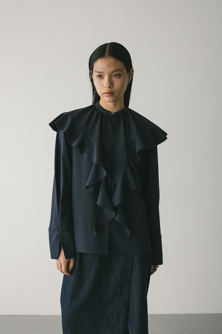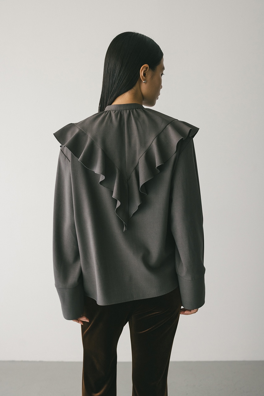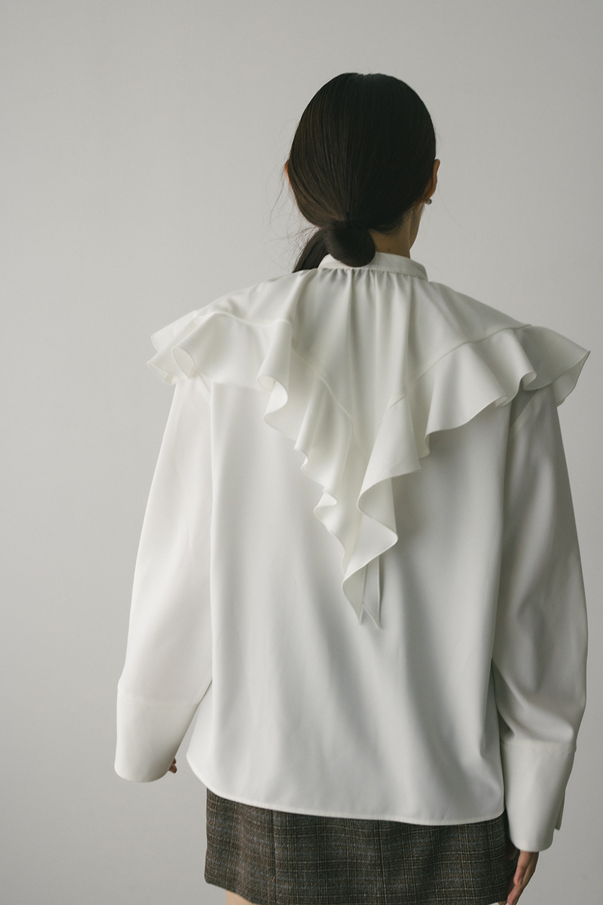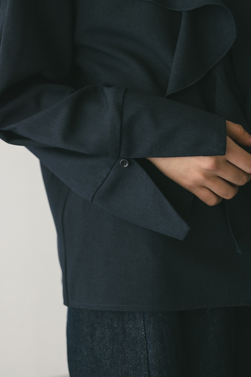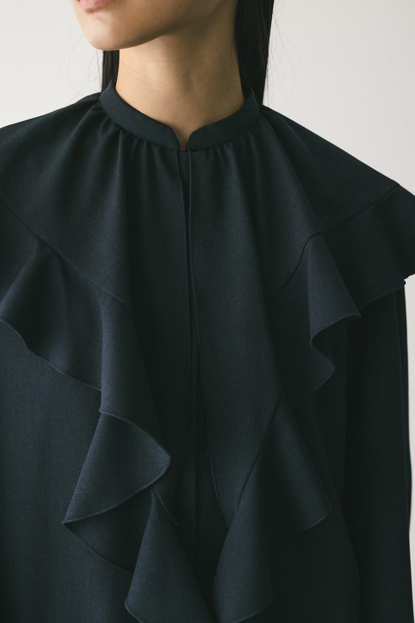 甘くなりすぎないようにスカーフヘムのようなフリルデザインに仕上げたブラウス。フリルはそのまま垂らしても、フロントで片結びしても可愛く決まります。抜け感のあるサイジングやワイドカフにこだわった一枚です。透け感なし、ストレッチややあり。
