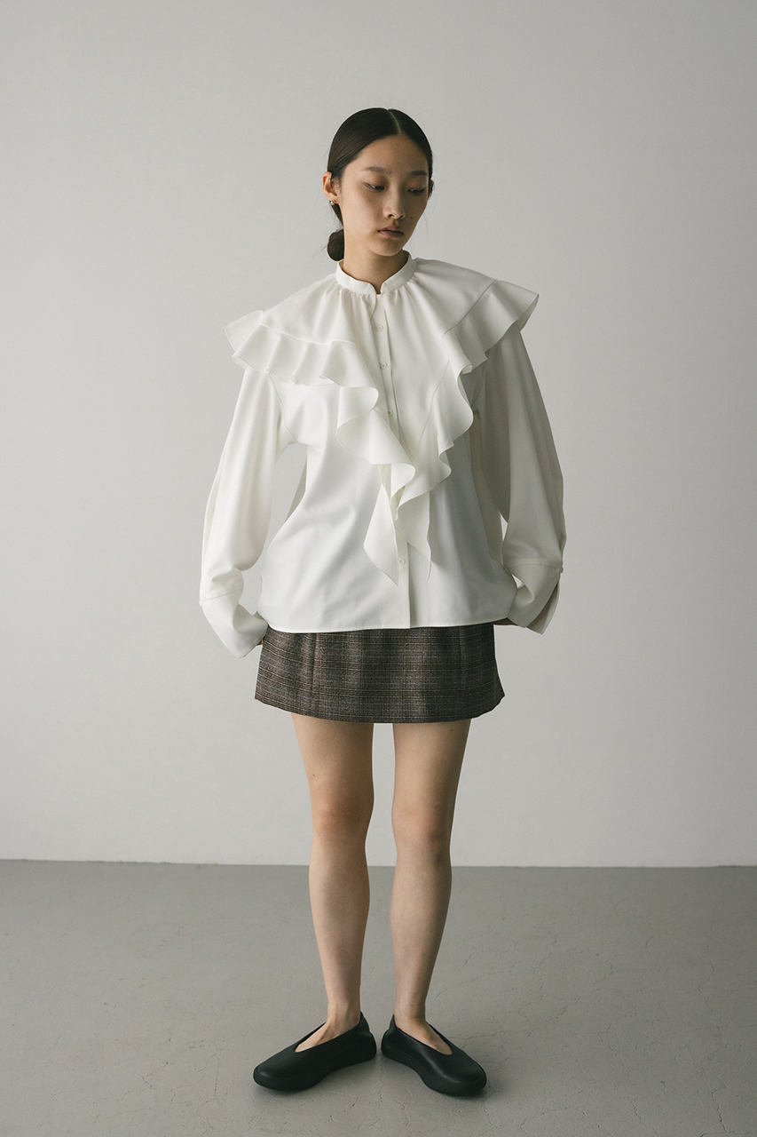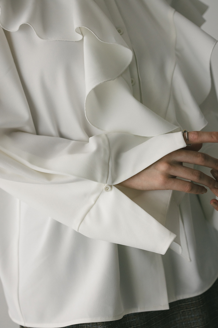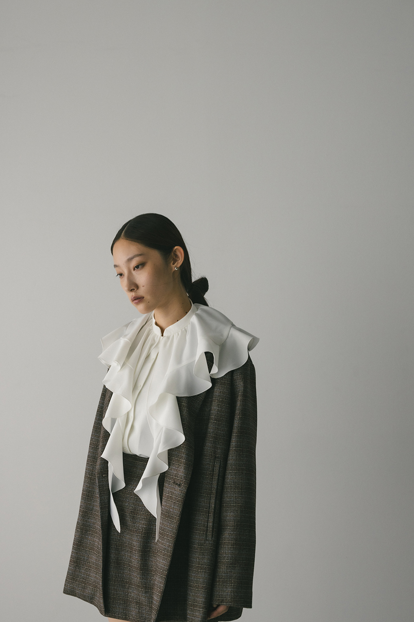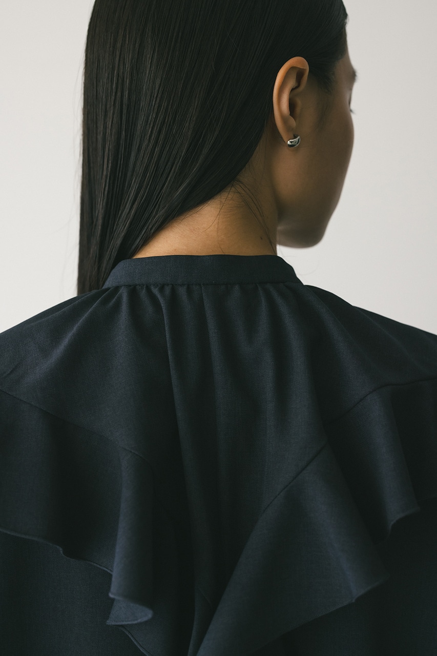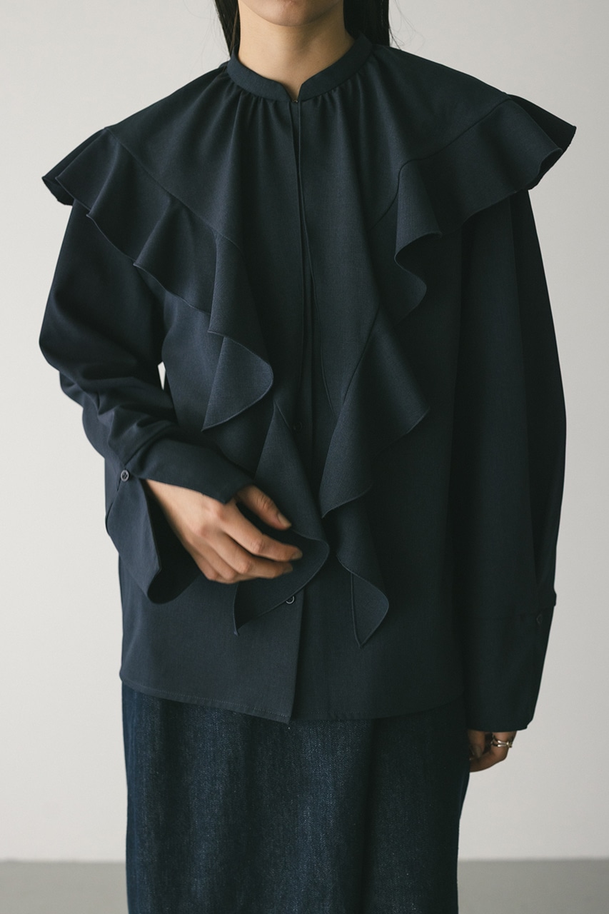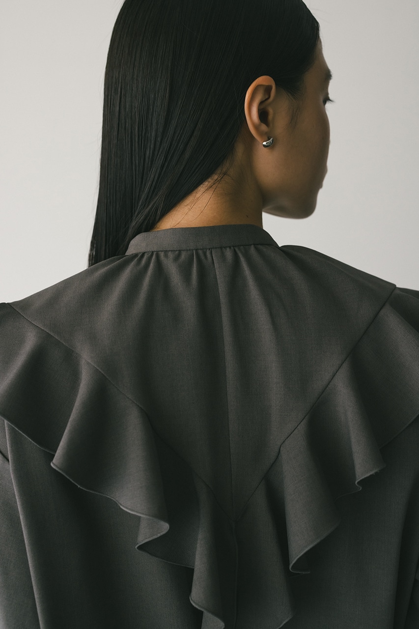 甘くなりすぎないようにスカーフヘムのようなフリルデザインに仕上げたブラウス。フリルはそのまま垂らしても、フロントで片結びしても可愛く決まります。抜け感のあるサイジングやワイドカフにこだわった一枚です。透け感なし、ストレッチややあり。