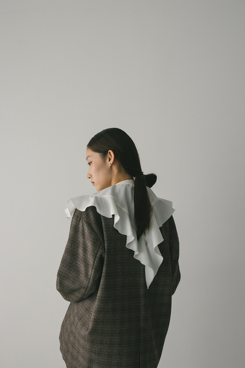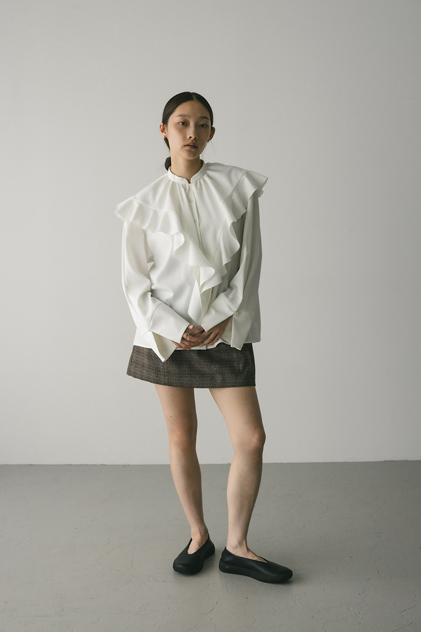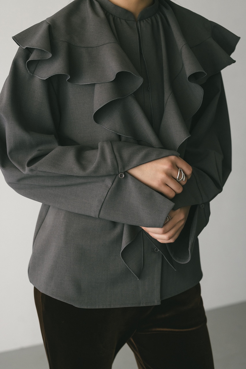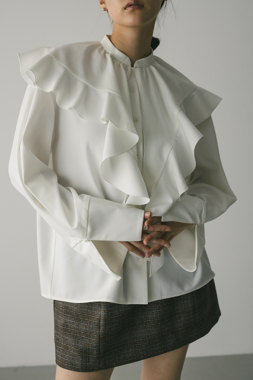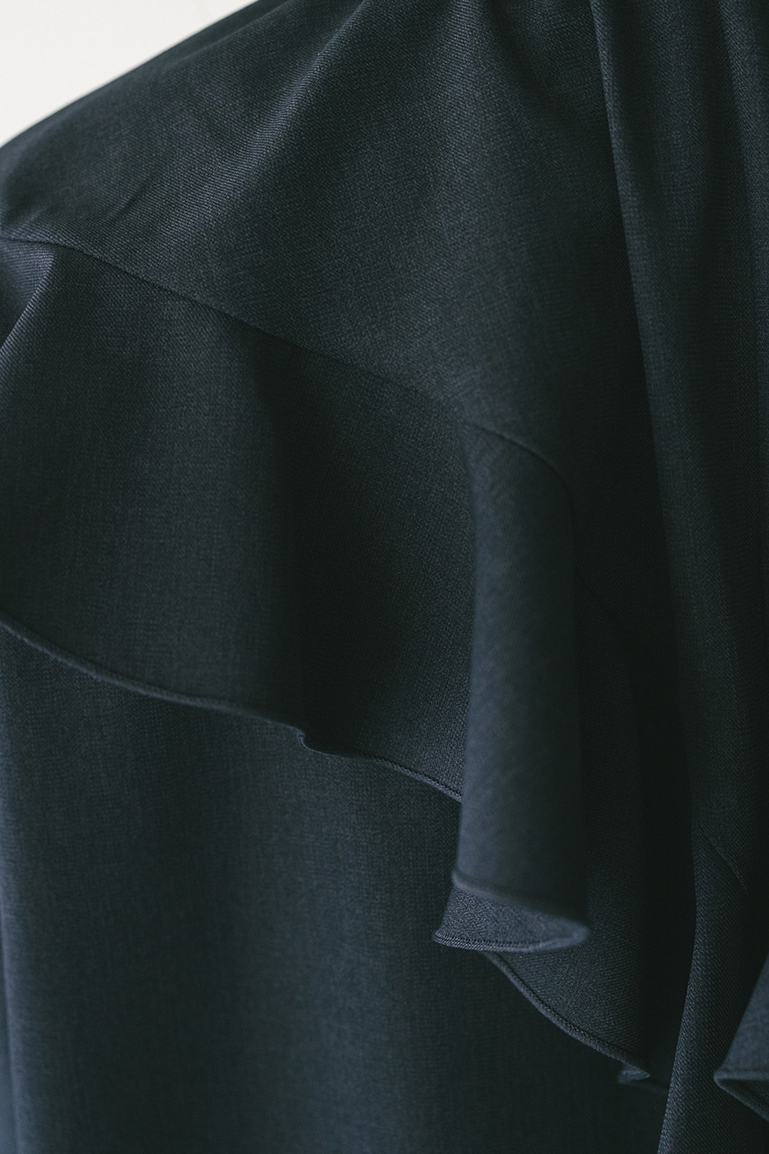 甘くなりすぎないようにスカーフヘムのようなフリルデザインに仕上げたブラウス。フリルはそのまま垂らしても、フロントで片結びしても可愛く決まります。抜け感のあるサイジングやワイドカフにこだわった一枚です。透け感なし、ストレッチややあり。