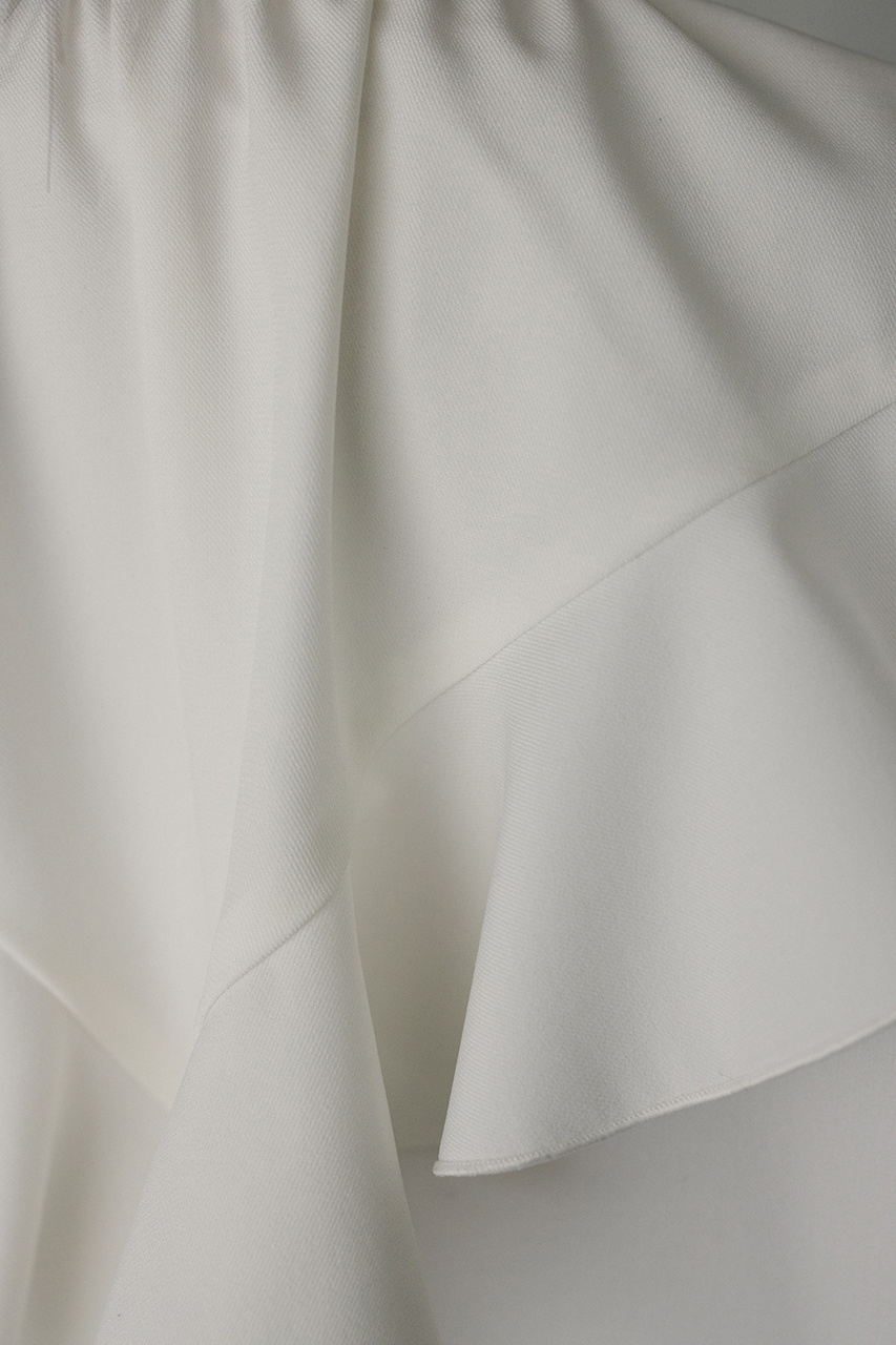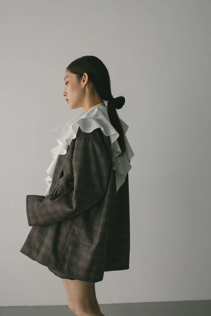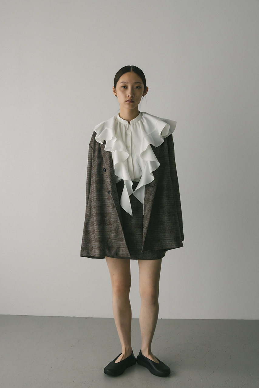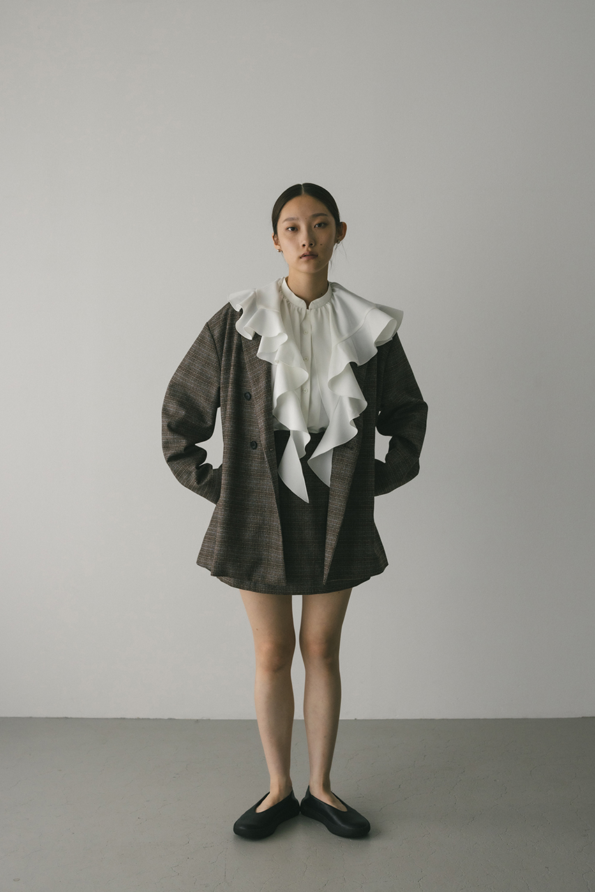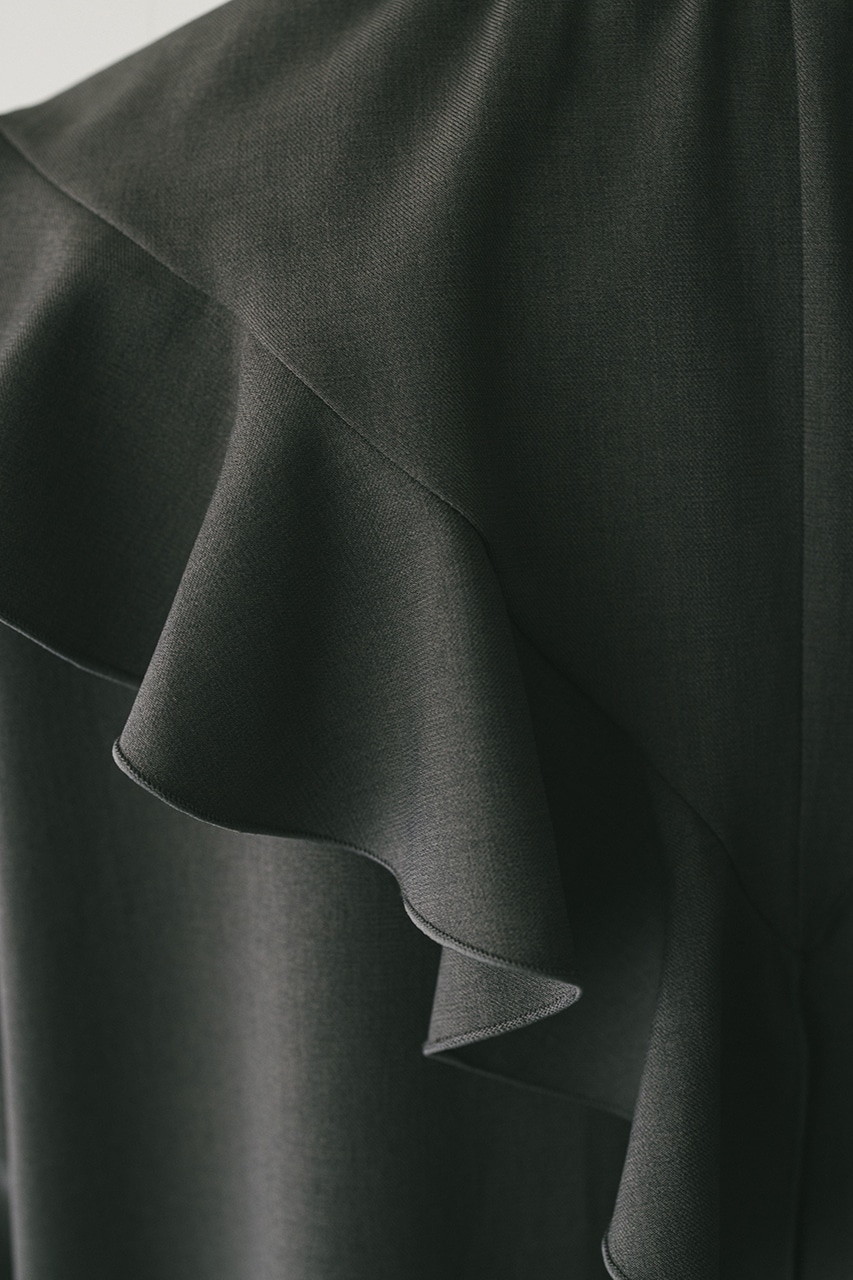 甘くなりすぎないようにスカーフヘムのようなフリルデザインに仕上げたブラウス。フリルはそのまま垂らしても、フロントで片結びしても可愛く決まります。抜け感のあるサイジングやワイドカフにこだわった一枚です。透け感なし、ストレッチややあり。