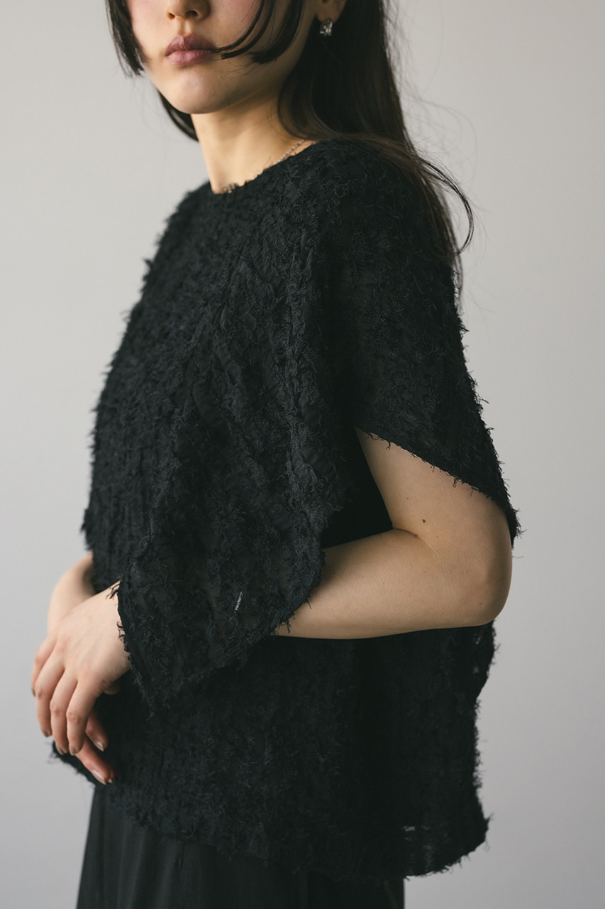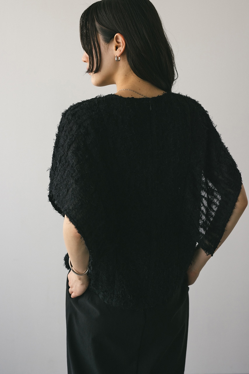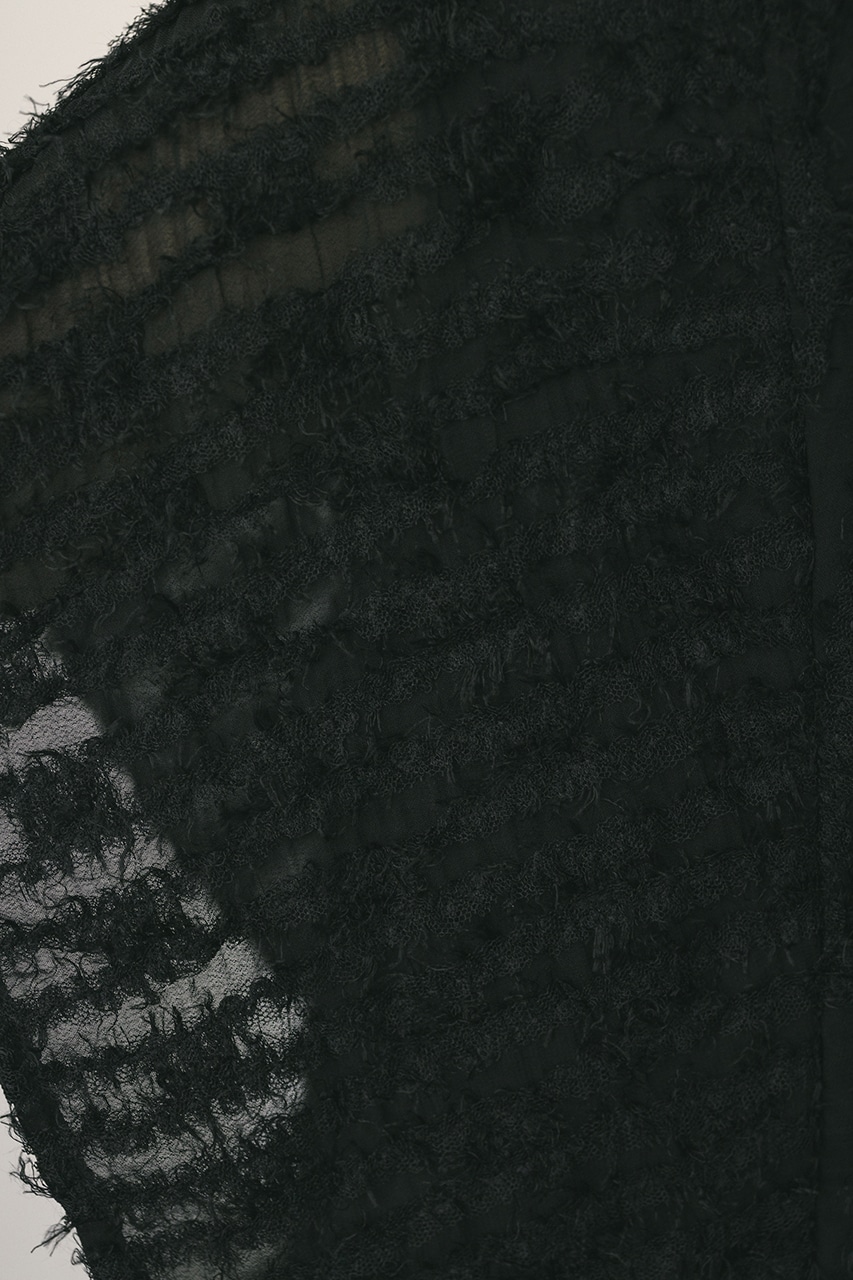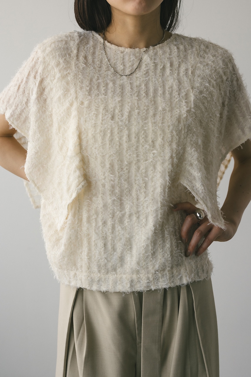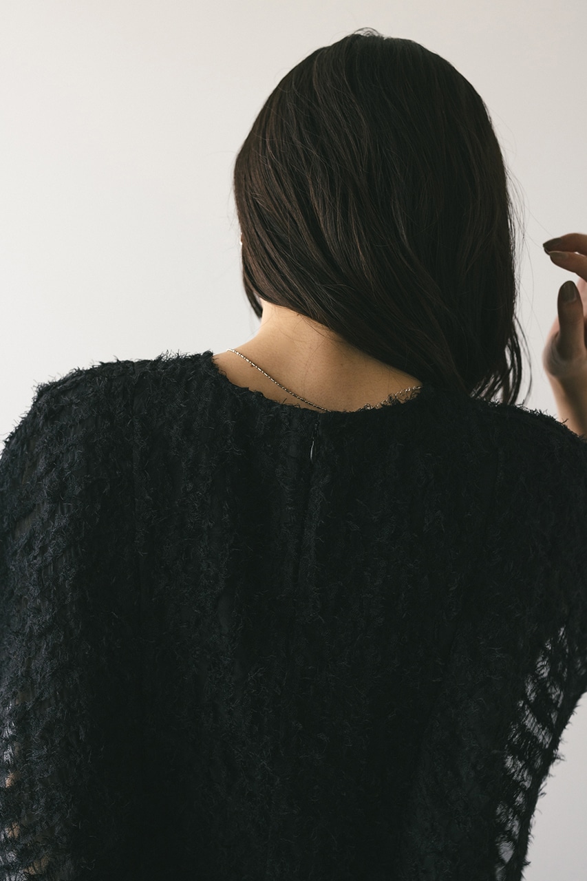程よい透け感のシアー素材にメッシュフリンジシャーリングステッチを施した生地で仕立てたデザインブラウス。大きなショルダーパネルが華やかな印象にしてくれる映える一枚。肩から斜めに入れたパネルラインが身体を華奢にみせてくれます。見頃は裏地付きでインナーを気にせずに着用していただけます。透け感袖部分あり、ストレッチなし。