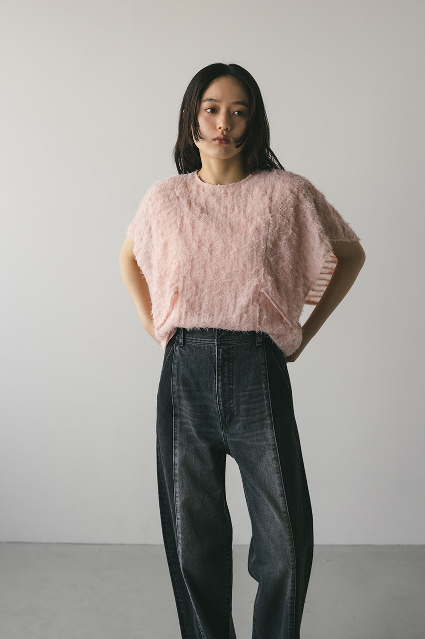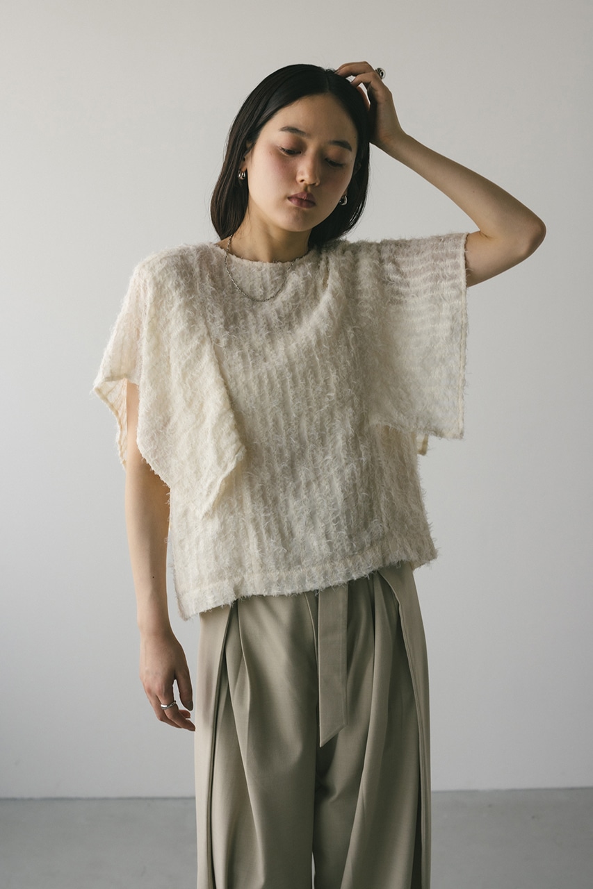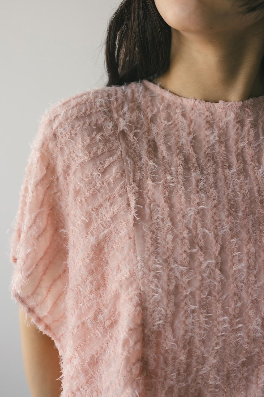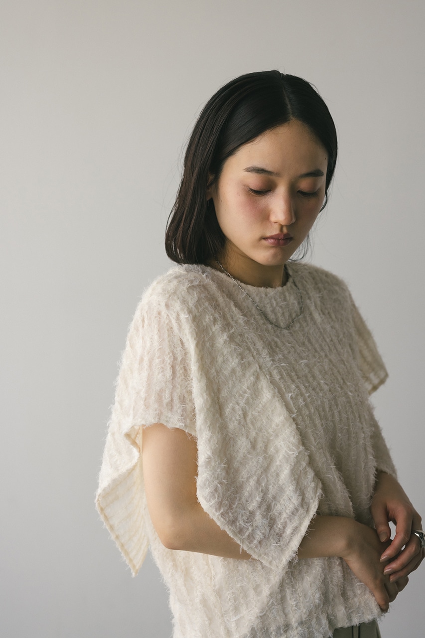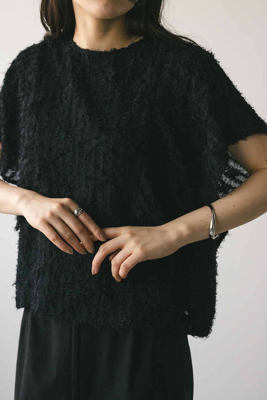 程よい透け感のシアー素材にメッシュフリンジシャーリングステッチを施した生地で仕立てたデザインブラウス。大きなショルダーパネルが華やかな印象にしてくれる映える一枚。肩から斜めに入れたパネルラインが身体を華奢にみせてくれます。見頃は裏地付きでインナーを気にせずに着用していただけます。透け感袖部分あり、ストレッチなし。