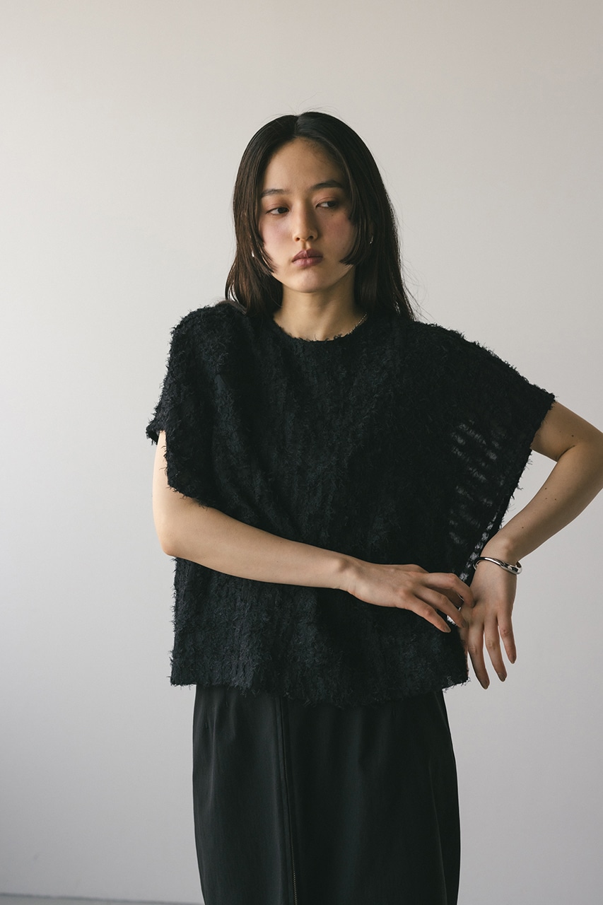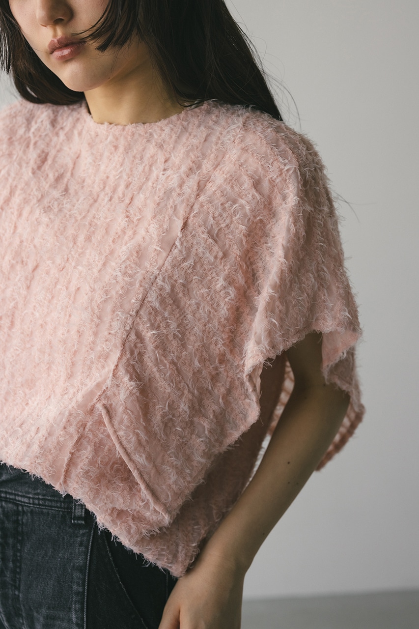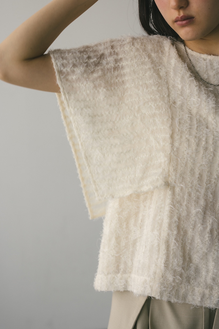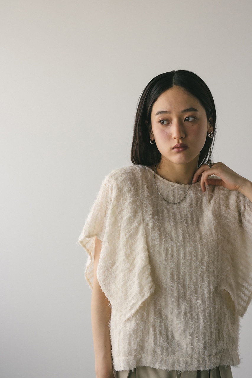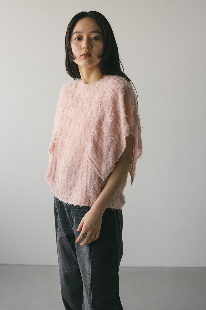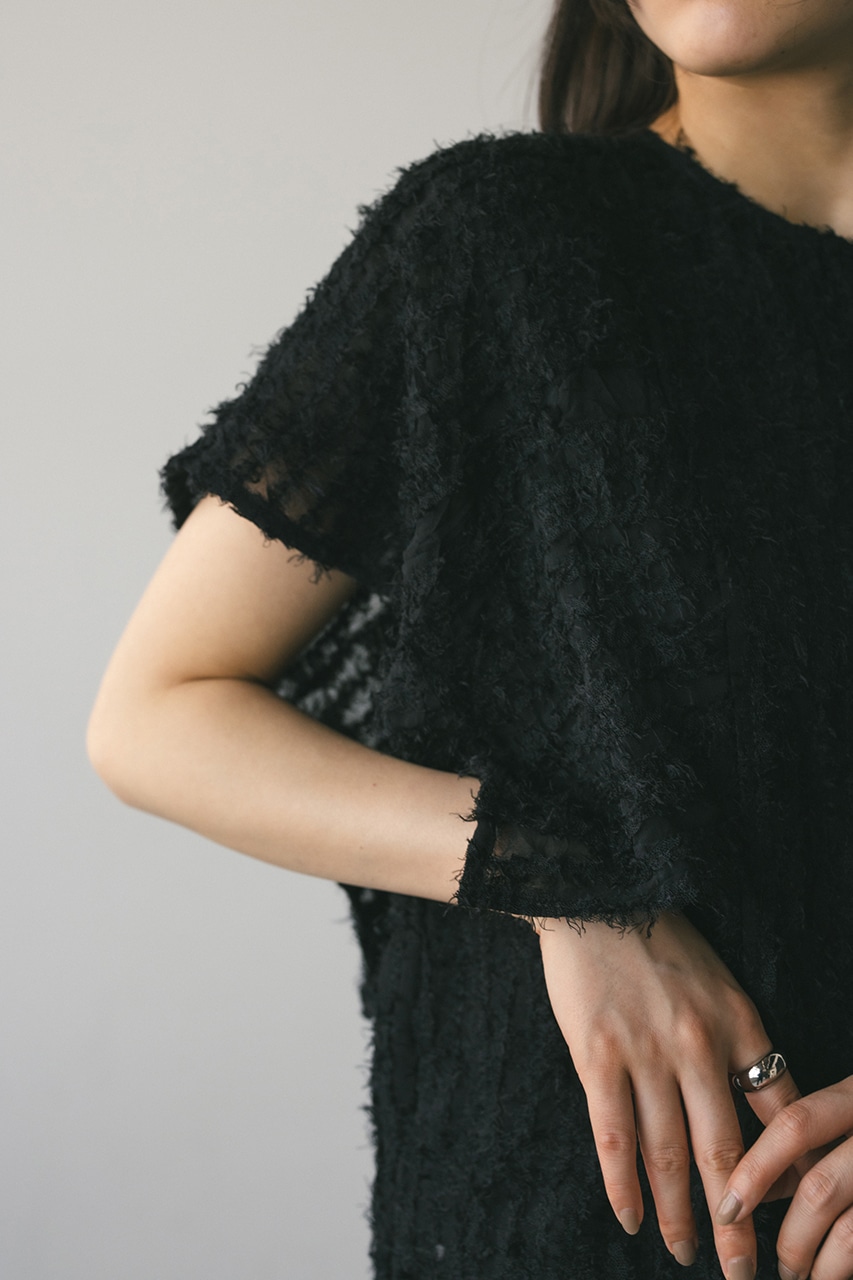 程よい透け感のシアー素材にメッシュフリンジシャーリングステッチを施した生地で仕立てたデザインブラウス。大きなショルダーパネルが華やかな印象にしてくれる映える一枚。肩から斜めに入れたパネルラインが身体を華奢にみせてくれます。見頃は裏地付きでインナーを気にせずに着用していただけます。透け感袖部分あり、ストレッチなし。
