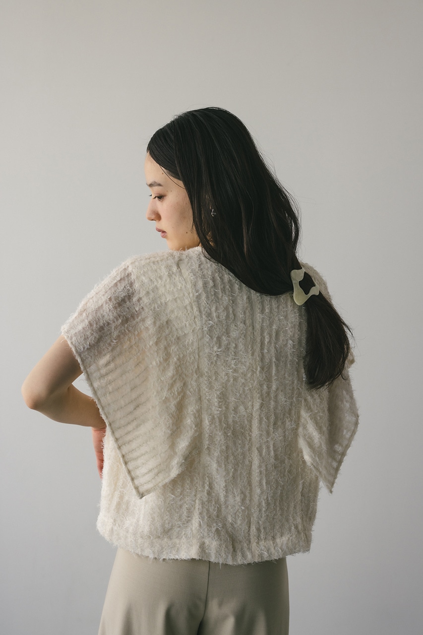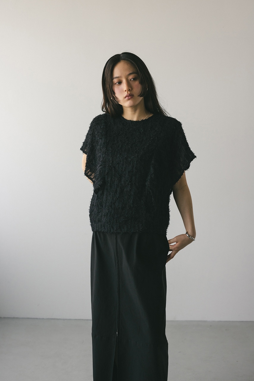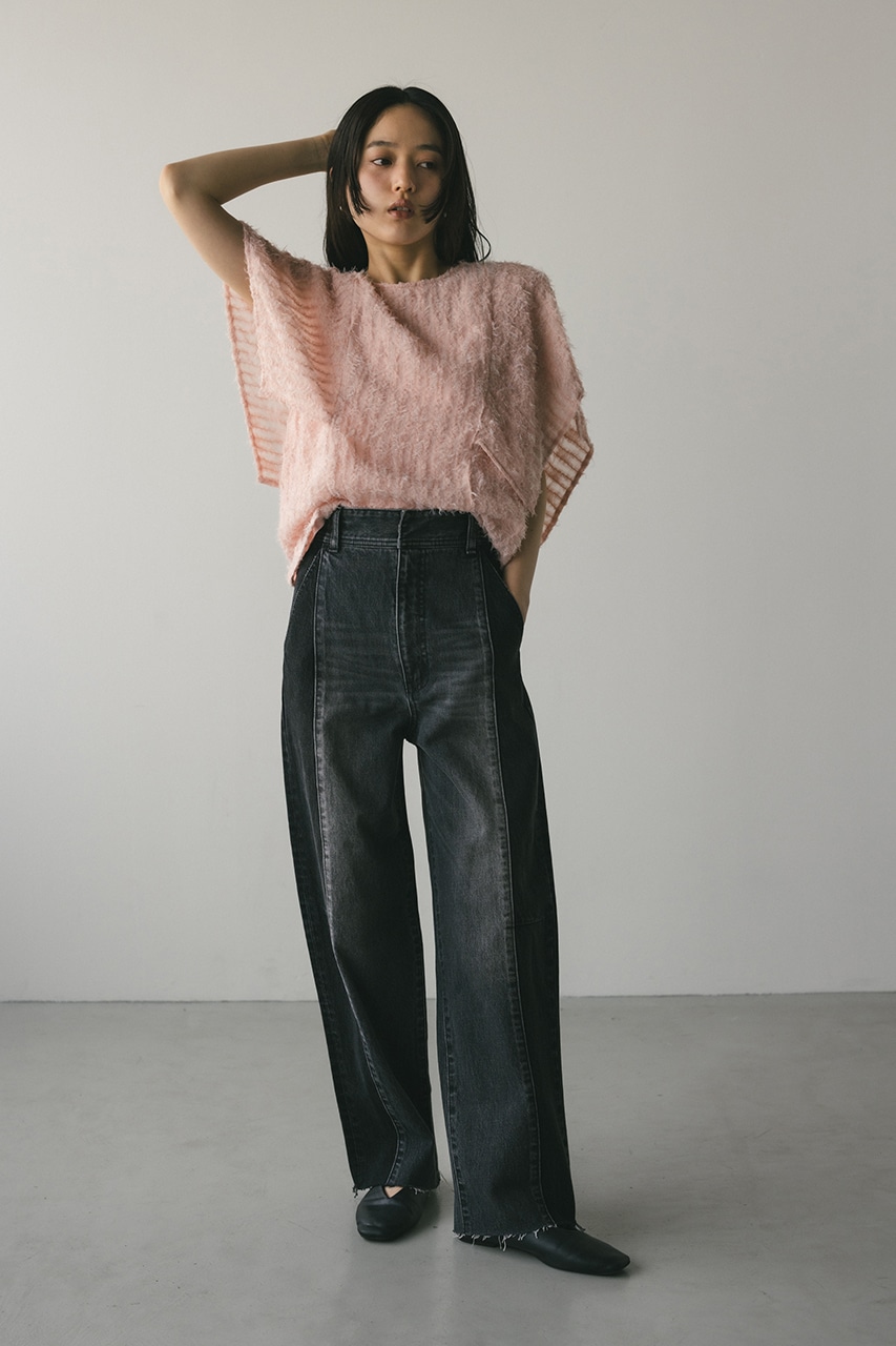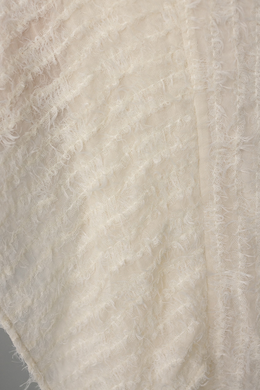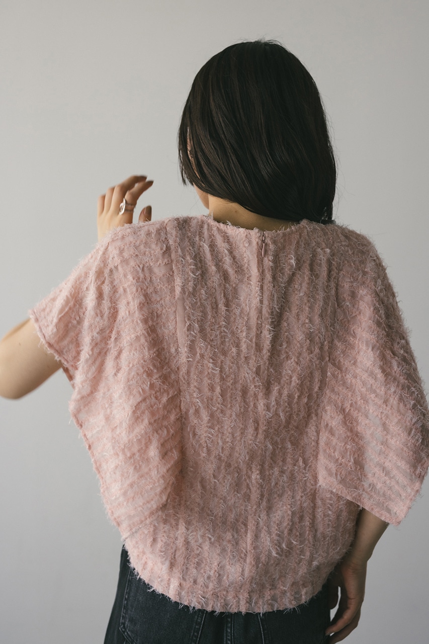 程よい透け感のシアー素材にメッシュフリンジシャーリングステッチを施した生地で仕立てたデザインブラウス。大きなショルダーパネルが華やかな印象にしてくれる映える一枚。肩から斜めに入れたパネルラインが身体を華奢にみせてくれます。見頃は裏地付きでインナーを気にせずに着用していただけます。透け感袖部分あり、ストレッチなし。